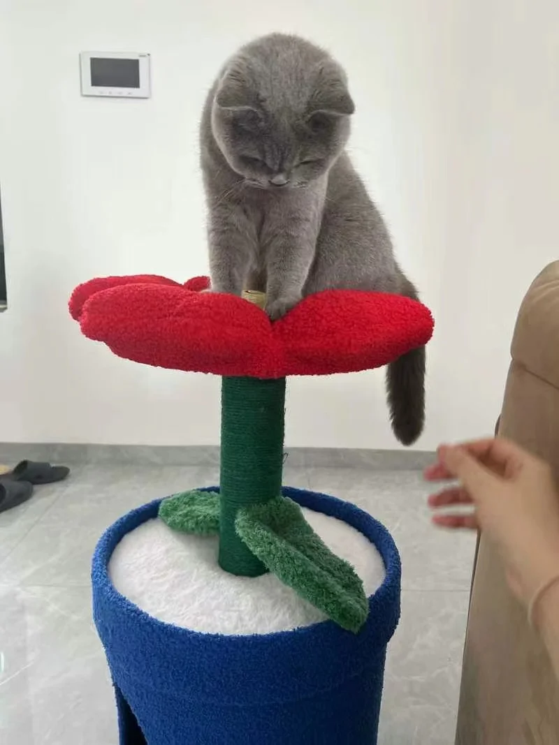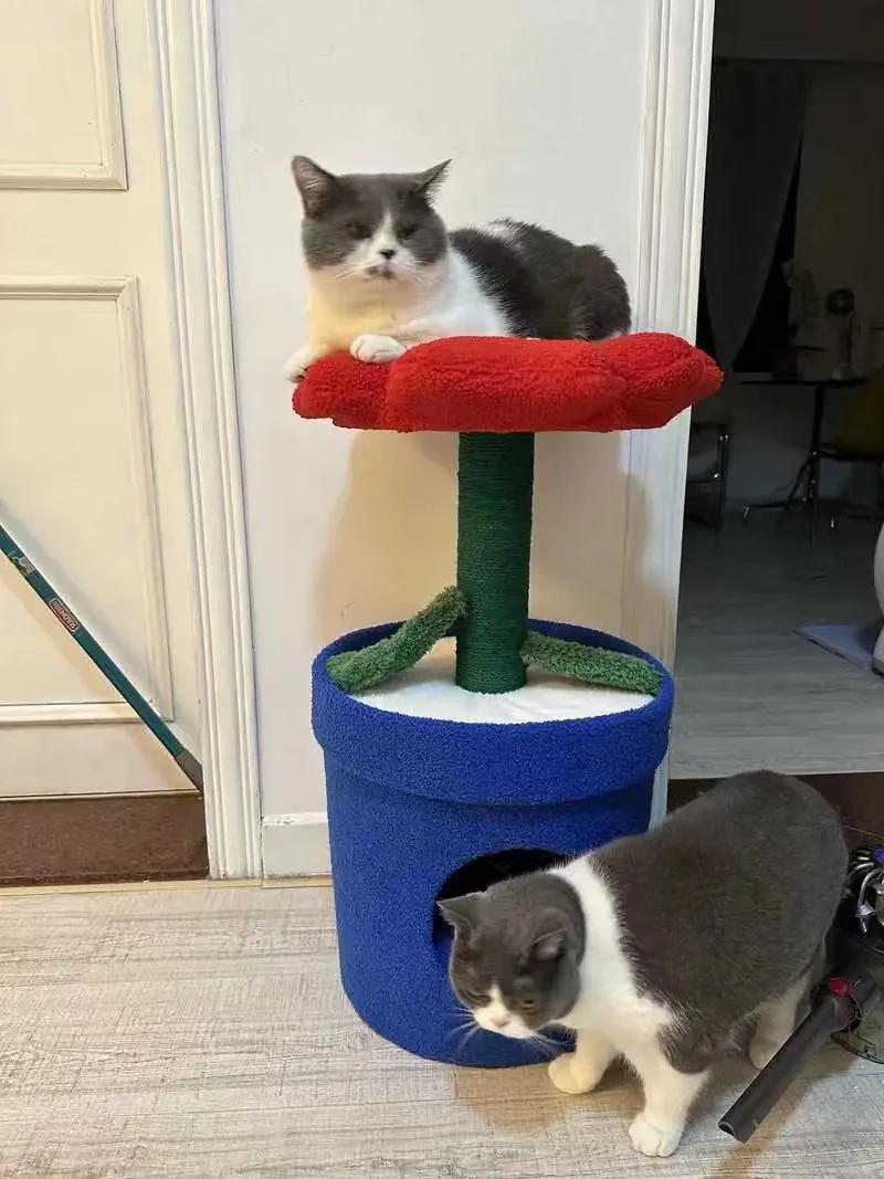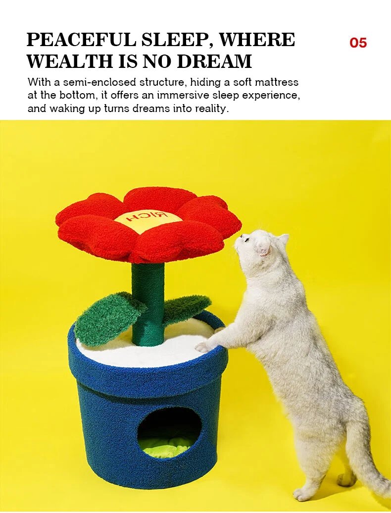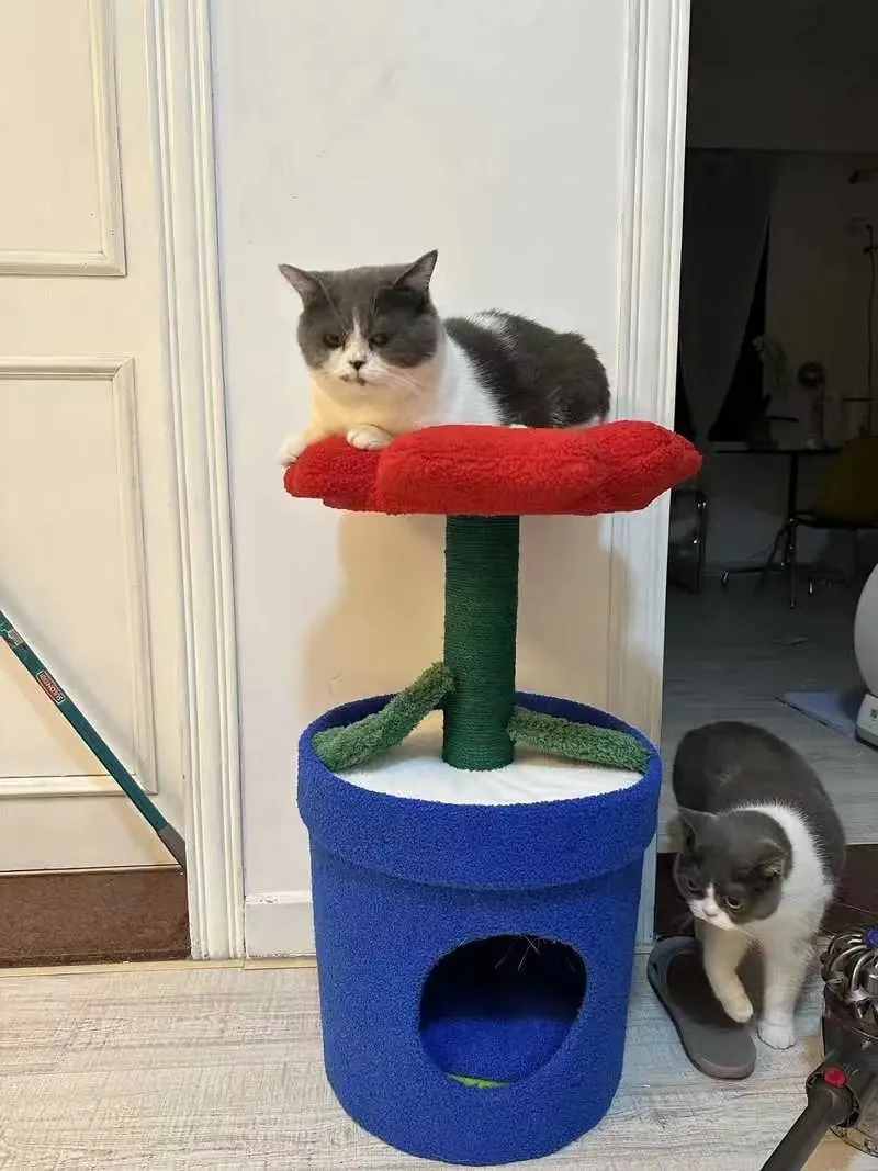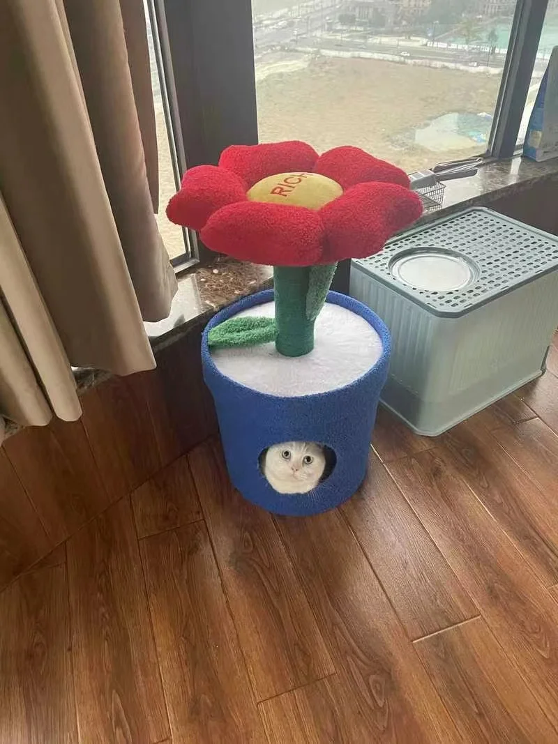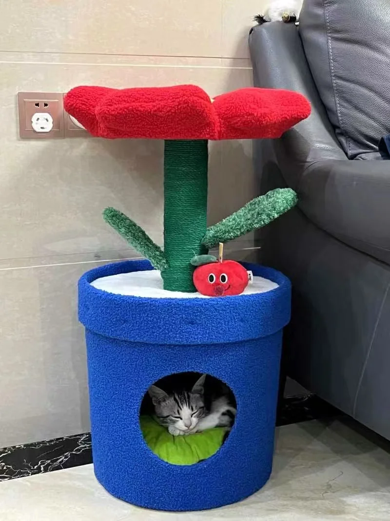 Árbol para gatos en maceta con flores rojas y cama para gatos integrada debajo del árbol para gatos de tamaño mediano (adecuado para gatos menores de 15 libras)