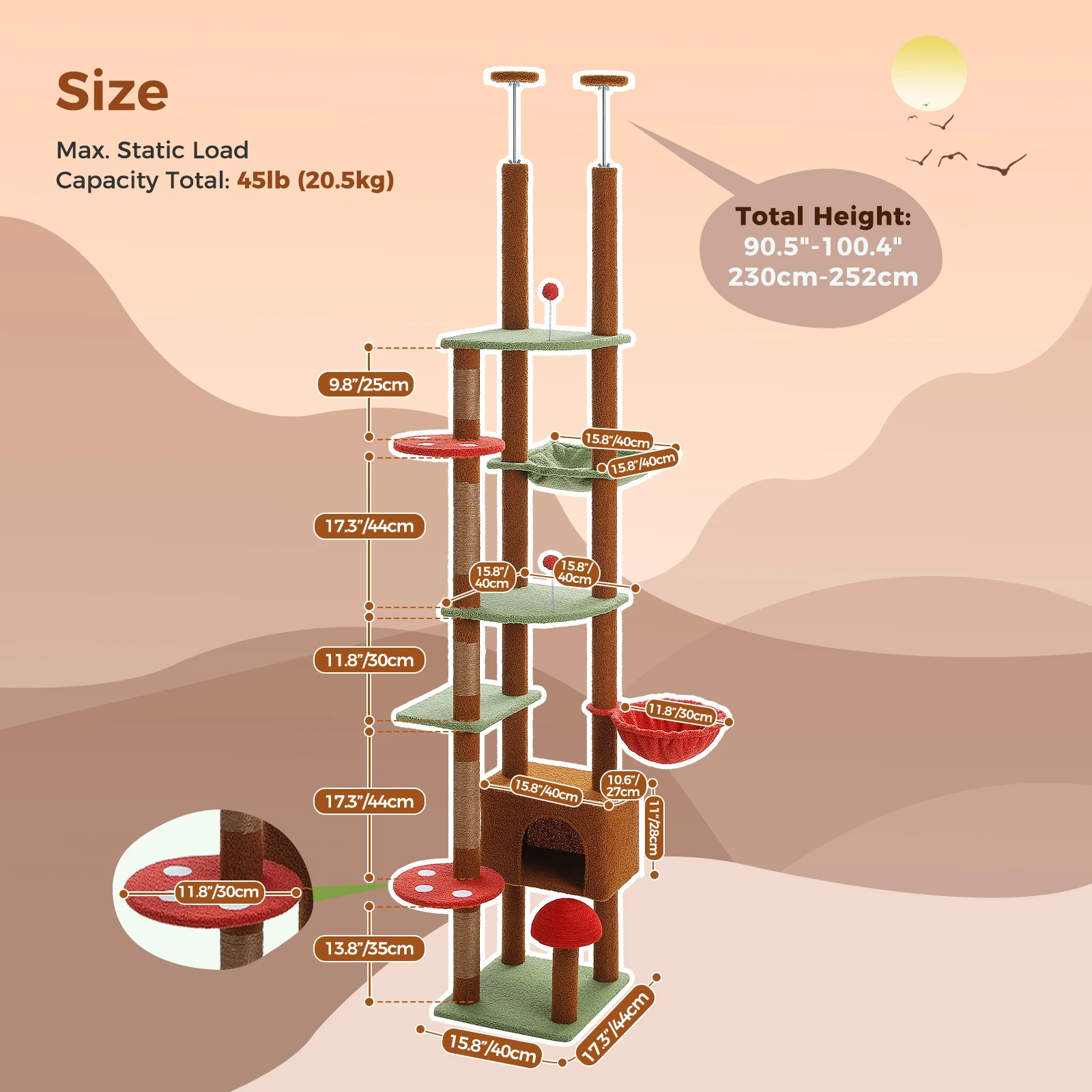 Para gatos grandes y enérgicos:Si bien hay una hamaca para gatos colgante de gran tamaño y una casa para gatos grande, este árbol para gatos desde el piso hasta el techo tiene un total de 7 niveles para que sus hijos enérgicos salten.Se acerca perfectamente con sus instintos naturales.Los accesorios utilizados en el árbol para gatos están diseñados para ser reemplazables, lo que facilita el intercambio de piezas y prolonga la vida útil del árbol para gatos.