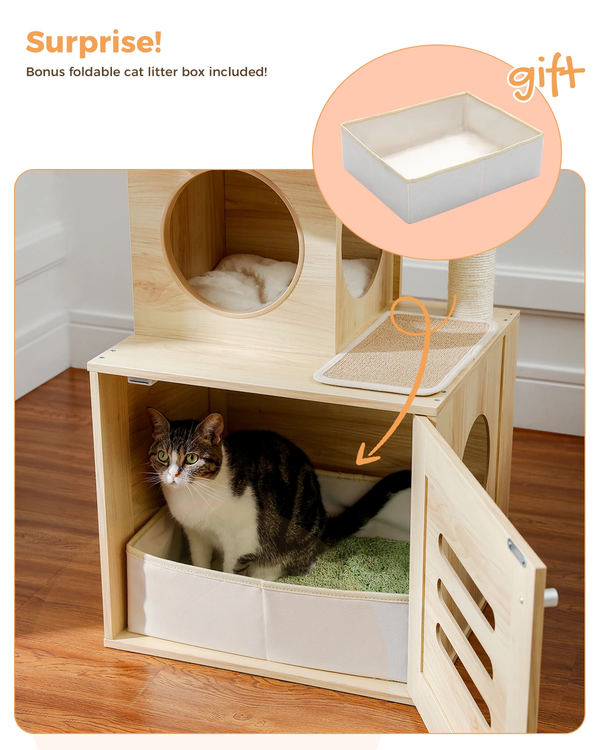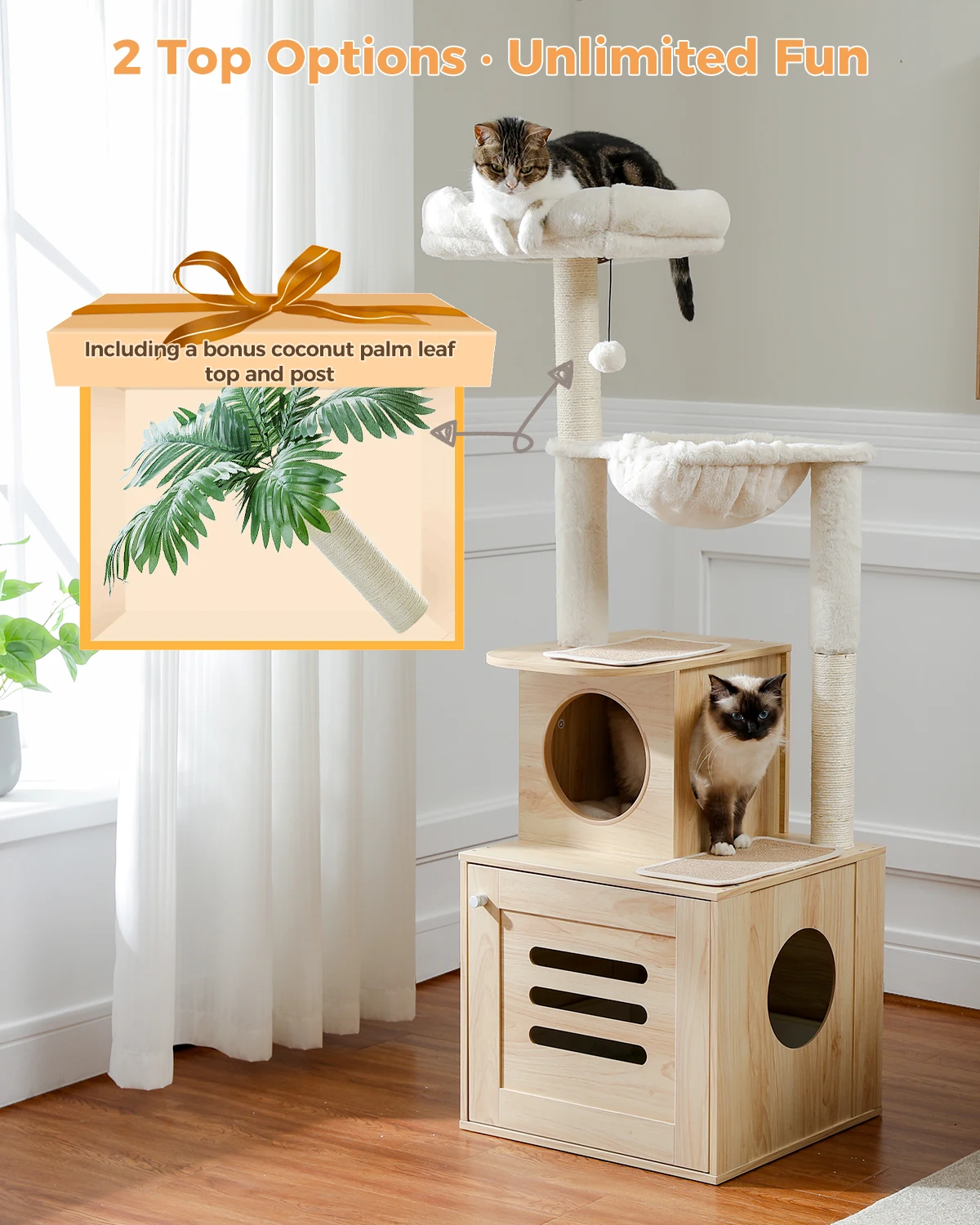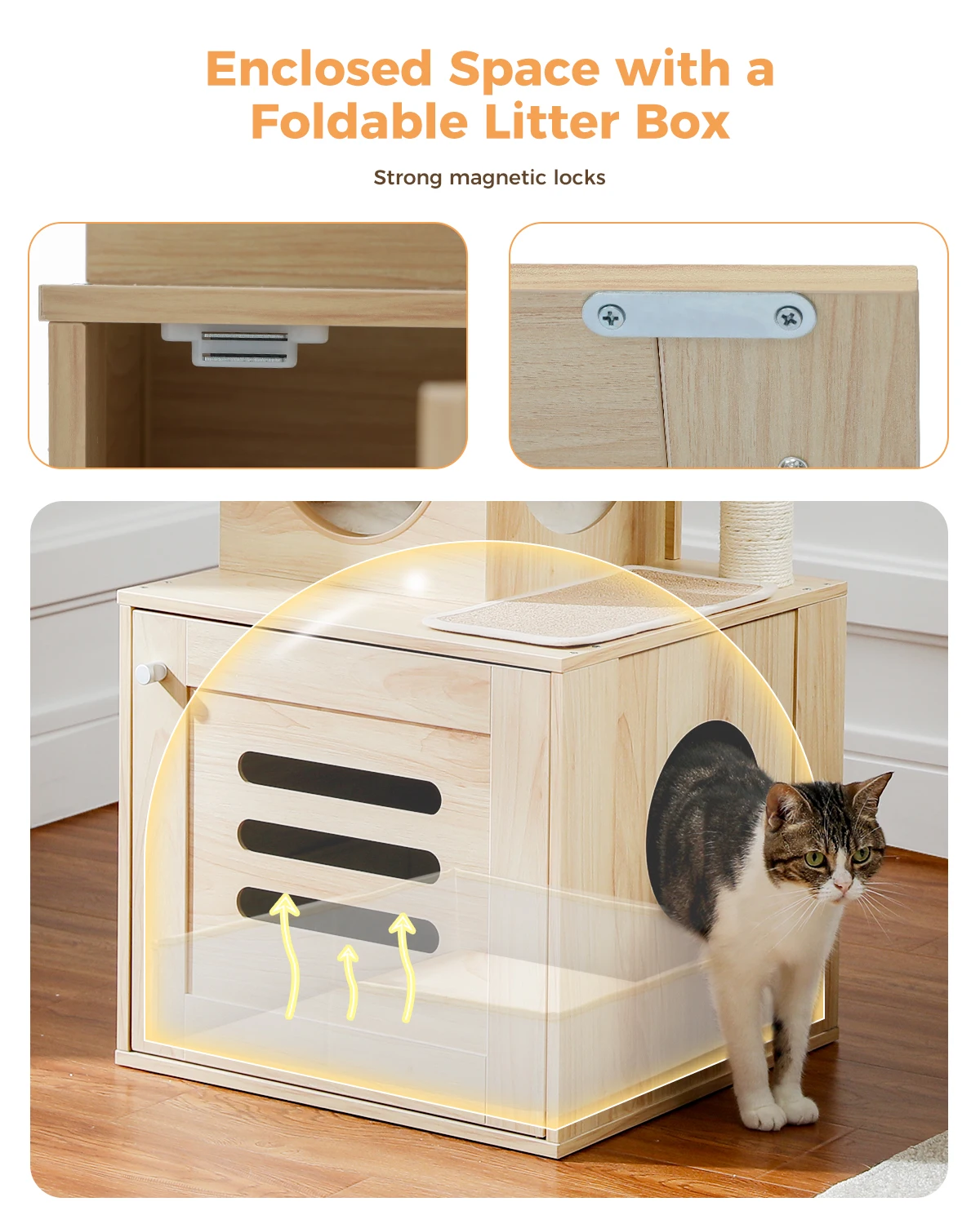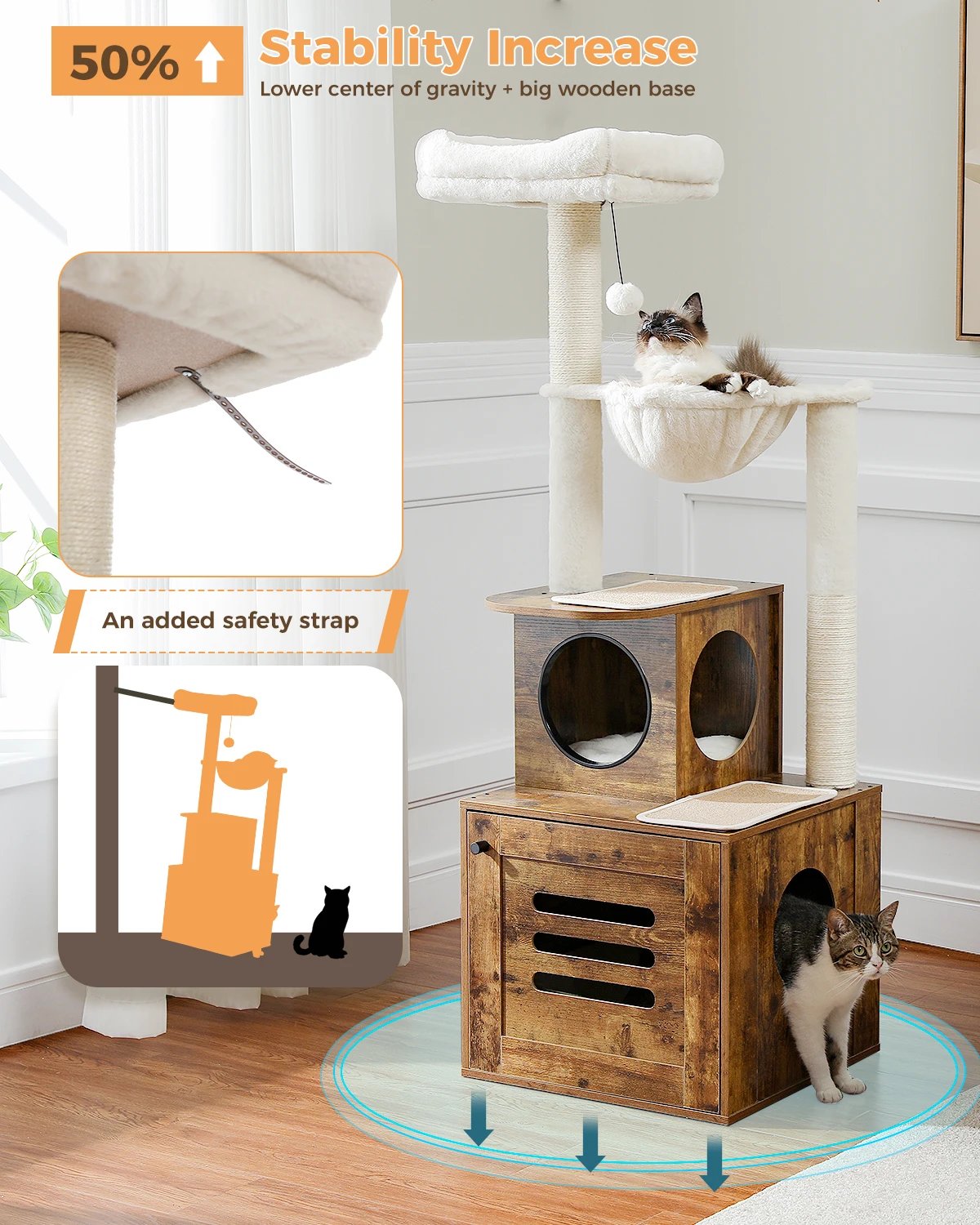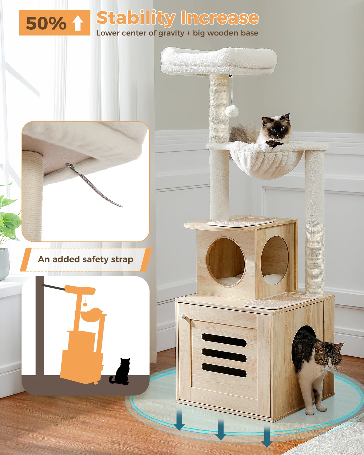 Árbol de madera para gatos H141CM con caja de arena para gatos, torre grande para gatos con Hamaca, poste rascador para gatos, accesorios para gatos, juguetes para gatos
