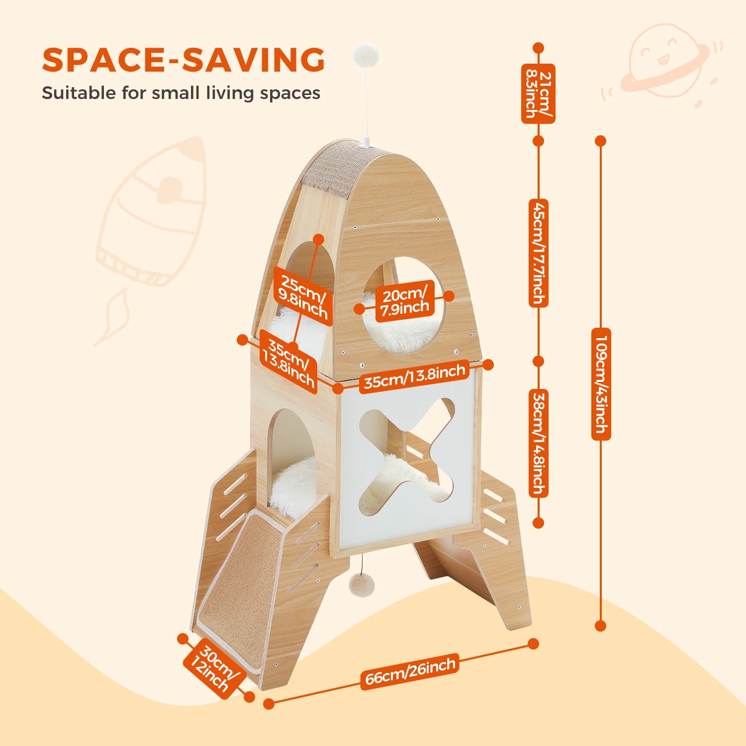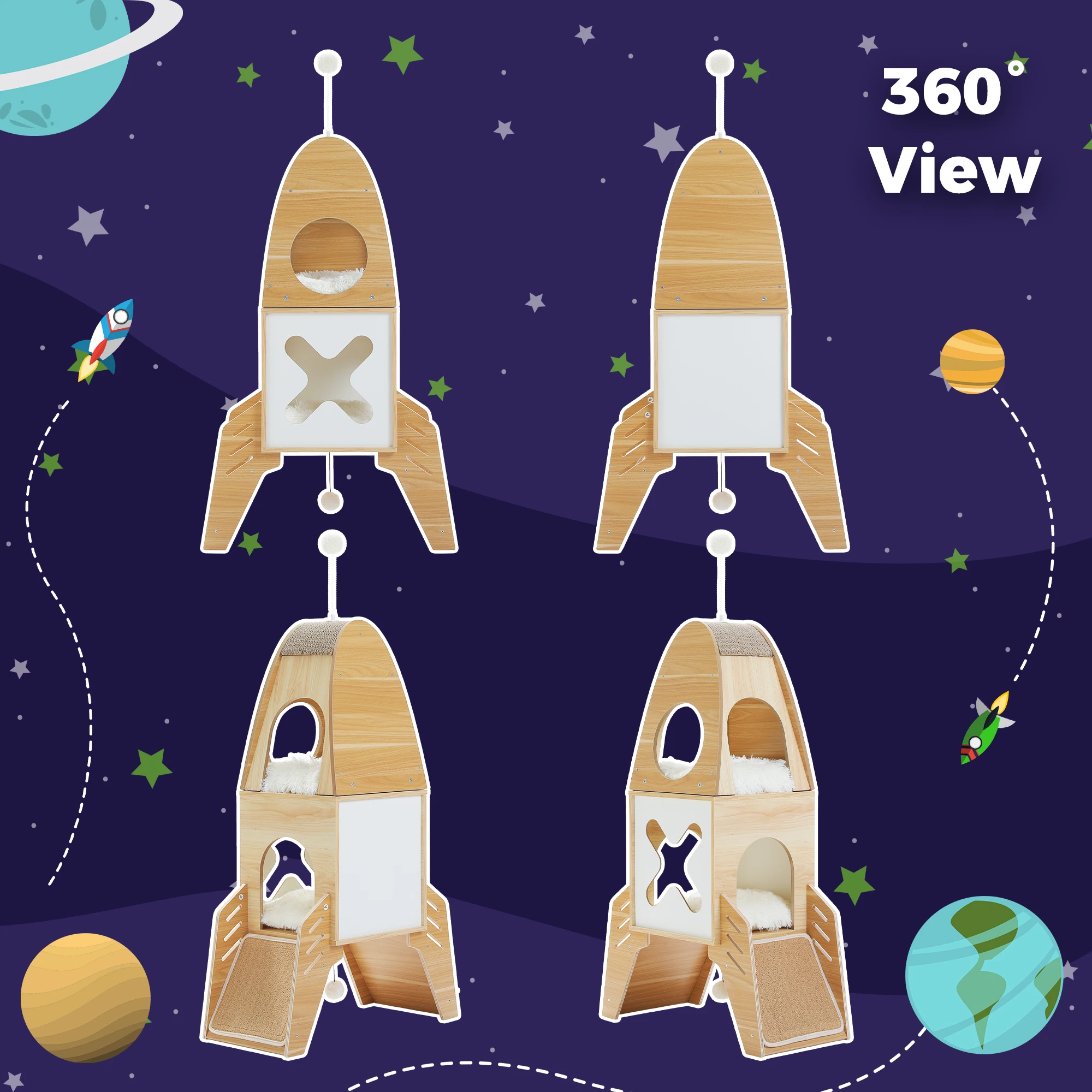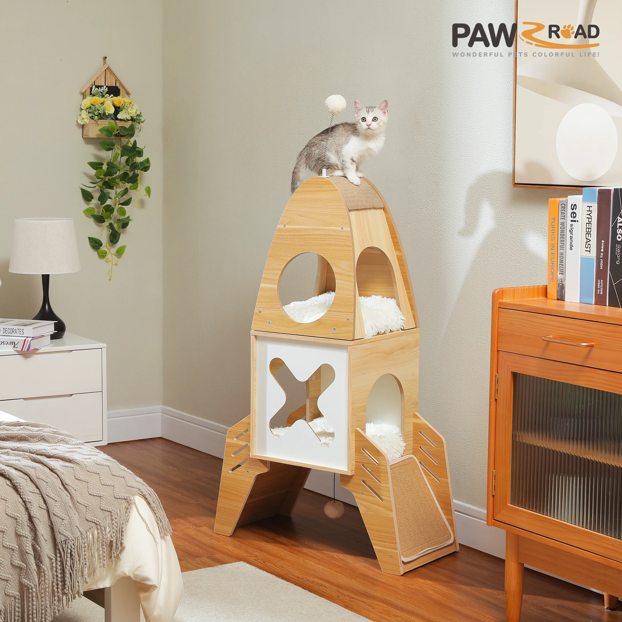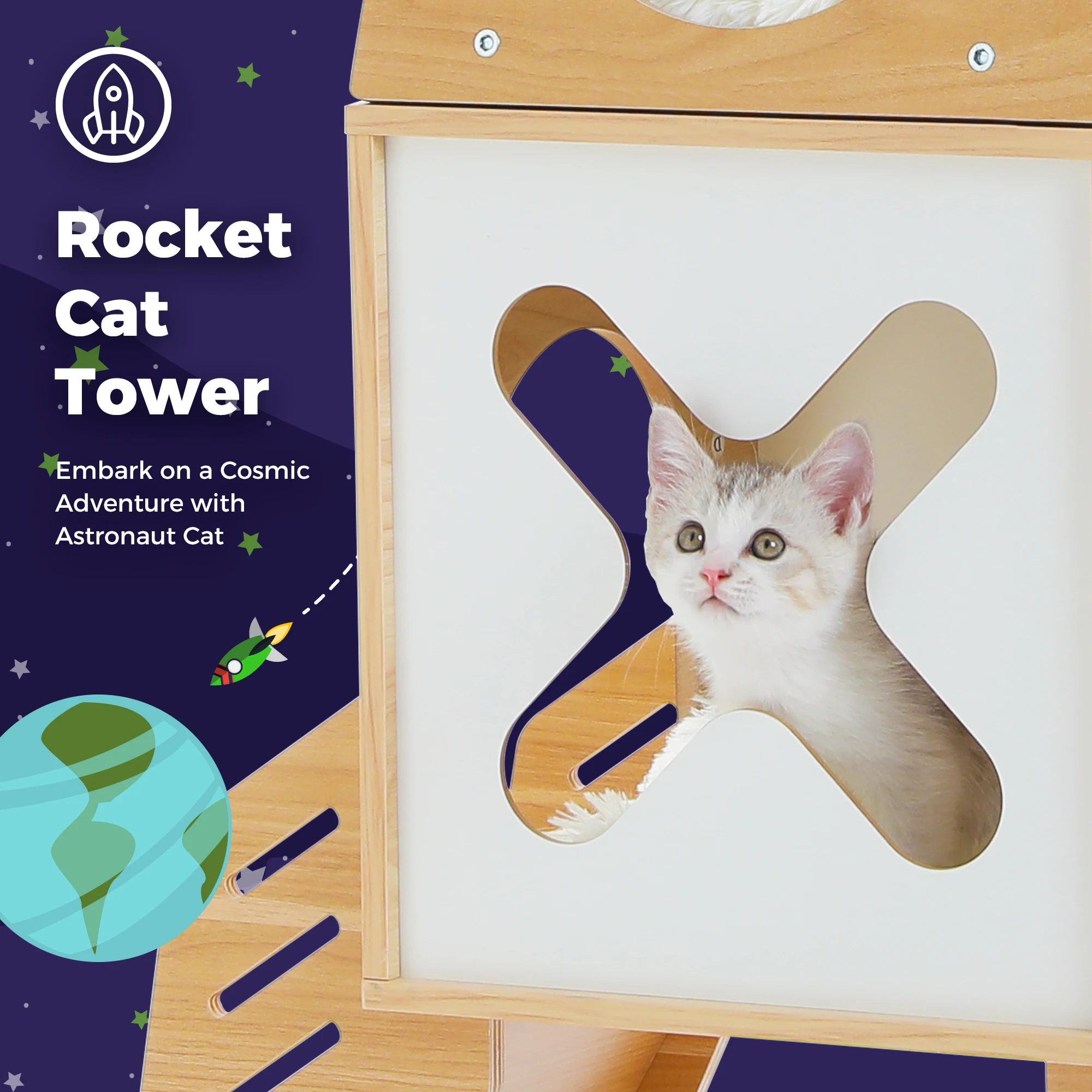 Árbol de gato moderno con forma de cohete, árbol de madera con torre para gatos para gatos de interior con dos casas de juegos para gatos y dos conos, bolas colgantes