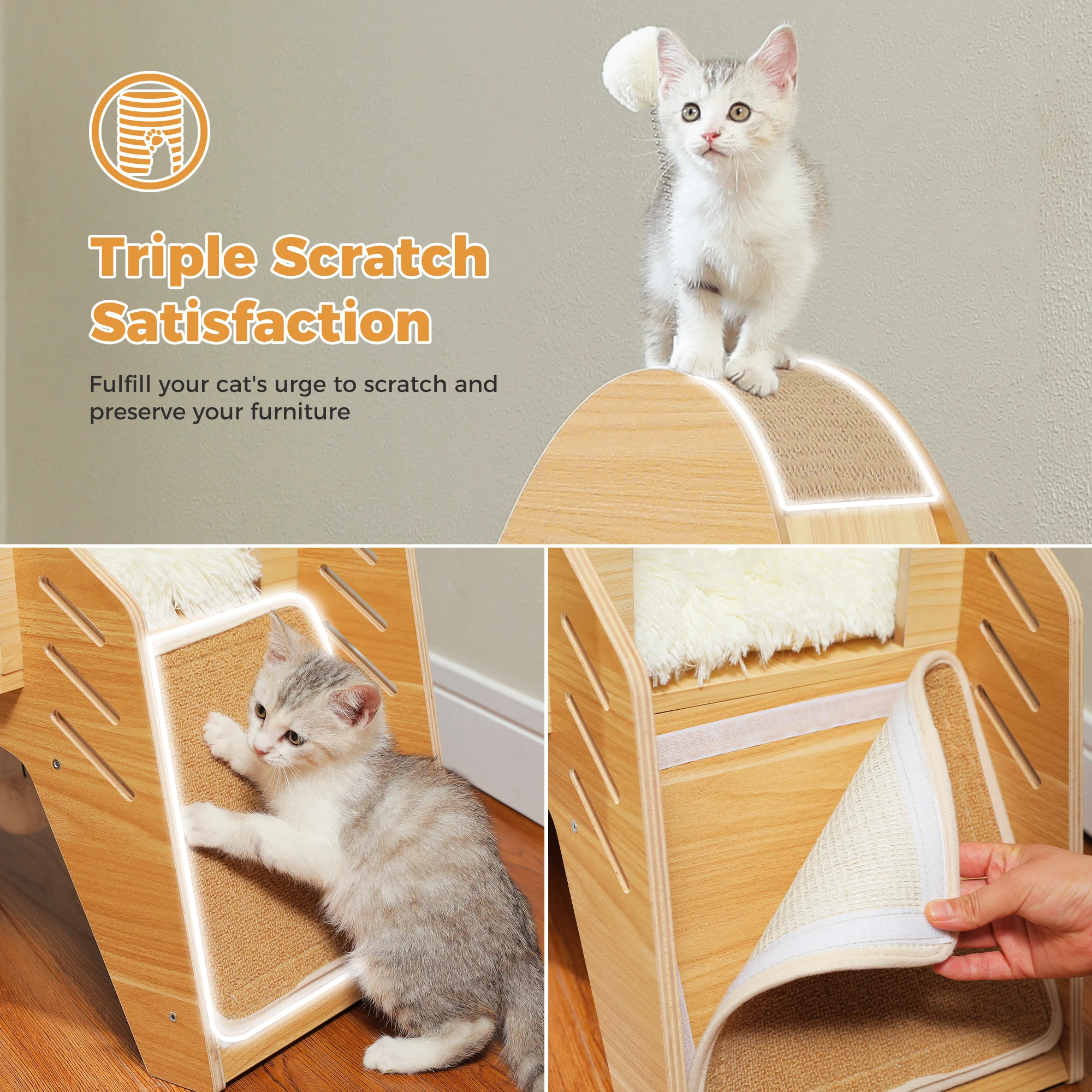 Comodidad de siguiente nivel: el árbol para gatos de madera viene con dos cojines gruesos que están cubiertos con felpa.El peluche es muy suave y cómodo.Cuando se coloca dentro de un condominio, aumenta efectivamente la fricción, proporcionando un ambiente más seguro para que jueguen los gatos.Además, ofrece un cierto nivel de calidez, permitiendo un ambiente más cuidadoso y nutritivo para tu pequeño amigo felino.Además de mejor, ofrecemos el reemplazo de repuesto.