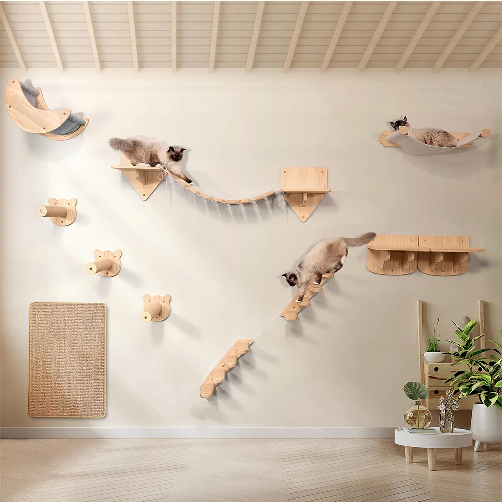 The main body of the cat frame is made of high-quality wood, with a solid texture and clear grain. After fine polishing and processing, the surface is smooth and free of burrs, which will not cause damage to the cat's paws. Paired with sturdy wall mounted accessories, it can be securely fixed to the wall after installation, able to withstand the weight of cats and the pressure of daily activities, ensuring the safety of cats when moving on it.