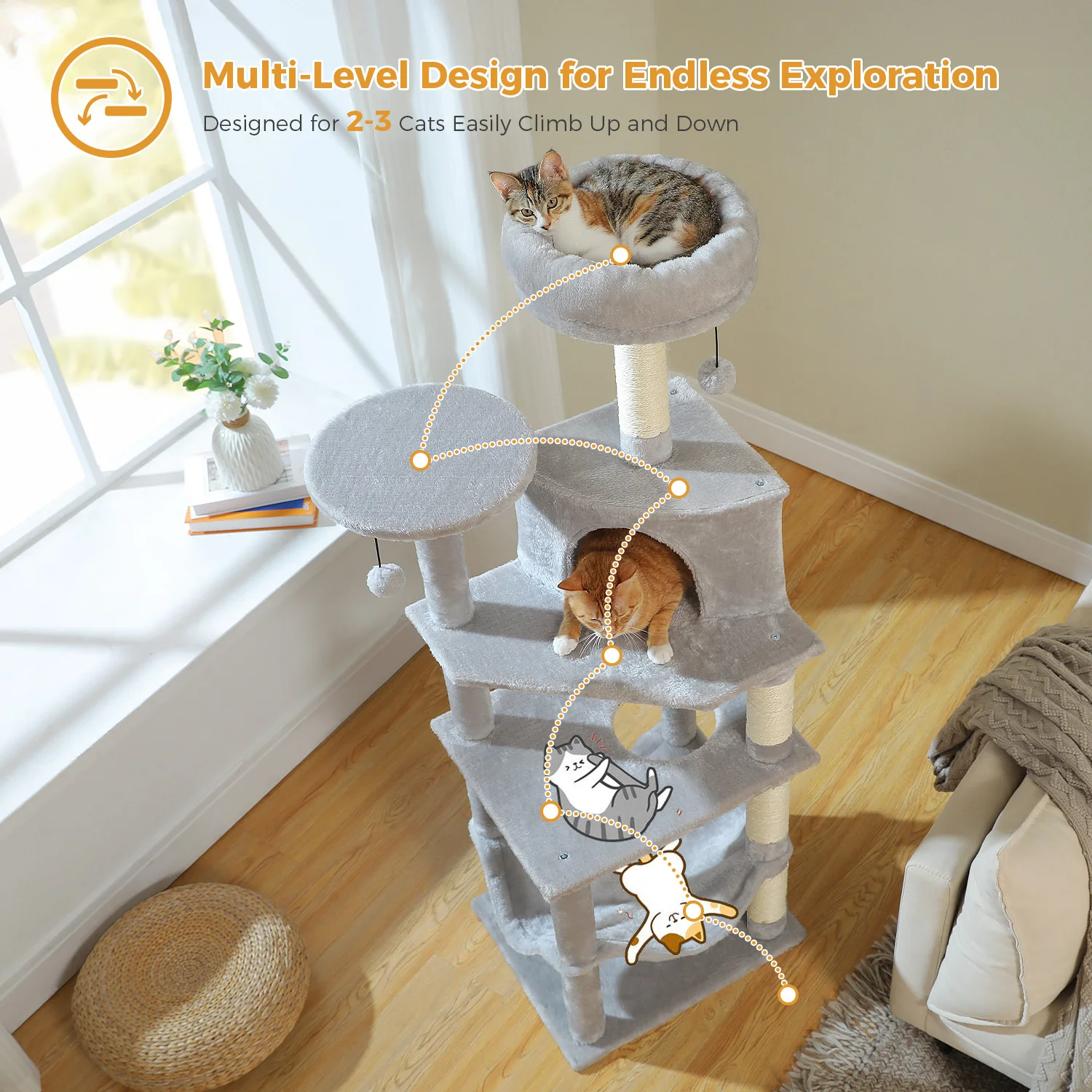 1.Árbol para gatos multifuncional, gran espacio para jugar y descansar.Puede contener de 3 a 4 gatos al mismo tiempo.