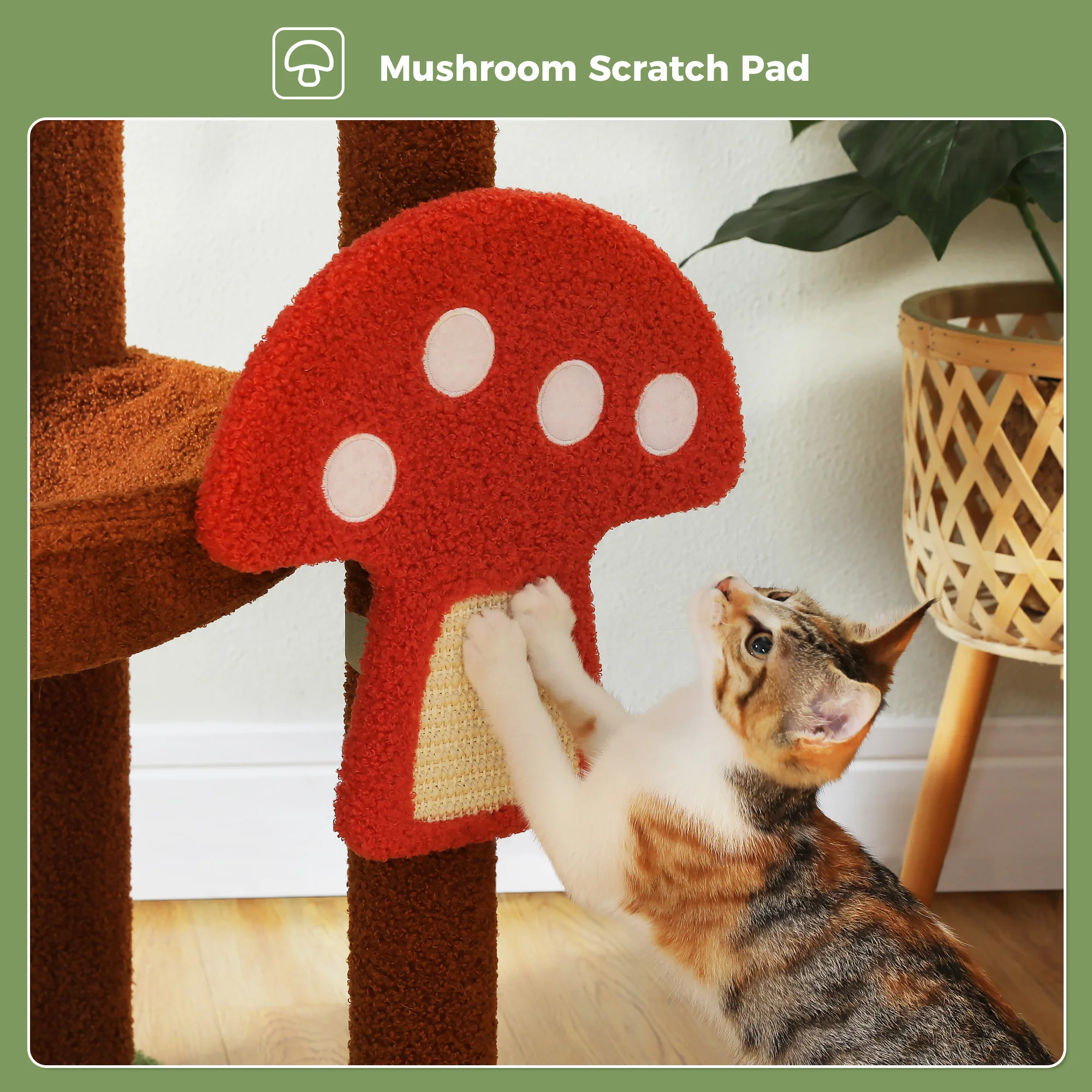 Rascador de hongos extraíble:El adorable rascador en forma de hongo se desprende fácilmente para un uso flexible.Los gatos pueden disfrutarlo dentro o fuera del árbol: perfecto para patas divertidas y espacios elegantes.