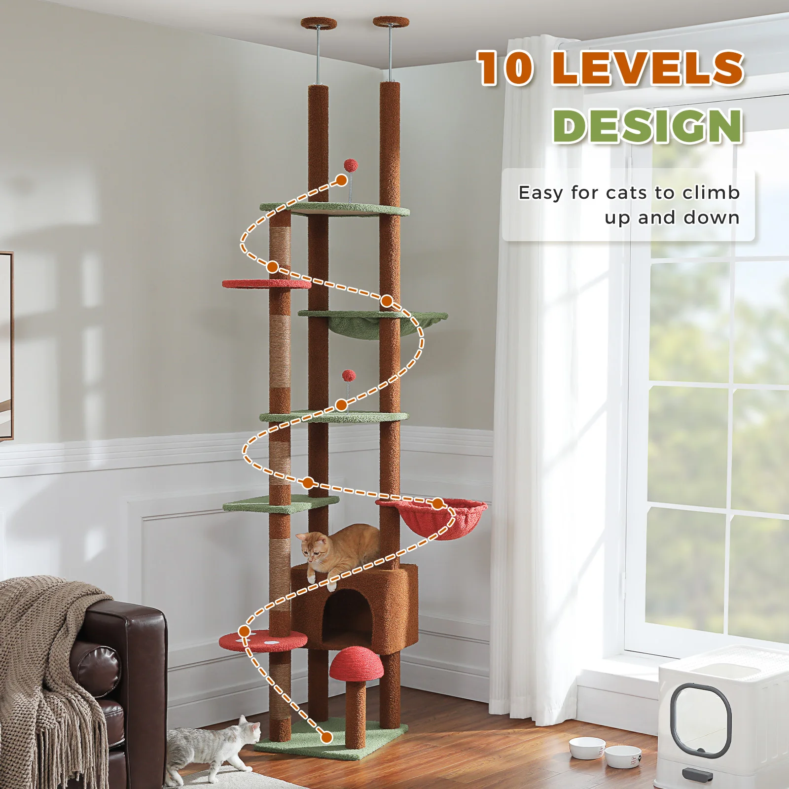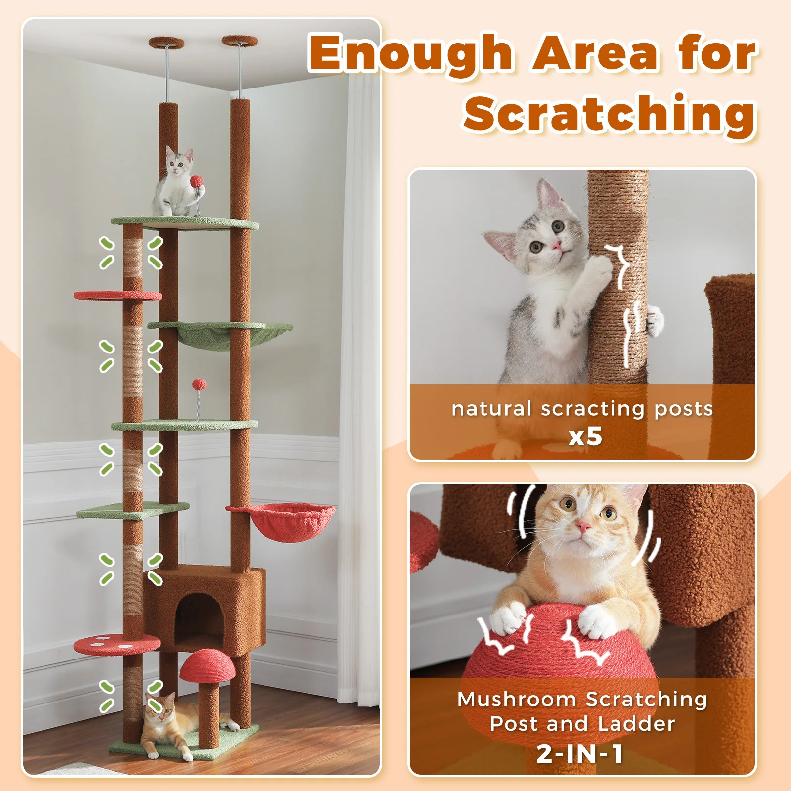 Árbol para gatos ajustable de 230-252 cm, condominio para gatos del piso al techo, bola colgante, 5 postes para rascar, hamaca, amplio lugar de descanso para gatos