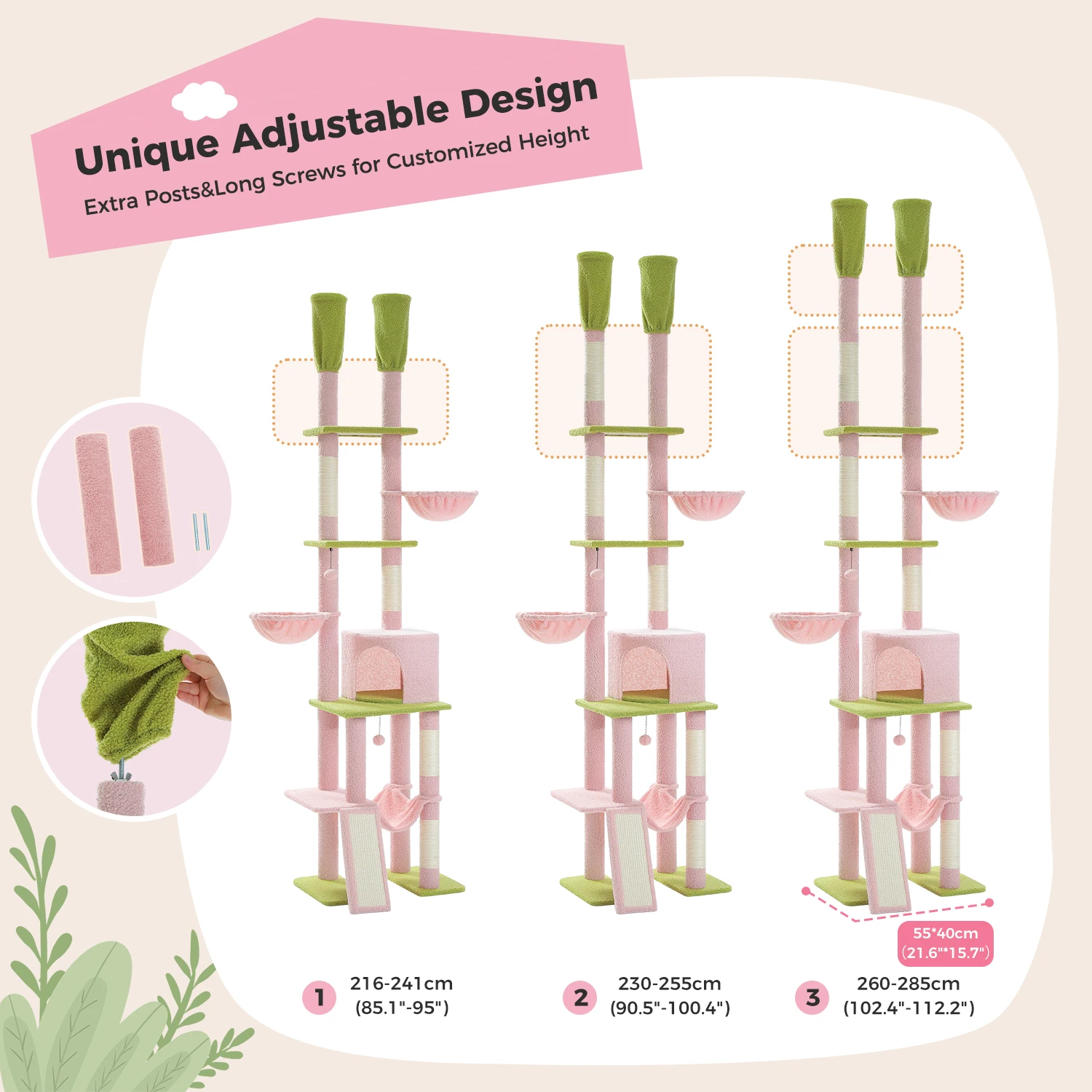 Ahorro de espacio y sin perforaciones:Diseñada para que los gatos se mantengan altos, esta torre de actividades para gatos del suelo al techo se ajusta en altura de 216 cm a 285 cm, ocupando el máximo espacio vertical.Con la barra tensora y sin necesidad de perforar un agujero en el techo, puede colocar esta torre para gatos en cualquier lugar de su habitación cómodamente con diferentes alturas.