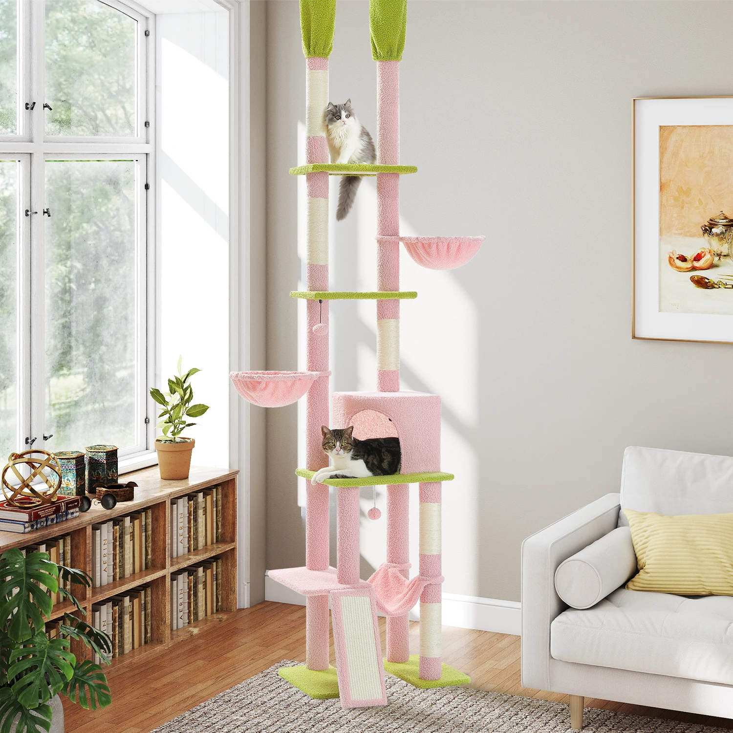 Forma única de cactus:Esta torre para gatos de suelo a techo con un aspecto de color saturado, adecuada para gatos promedio seguramente llamará toda la atención de su gato y también refrescará perfectamente su sala de estar.Además, este árbol para gatos alto multifuncional combina plataformas, hamacas, bolas colgantes y postes para rascar totalmente cubiertos de sisal para satisfacer las diversas necesidades del gato en interiores.