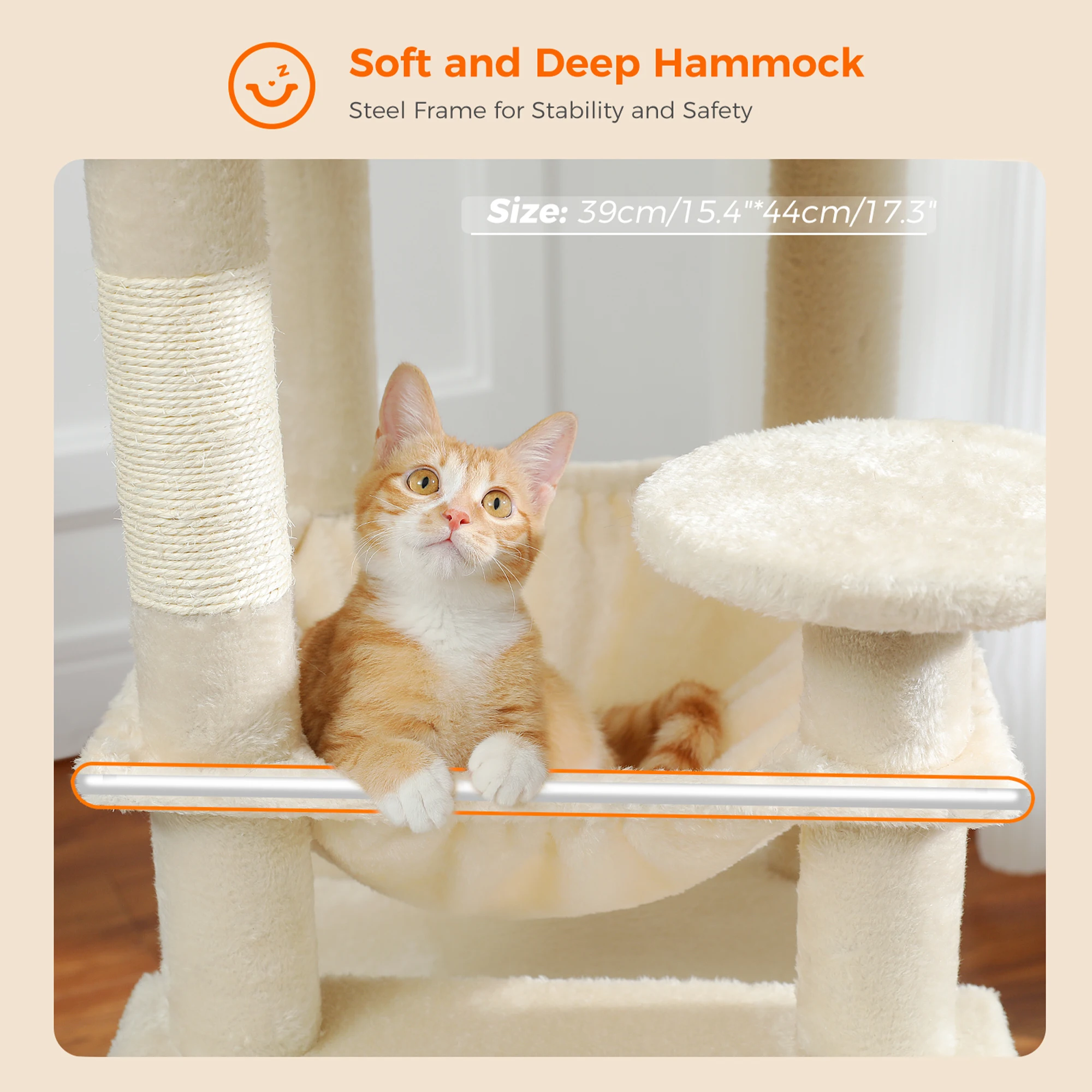 Postes rascadores duraderos: Múltiples postes de rascado envueltos en cuerda de sisal satisfacen la necesidad instintiva de su gato de rascarse, ayudando a mantener sus garras sanas y sus muebles seguros.