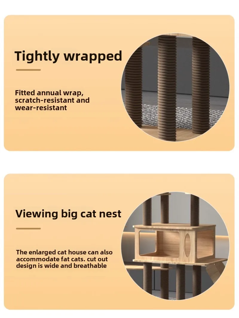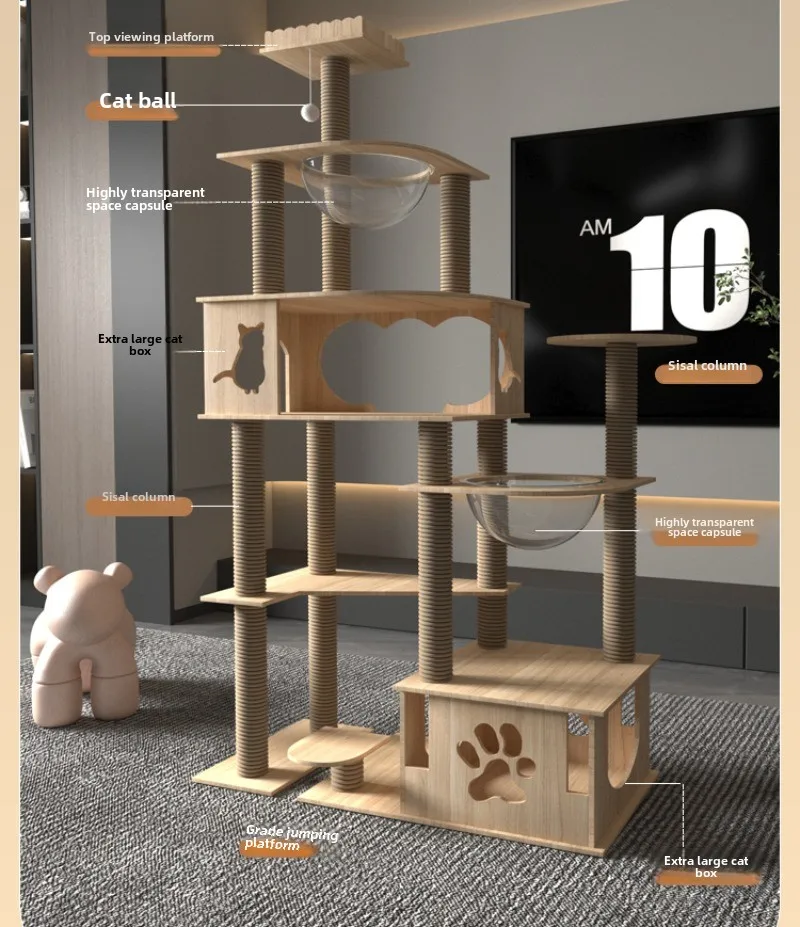 Descripción:Marco de escalada para gatos, nido grande para gatos, cápsula espacial, rascador para gatos, todas las estaciones, gato de gran tamaño universal, gato de lujo, Villa, juguete para gatos Características: 1.No ocupa espacio Doble cápsula Agarre y resistencia al desgaste Sólido y resistente 2.El espacio multicapa salta hacia arriba y hacia abajo, sin obstáculos, y se mueve libremente para satisfacer las necesidades diarias de las familias multigatos. 3.Cápsulas gemelas transparentes 360° Alta transmitancia de luz, fácil de observar el diseño cóncavo del estado de sueño del gato, se adapta a la curva del gato y duerme cómodamente Paso 4 Casa para gatos espaciosa Aumente el espacio, diseño de doble exportación sin preocupaciones para gatos gordos, los gatos lanzan libremente y sin restricciones. 5.Plataforma superior Los gatos tienen hábitos territoriales y de escalada, y prefieren trepar alto durante el día para patrullar alrededor de la arena superior para gatos, lo que es más adecuado para que los gatos tomen una siesta por la tarde.