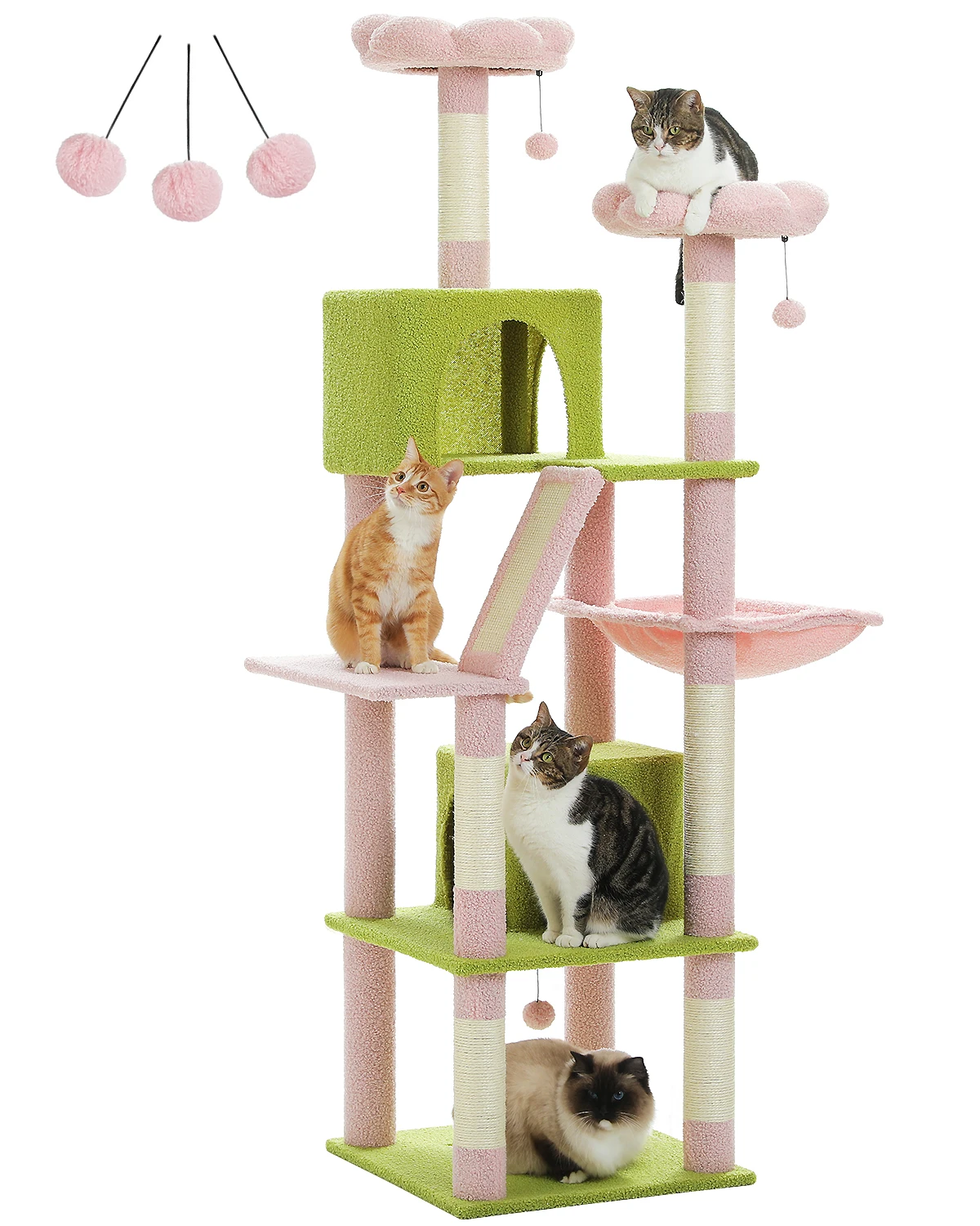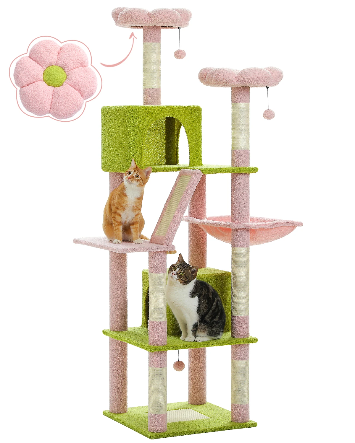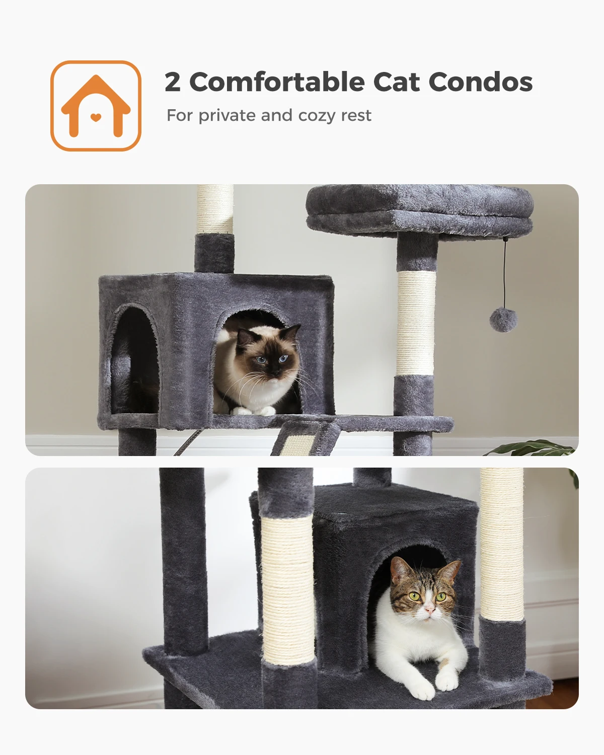 Rascarse en abundancia:Equipado con seis postes rascadores envueltos en sisal duradero y dos rascadores, nuestro árbol para gatos satisface las necesidades naturales de rascado de su gato.Ayuda a mantener sus garras saludables mientras las disuade el uso de sus muebles como almohadilla para rascar.