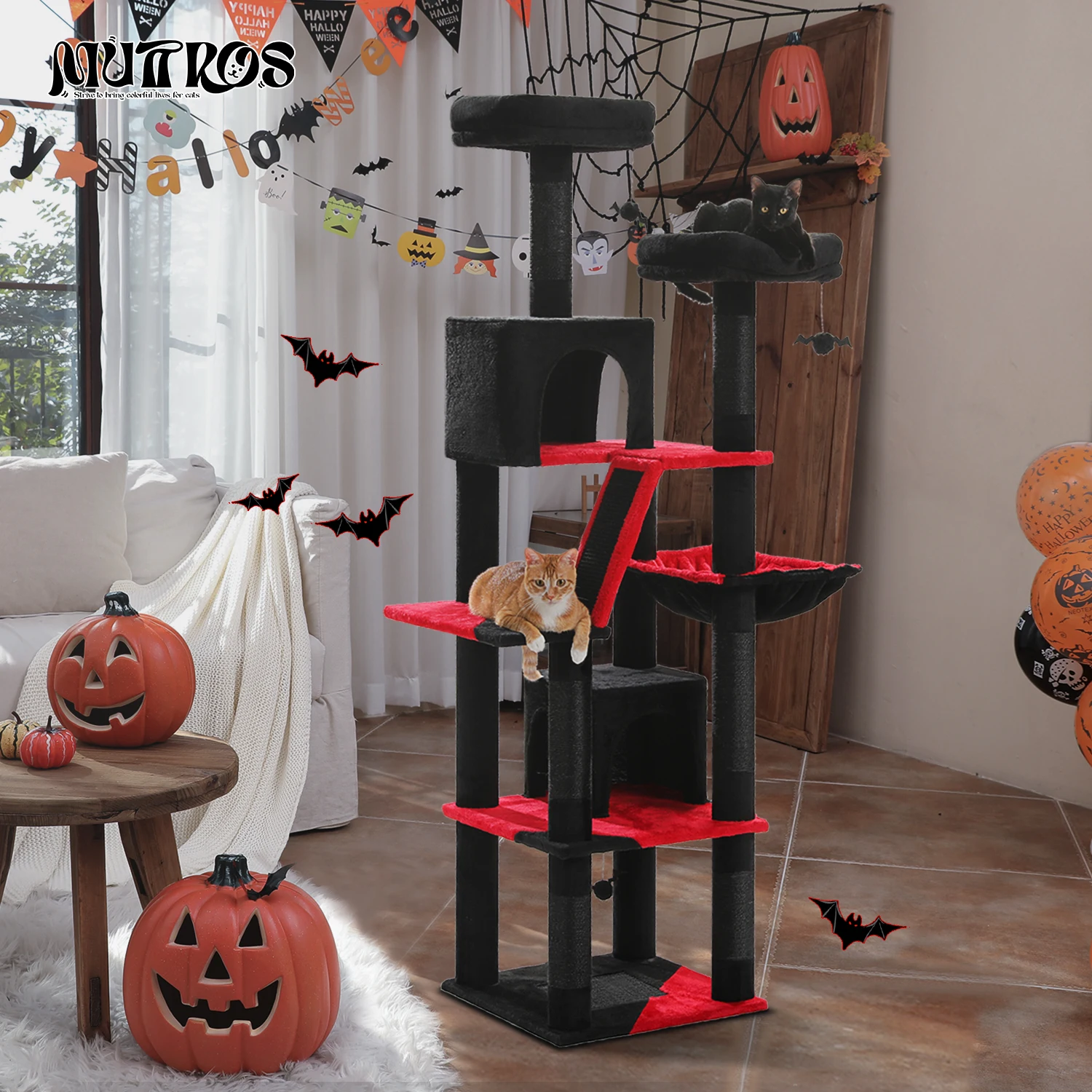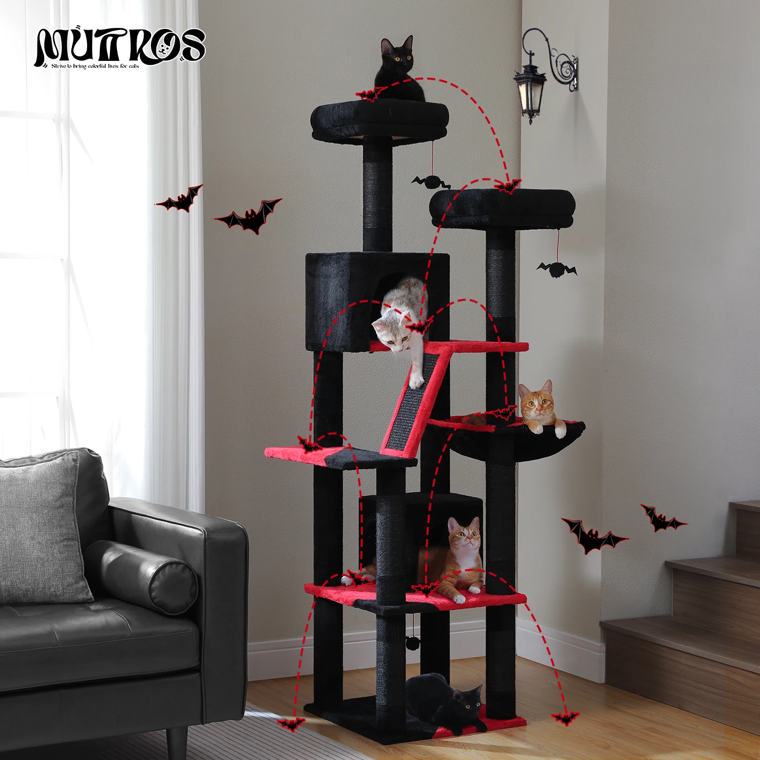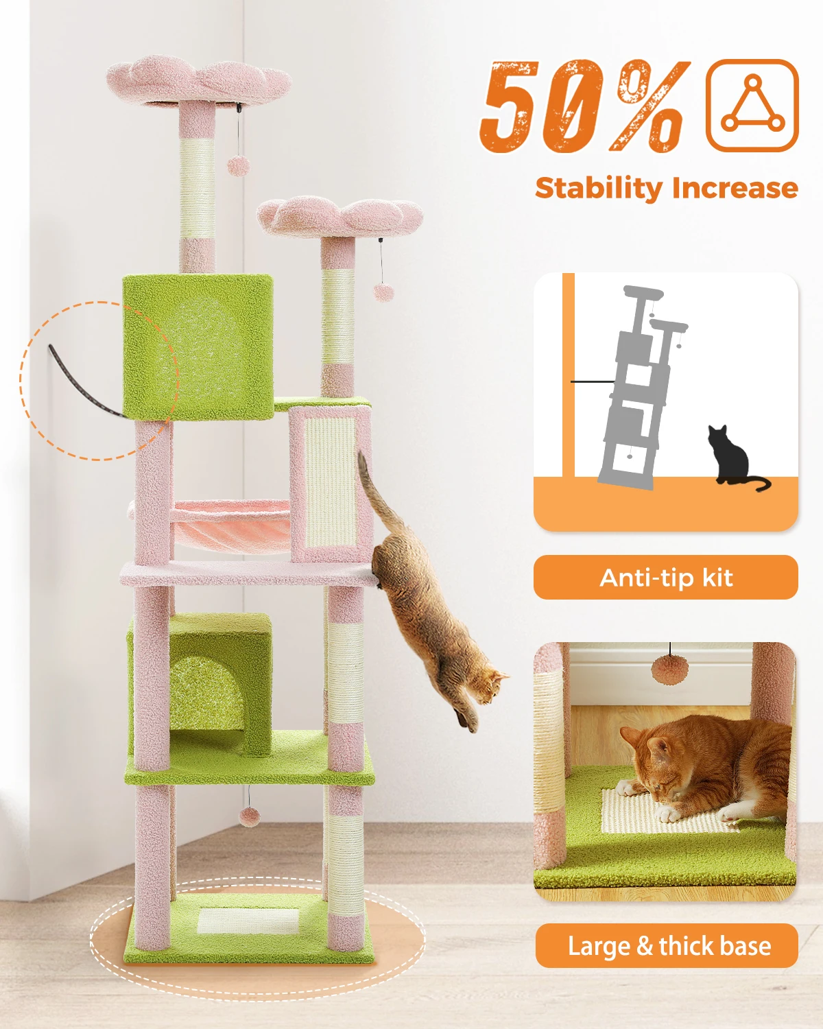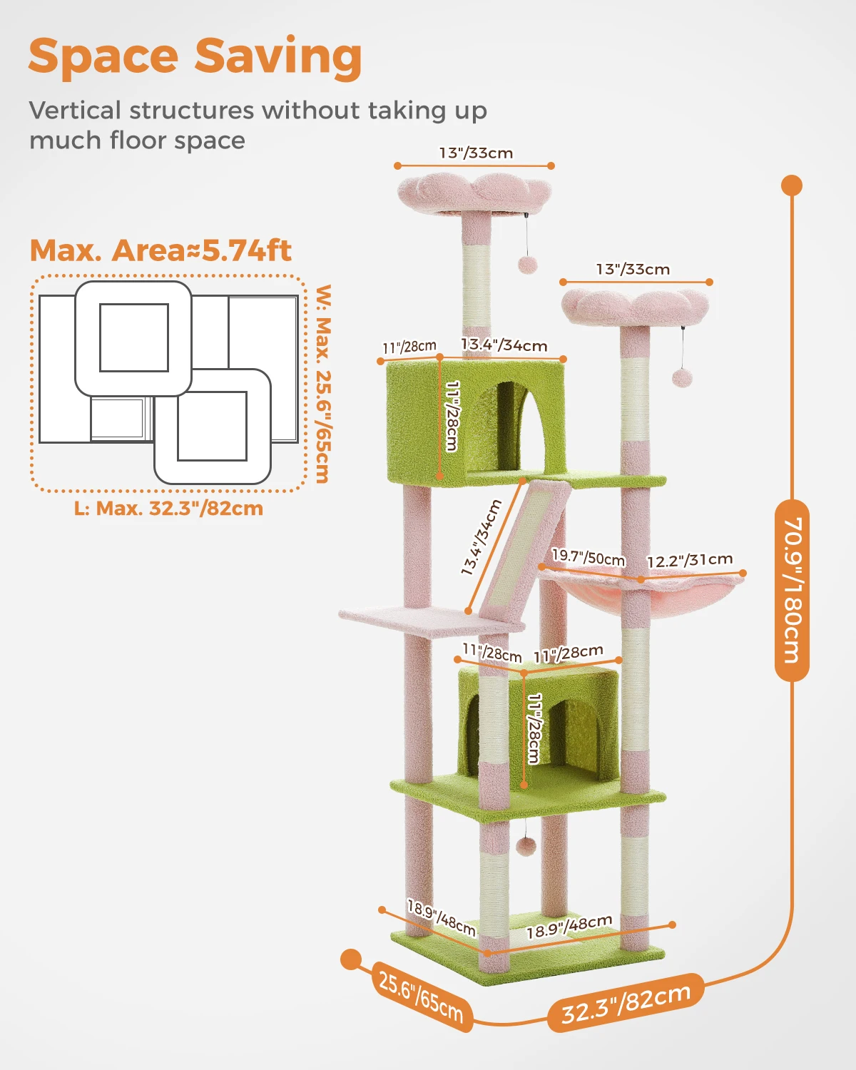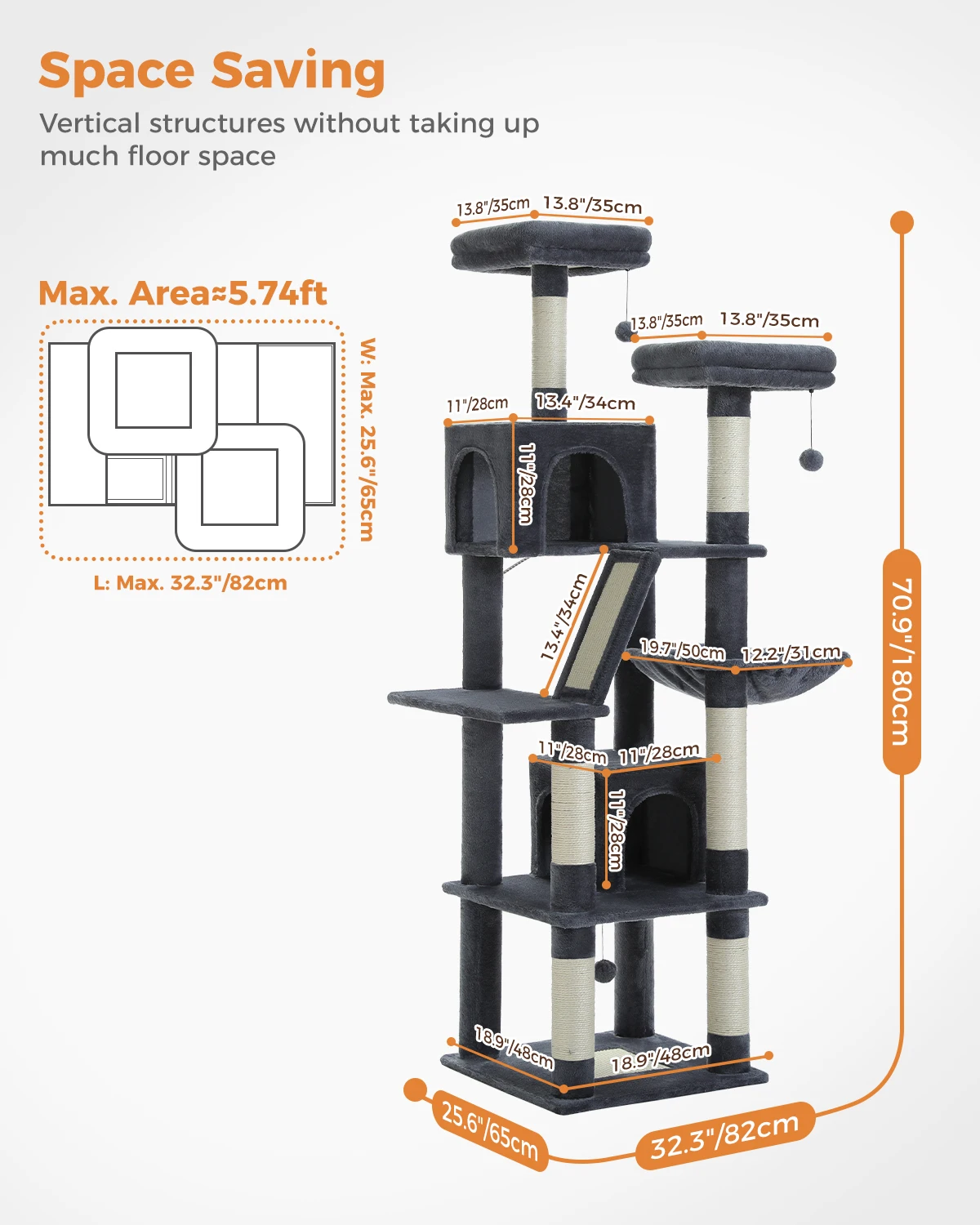 Árbol para gatos de varios niveles de lujo de 180 cm con compuesto de felpa, 6 postes para rascar, 2 tablas, perchas, cuevas, pompones de hamaca para felinos activos