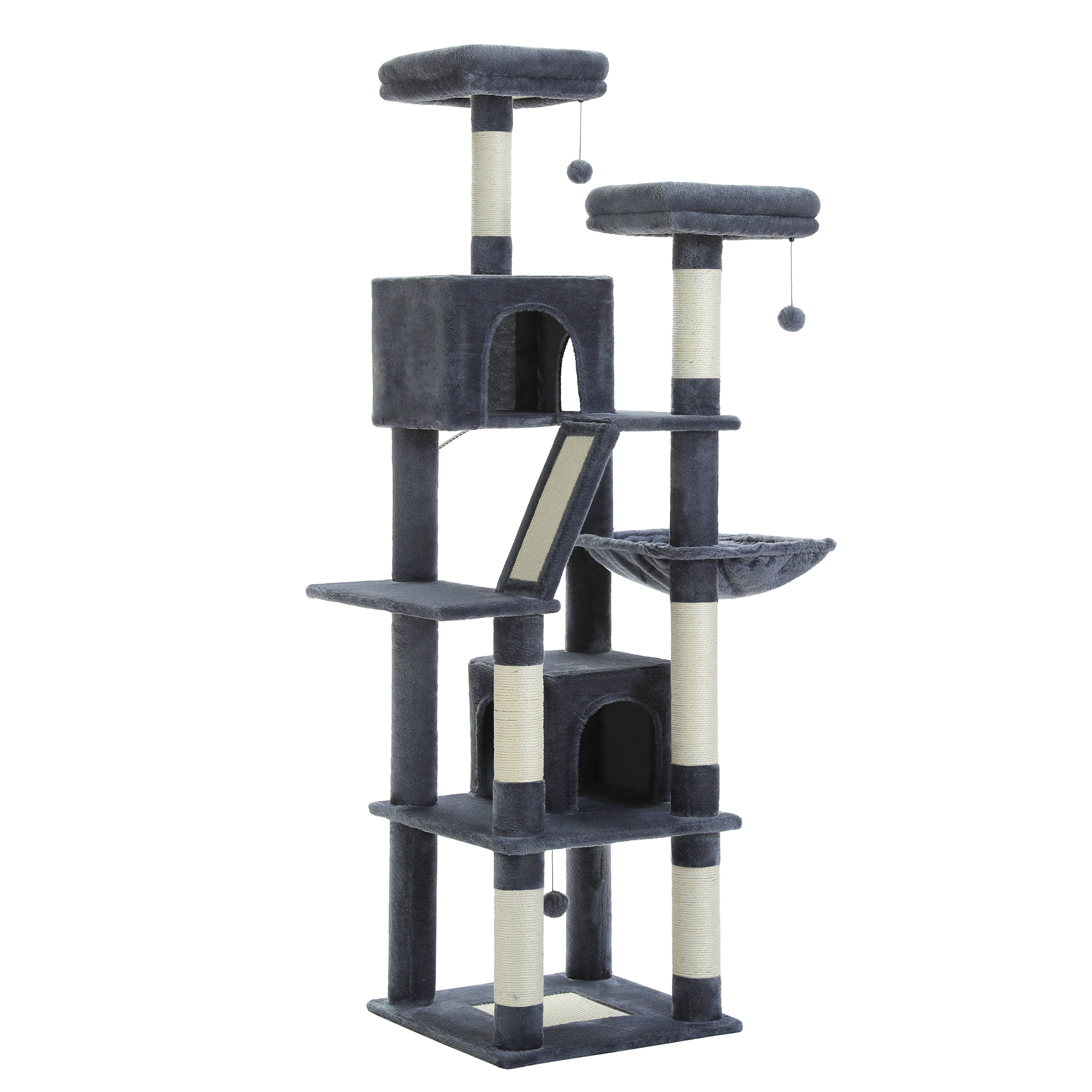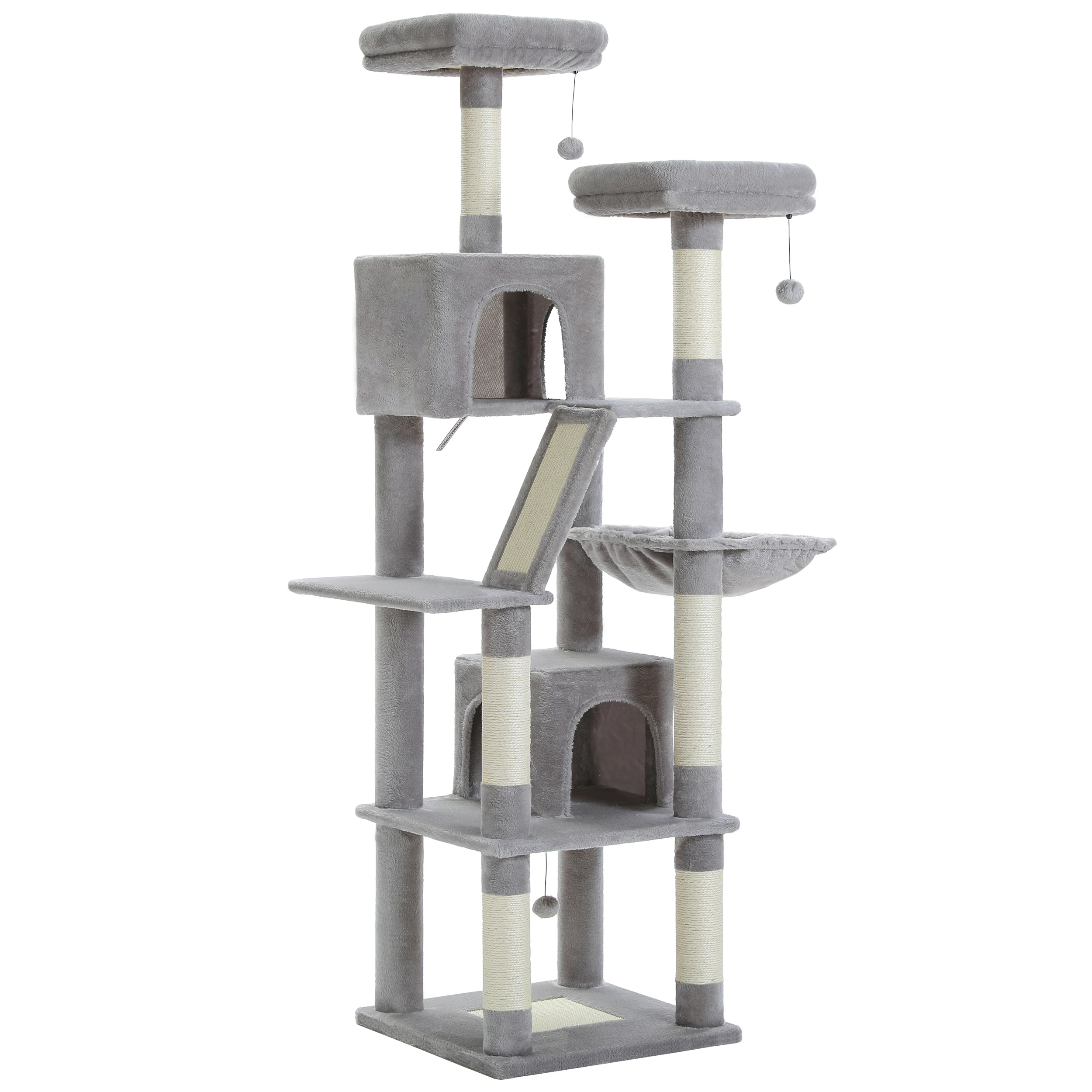 Parque infantil para gatos de varios niveles:Diseñada con múltiples niveles, esta torre para gatos de 70,9" de alto proporciona un amplio espacio vertical para que sus gatos exploren y satisfagan sus instintos naturales y sus necesidades de actividad.Este árbol para gatos cuenta con 6 postes para rascar, 2 tablas para rascar, 2 pompones, 2 condominios, 1 hamaca y 2 perchas, para satisfacer las diversas necesidades de varios gatos simultáneamente.