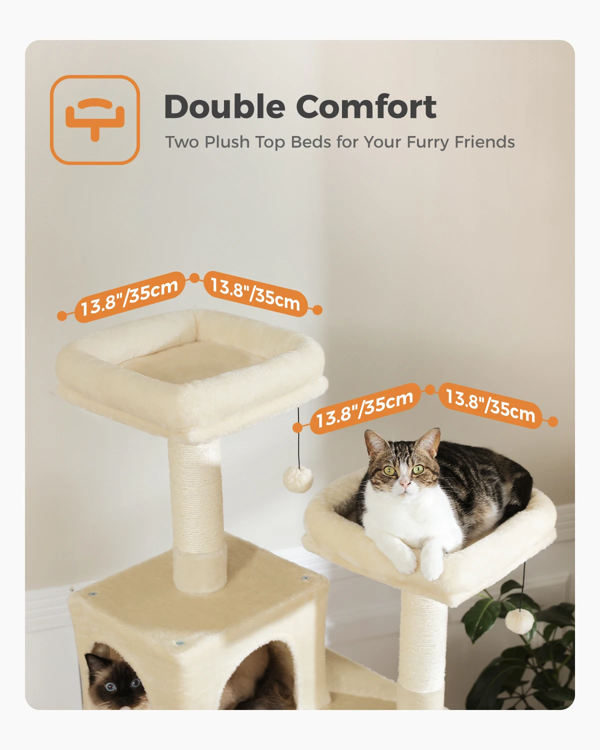 Perfecto para hogares con múltiples gatos:Este árbol para gatos grande tiene más lugares de descanso y puede acomodar hasta 4-6 gatos pequeños y medianos al mismo tiempo.Dos perchas superiores extragrandes y una hamaca grande y esponjosa para gatos brindan un amplio espacio para que sus gatitas gordas se estiren y se pongan.También pueden disfrutar de mordiscos con los juguetes colgantes.Además, un espacioso condominio esponjoso para gatos ofrece un acogedor escondite para las siestas de los gatos, cubierto con tela de felpa para brindar la máxima comodidad.