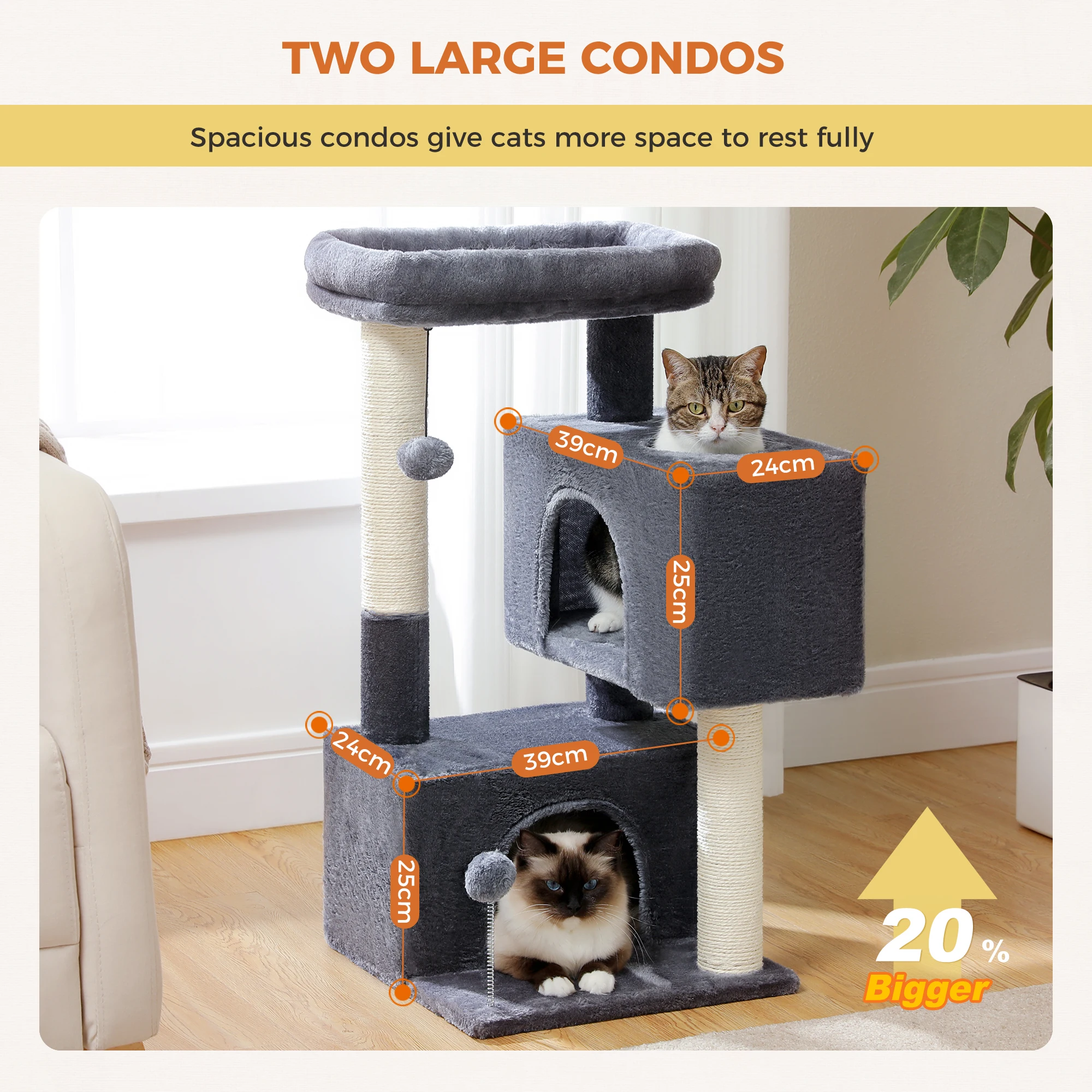 Condos rectangulares de diseño ergonómico:Esta torre para gatos cuenta con dos condominios rectangulares diseñados específicamente para acomodar los cuerpos elegantes y alargados de los gatos.Estos condominios proporcionan espacios de descanso cómodos y seguros, perfectamente adaptados a la forma natural de tus amigos felinos.