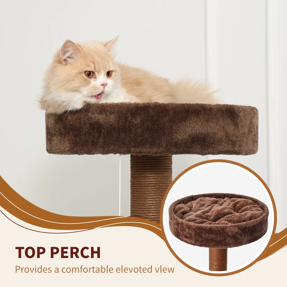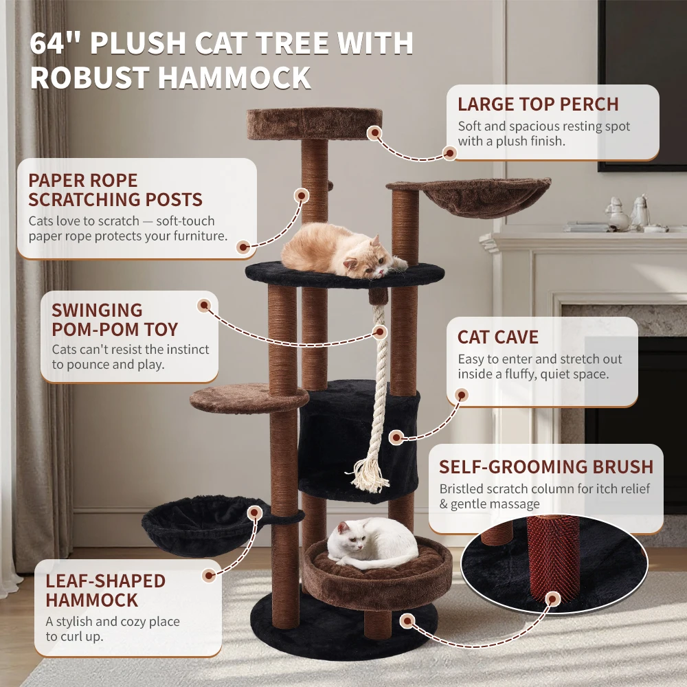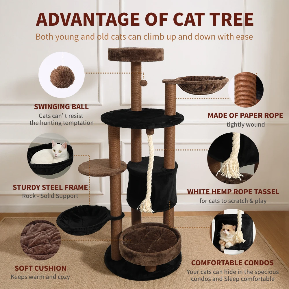 Máxima comodidad, disfrute lujoso en las nubes: las perchas y plataformas cuidadosamente diseñadas están cubiertas con tejidos de felpa suaves y agradables para la piel, lo que proporciona un puerto de descanso cálido y táctil para los gatos.Una plataforma de observación elevada les brinda una vista pacífica del territorio y una casa de juegos privada brinda una sensación de seguridad mientras disfrutan de un descanso relajante en las nubes.