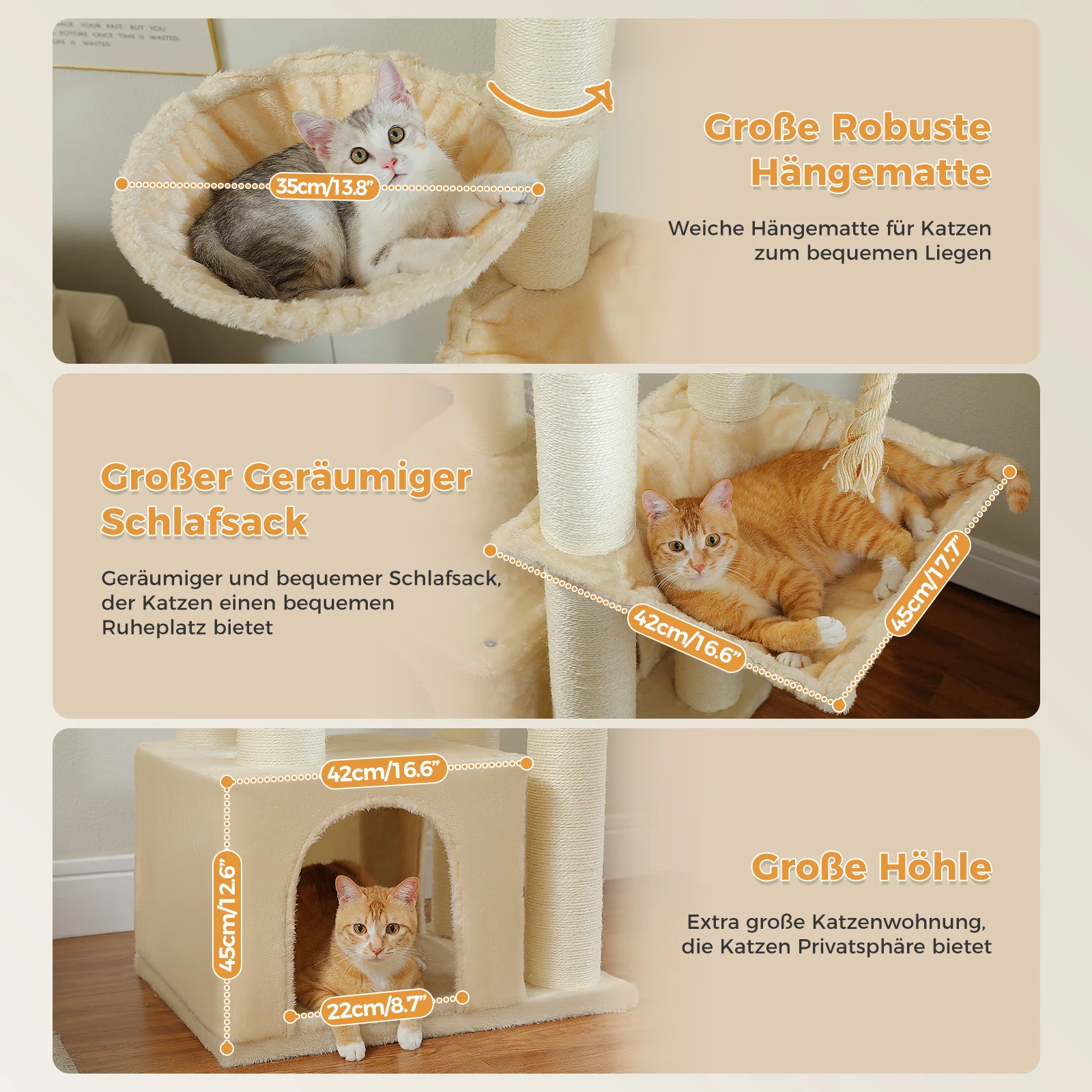 UNA VARIEDAD DE TELAS Y PERCHAS PARA COLGAR PARA CADA GATO: Este árbol para gatos incluye 3 hamacas para gatos de diferentes tamaños, 3 perchas superiores extra grandes y una casa para gatos extra grande para adaptarse a las preferencias de cada gato.Cada percha es suave y cómoda, lo que facilita brindarle a su gato un espacio habitable espacioso y separado.