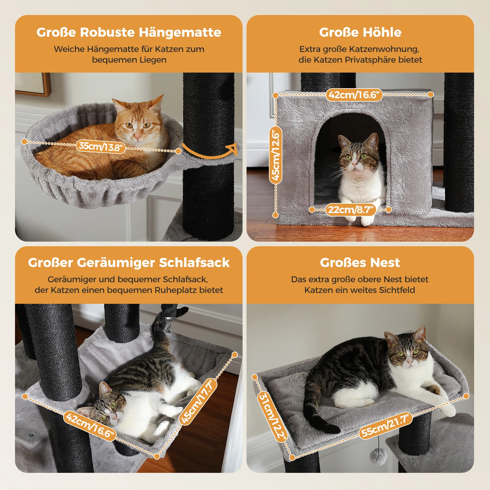 Árbol grande para gatos grandes, torre robusta para gatos con varios niveles, casa para gatos, árbol de escalada con hamaca, 11 postes de Sisal, percha grande