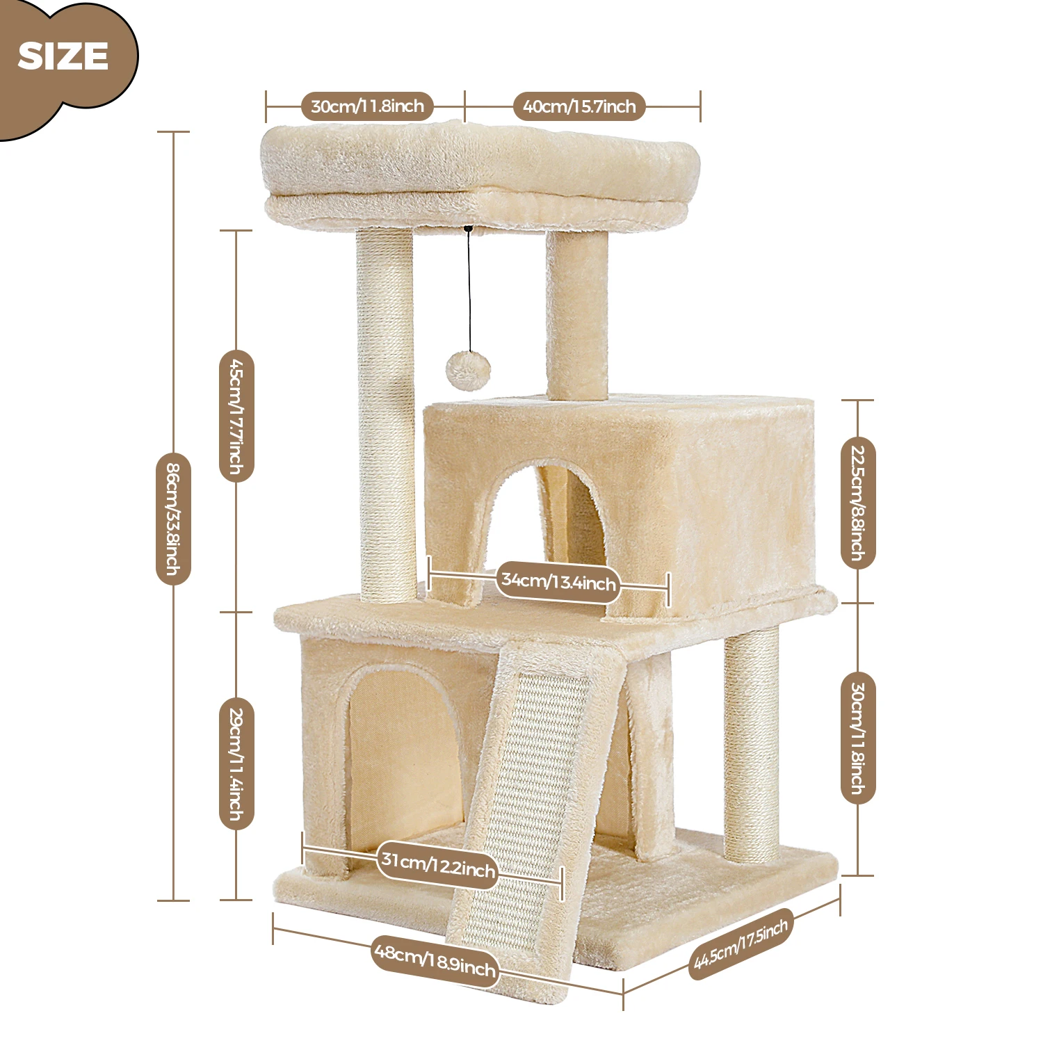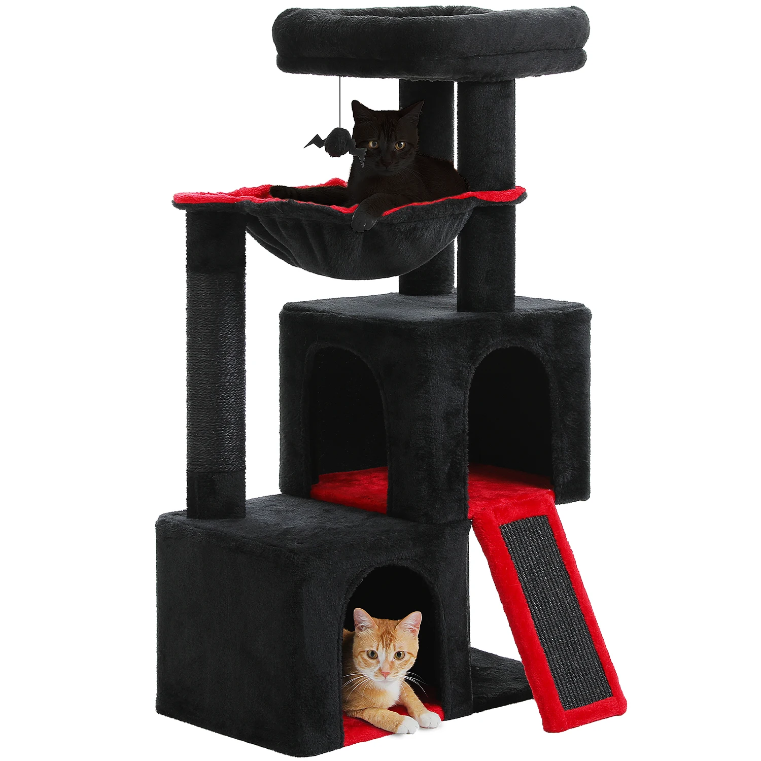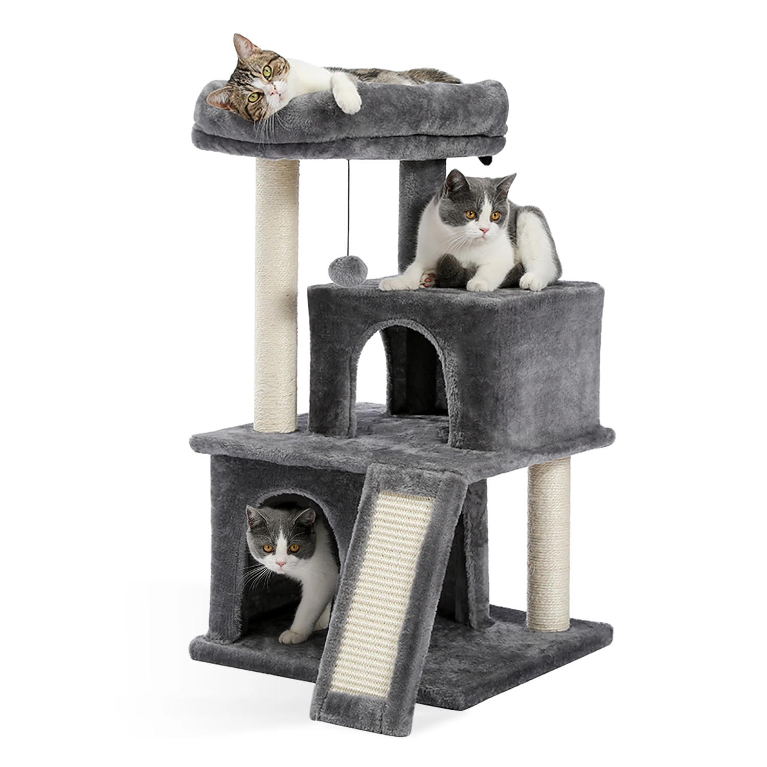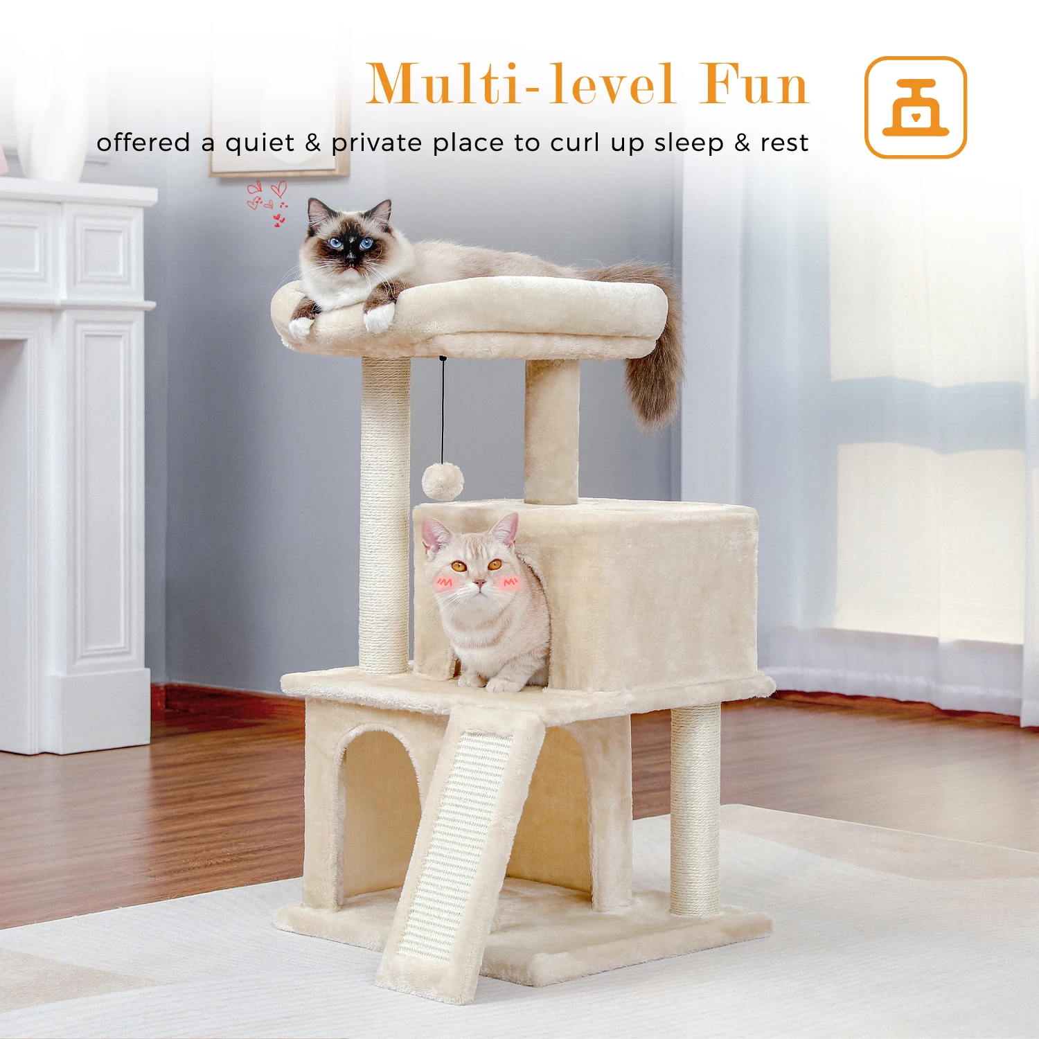 Diseño dual considerado:Los condominios dobles espaciosos ofrecen lugares tranquilos y privados para acurrucarse el sueño y el descanso.La diferente distribución de la caseta satisface diferentes edades de gatos ya que el apartamento de piso no requiere pasos, es ideal para gatos mayores y jóvenes, mientras que la superior está diseñada para saltar y escaladores, y la almohadilla para rascar inferior ayuda a los gatos a entrar en el condominio superior. libremente.