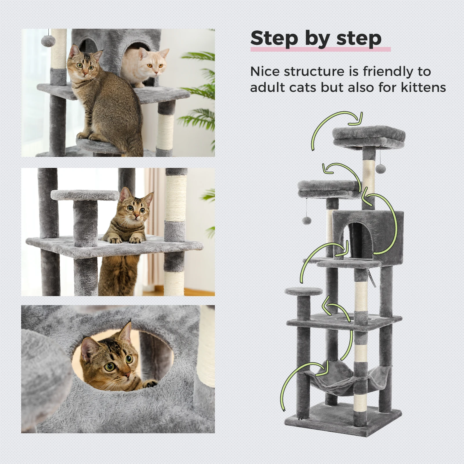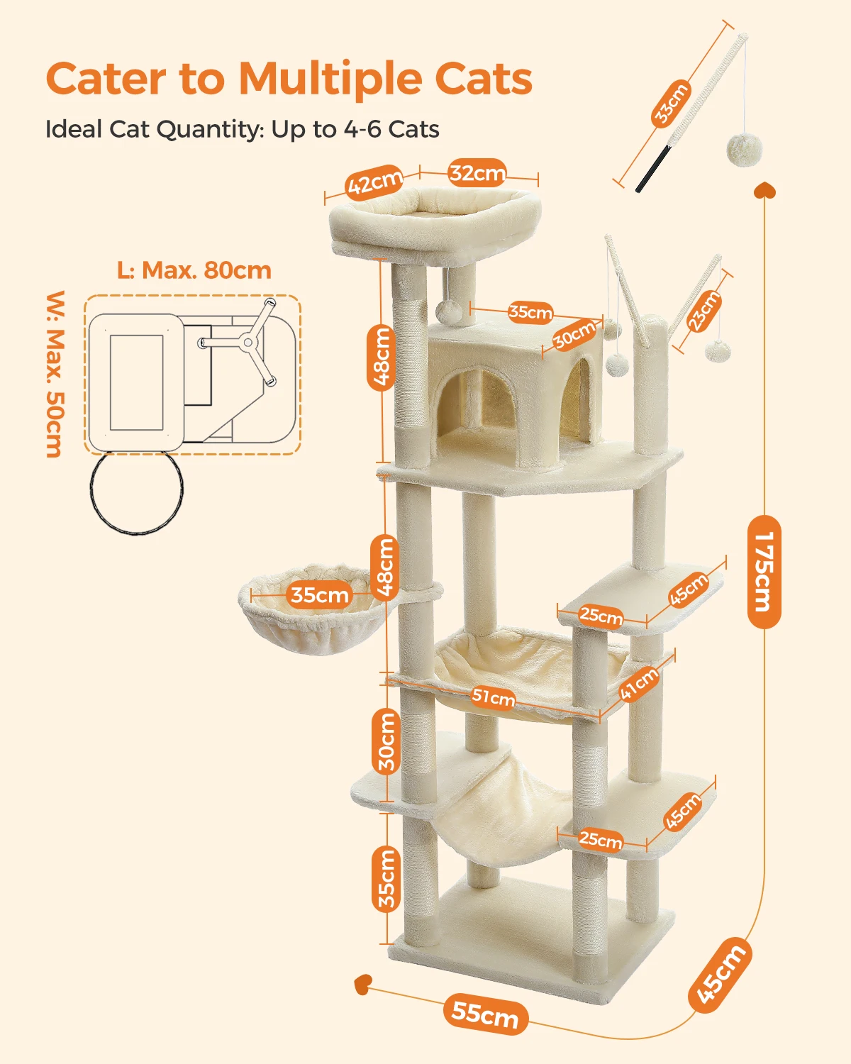 Varias hamacas y perches para cada gato:Con 3 hamacas para gatos de diferentes tamaños (más grandes ser 20"x16"), una percha superior súper grande (16"x12") y una casa condominaria para gatos, este árbol para gatos se adapta a las preferencias de descanso de cada gato.