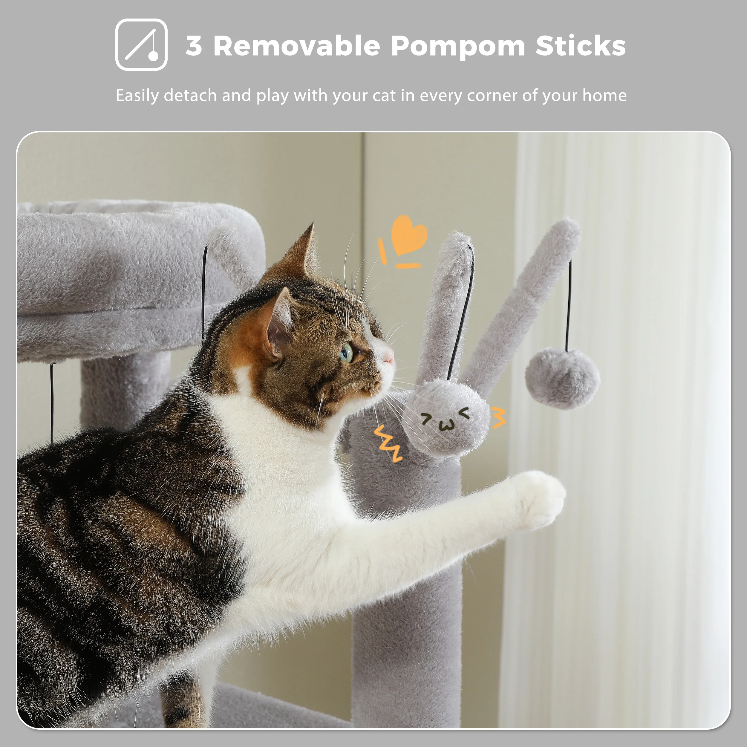 Liberación de instintos en pompones y rascadores:Dale al gato la oportunidad de involucrar instintos naturales en esta torre para gatos con 4 pompones interactivos que son desmontables como un juguete para gatos separado y 5 postes rascadores duraderos para gatos de sisal, ideales para mantener sus garras sanas.
