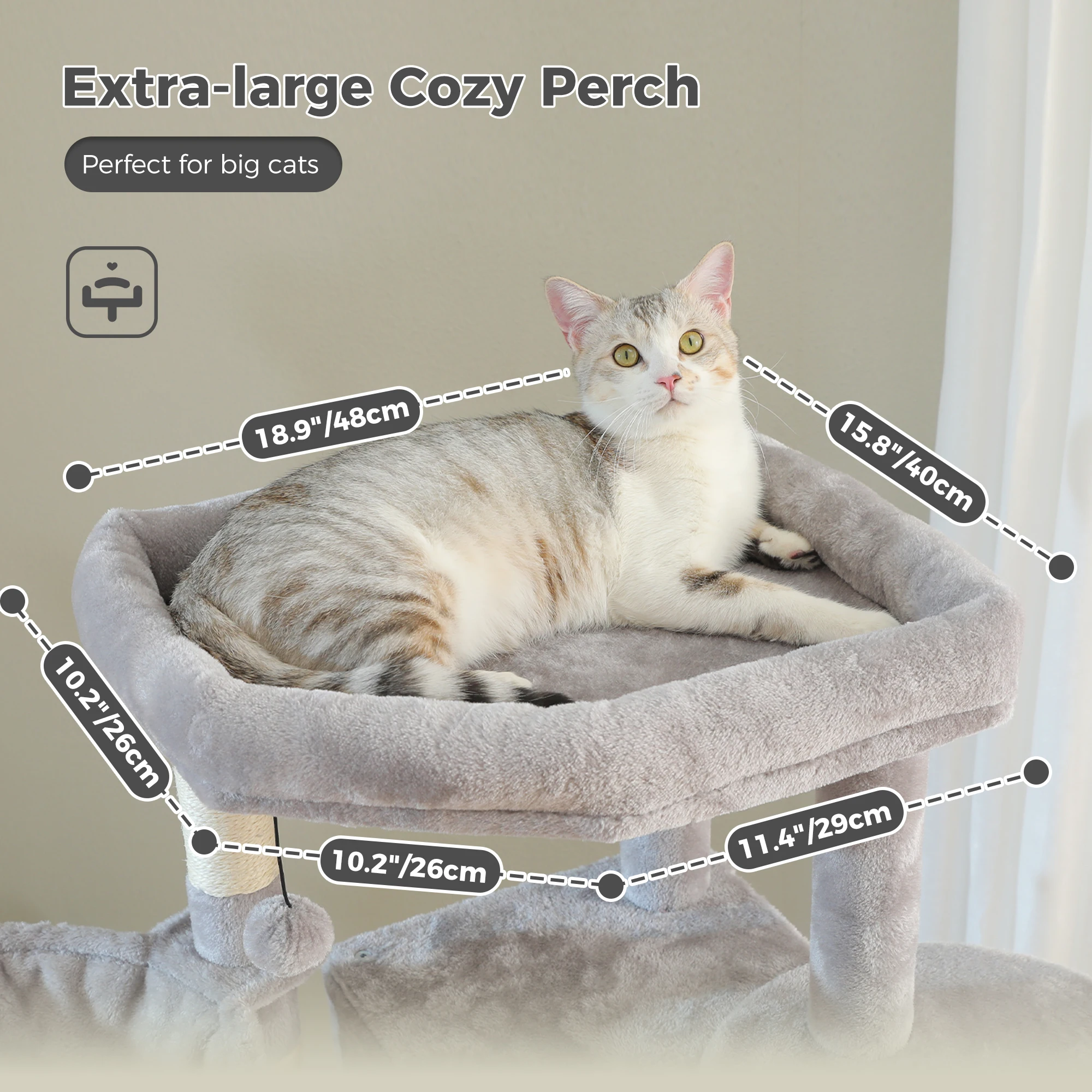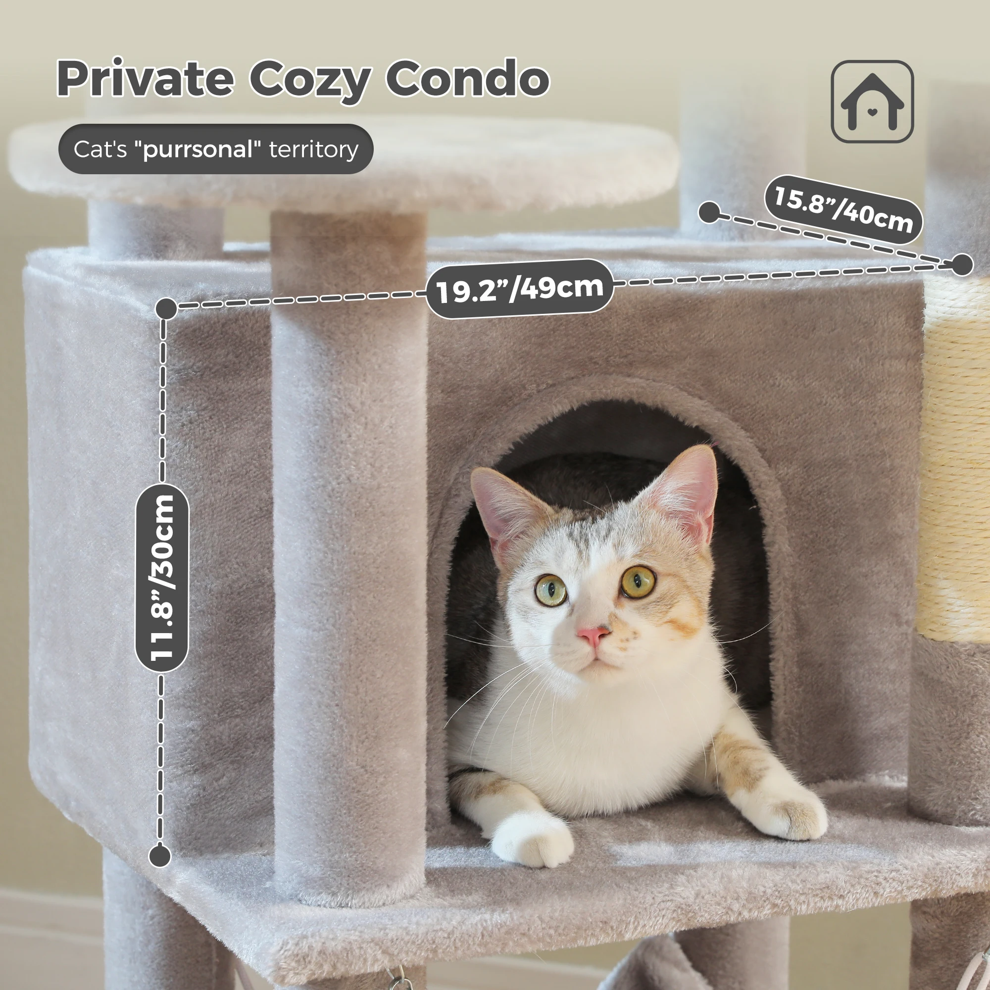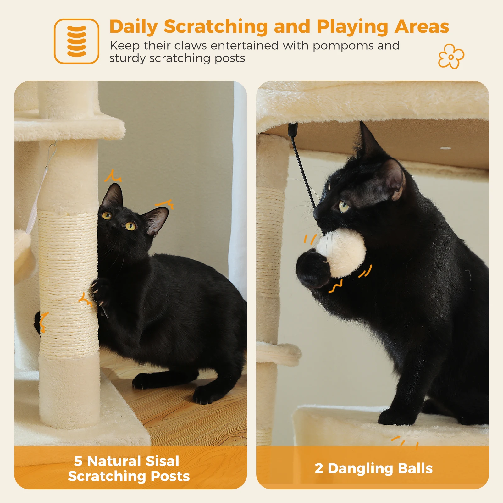Condos duales y espaciosos:La torre para gatos incluye dos condominios espaciosos que ofrecen a tus amigos felinos retiros acogedores para descansar y tomar una siesta.Estos condominios están diseñados para adaptarse a gatos de todos los tamaños, proporcionándoles escondites seguros y cómodos.