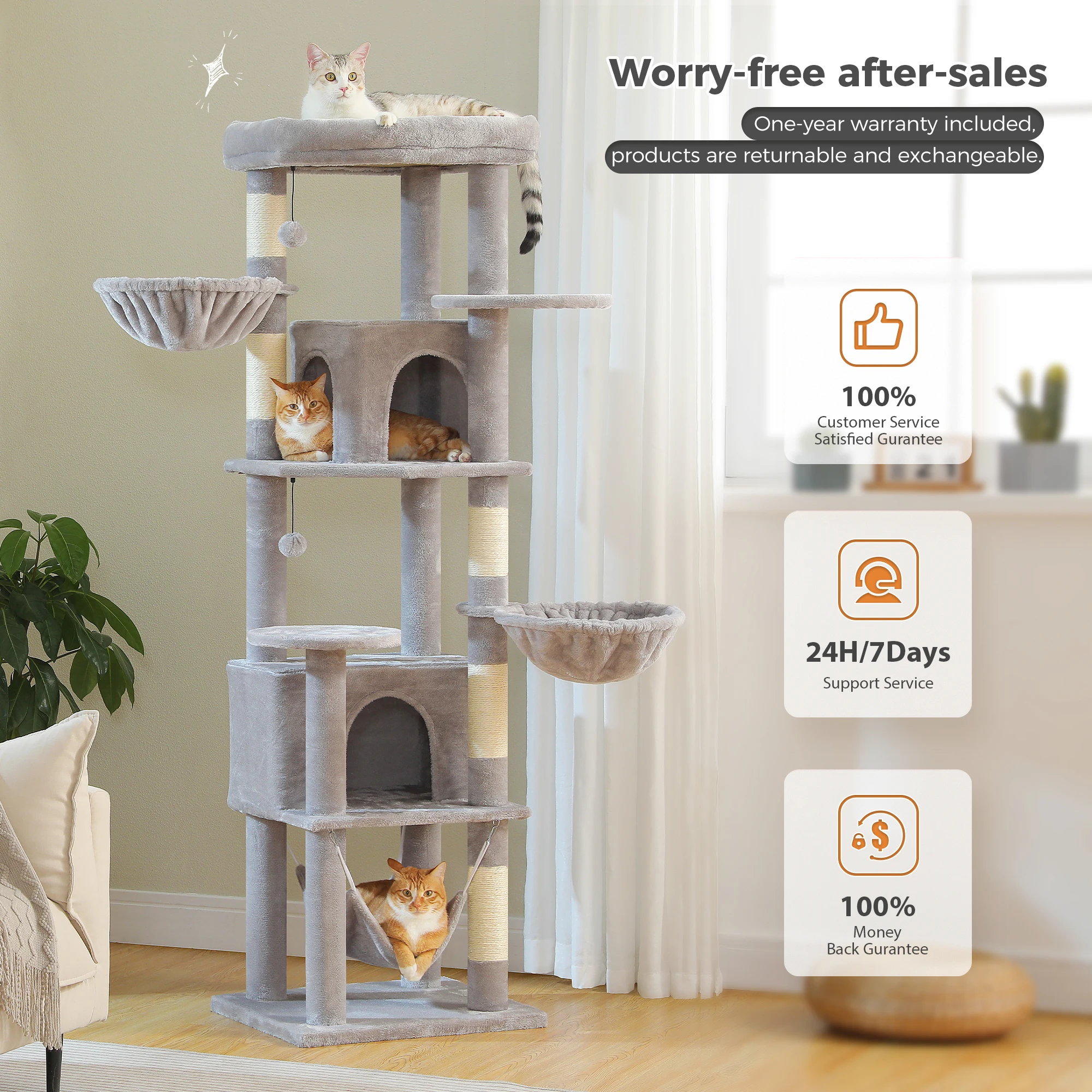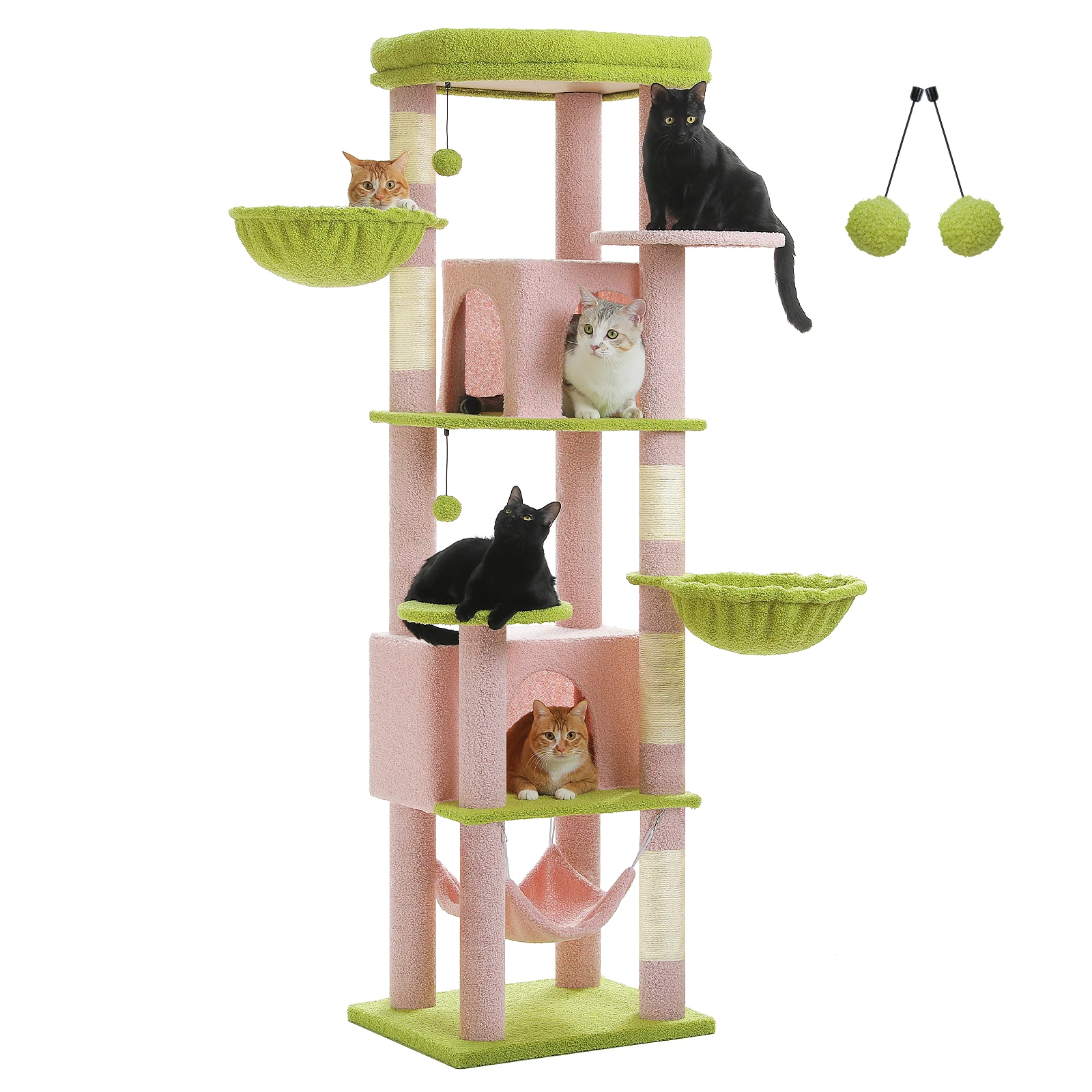 Materiales duraderos y aptos para mascotas:Fabricada con materiales de alta calidad aptos para mascotas, esta torre para gatos está diseñada para resistir el juego activo y el uso diario.Su diseño robusto garantiza una durabilidad duradera, lo que lo convierte en un complemento confiable para cualquier hogar amante de los gatos.