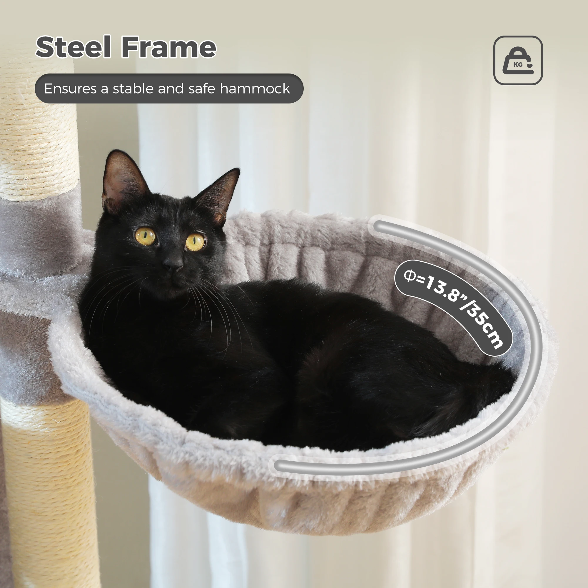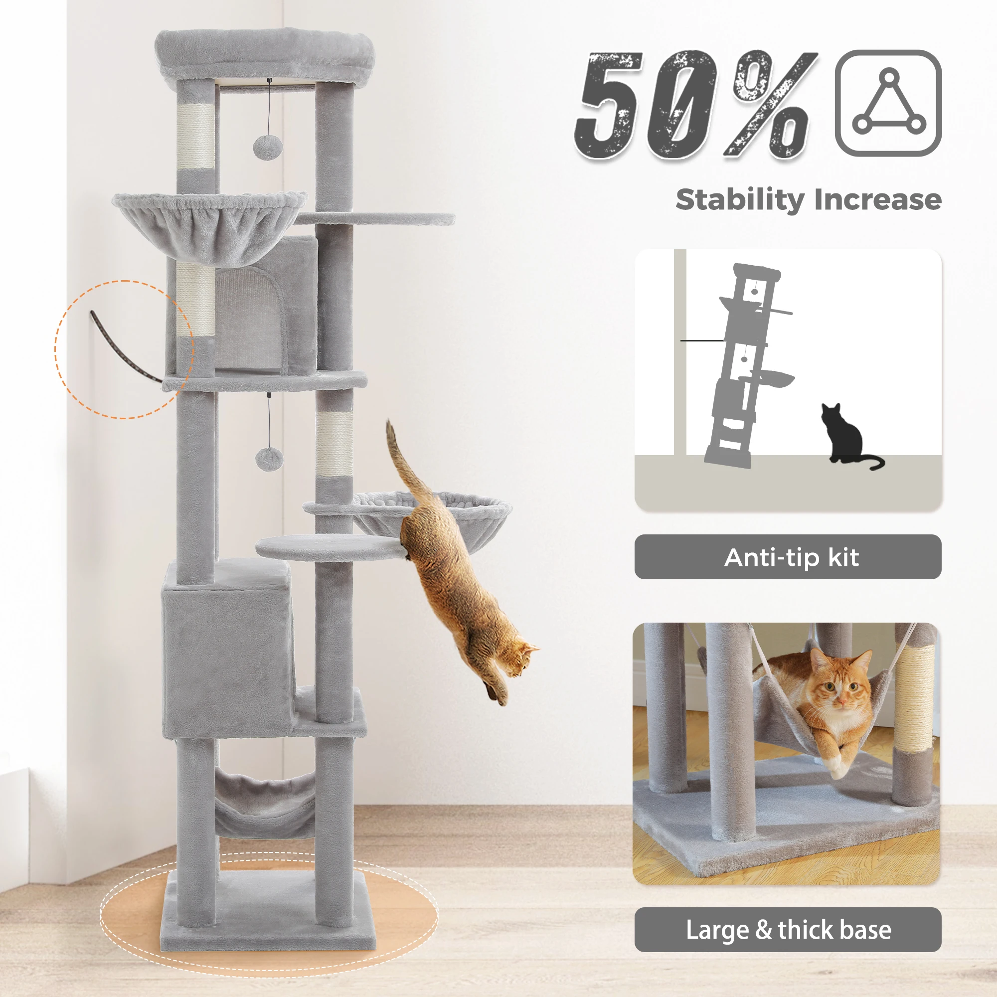 Estabilidad mejorada con base engrosada:Construida con una base reforzada y engrosada, esta torre para gatos garantiza una estabilidad y seguridad superiores.La base robusta evita que se vuelque y se tambalee, lo que permite que sus gatos jueguen y exploren con confianza.