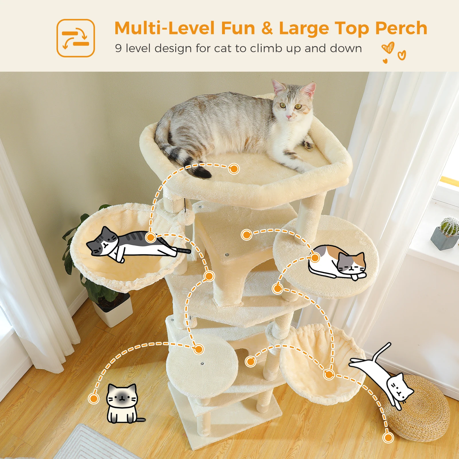 Percha superior extragrande:Con una percha superior de gran tamaño, este marco de escalada para gatos brinda a sus gatos un lugar perfecto para descansar y observar su entorno.La amplia percha es ideal para gatos a los que les encanta estirarse y relajarse mientras disfrutan de una vista elevada.