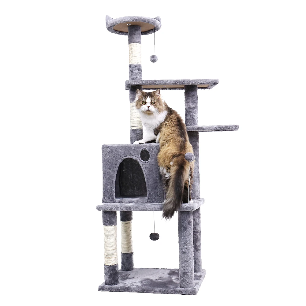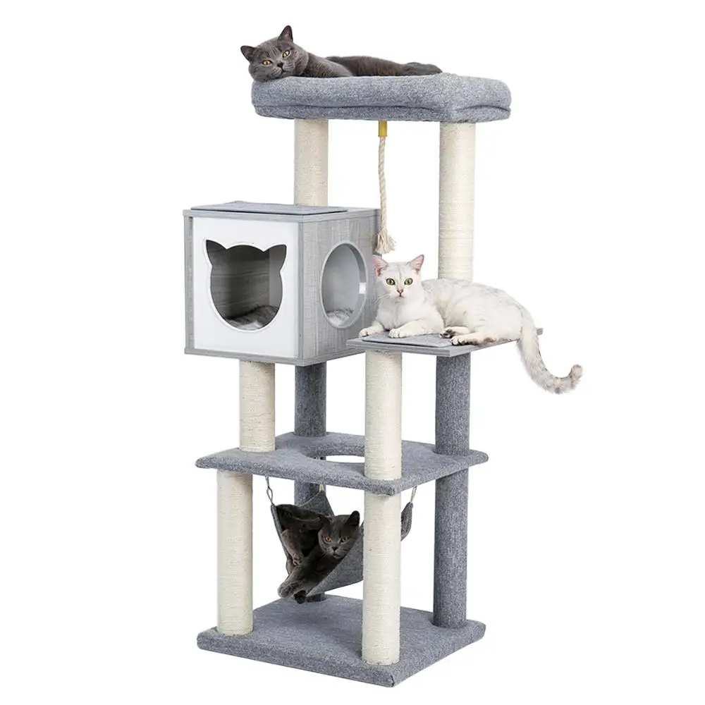 ·Centro de Actividades para gatos: hay 2 casas para gatos, 2 perchas superiores, 1 tabla redonda giratoria de 180 °, 3 postes para rascar cubiertos por sisal gris, 3 postes cubiertos por tela de fieltro gruesa, 2 bolas colgantes... Ofrece a los gatos muchas opciones de acticidad. El diseño de 4 pisos cumple con la naturaleza saltarina del gato. Pueden saltar, descansar o jugar con amigos en él. El agujero de la casa puede conectar un túnel para gatos, dando más placer a los gatos.
