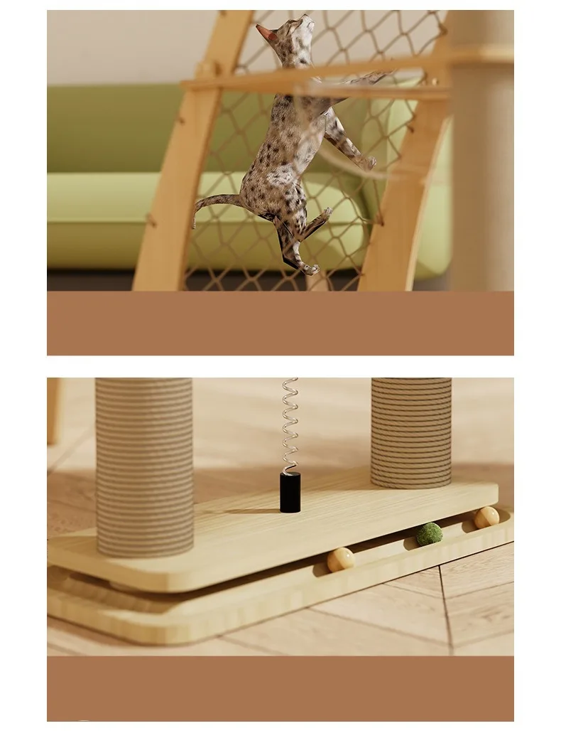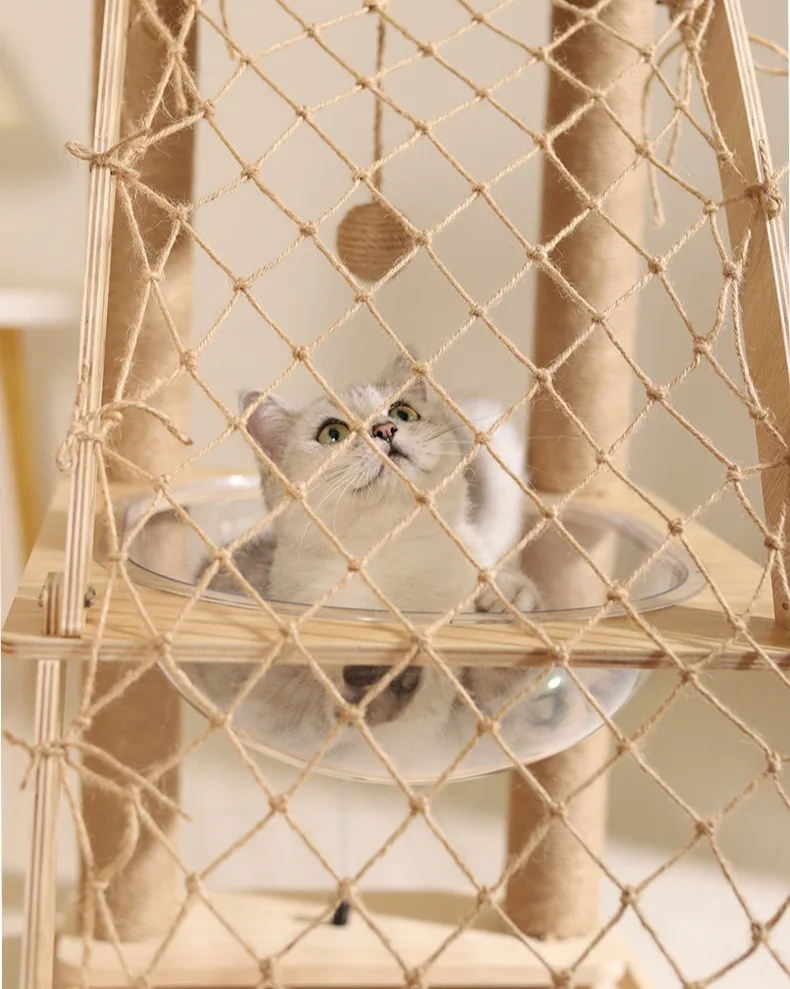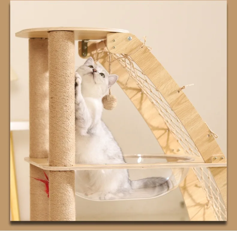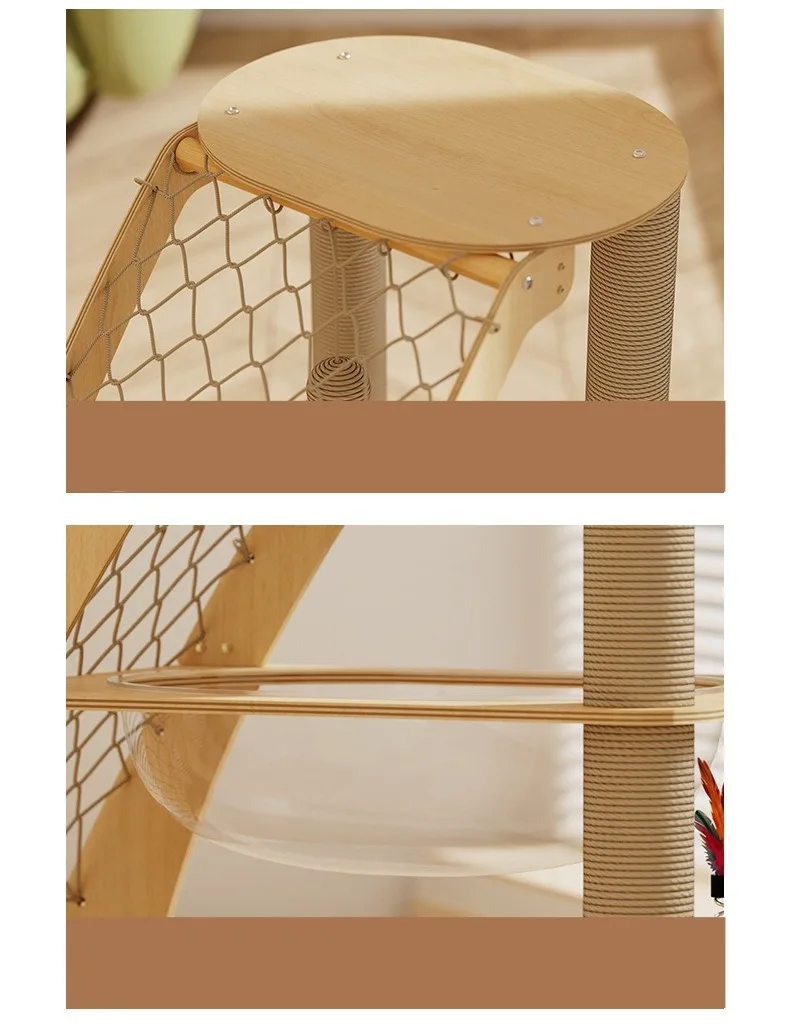 Árbol de madera para gatos con red de escalada, cama transparente para gatos, poste rascador, muebles estables para gatos, casa de juegos de actividades para gatos y gatitos de interior