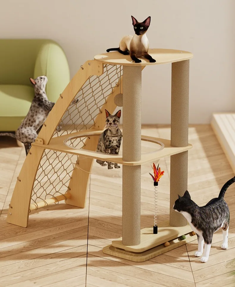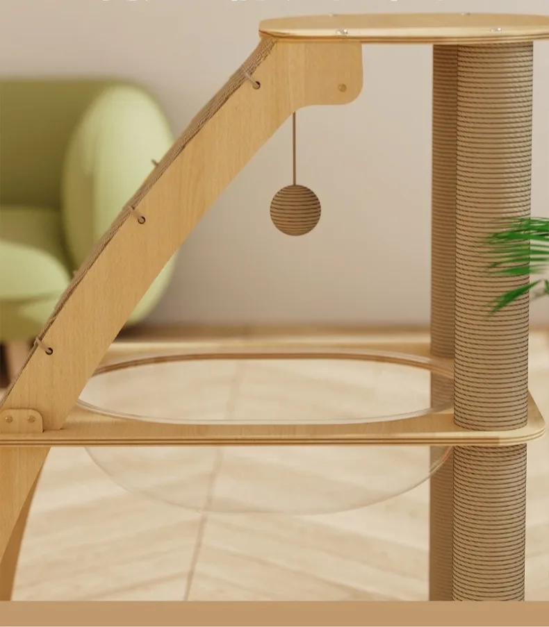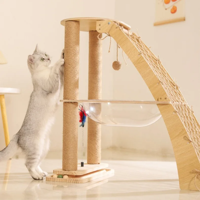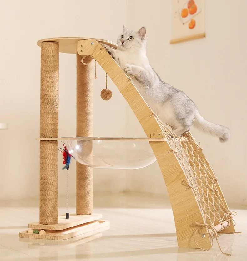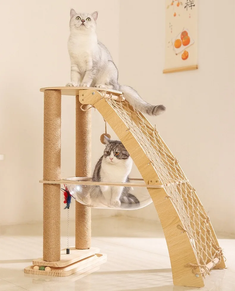 Árbol de madera para gatos con red de escalada, cama transparente para gatos, poste rascador, muebles estables para gatos, casa de juegos de actividades para gatos y gatitos de interior