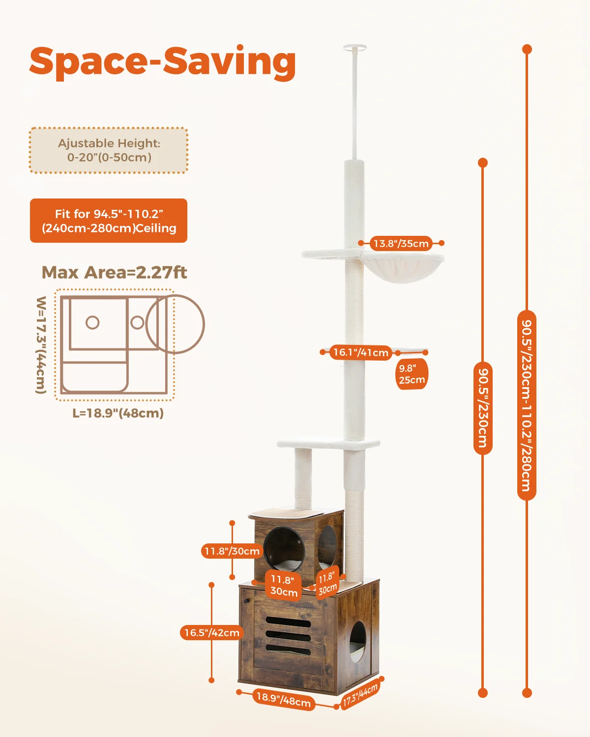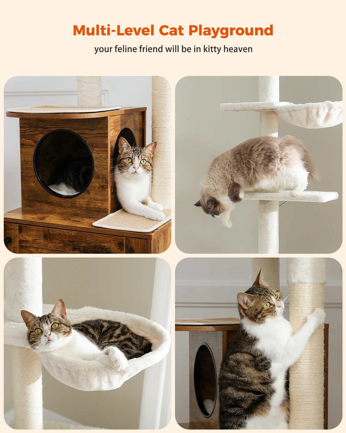 Árbol para gatos de varios niveles ajustable de 230-280cm de altura con poste rascador de condominio, torre de madera para gatos con caja de arena plegable para gatos, juguete para gatos