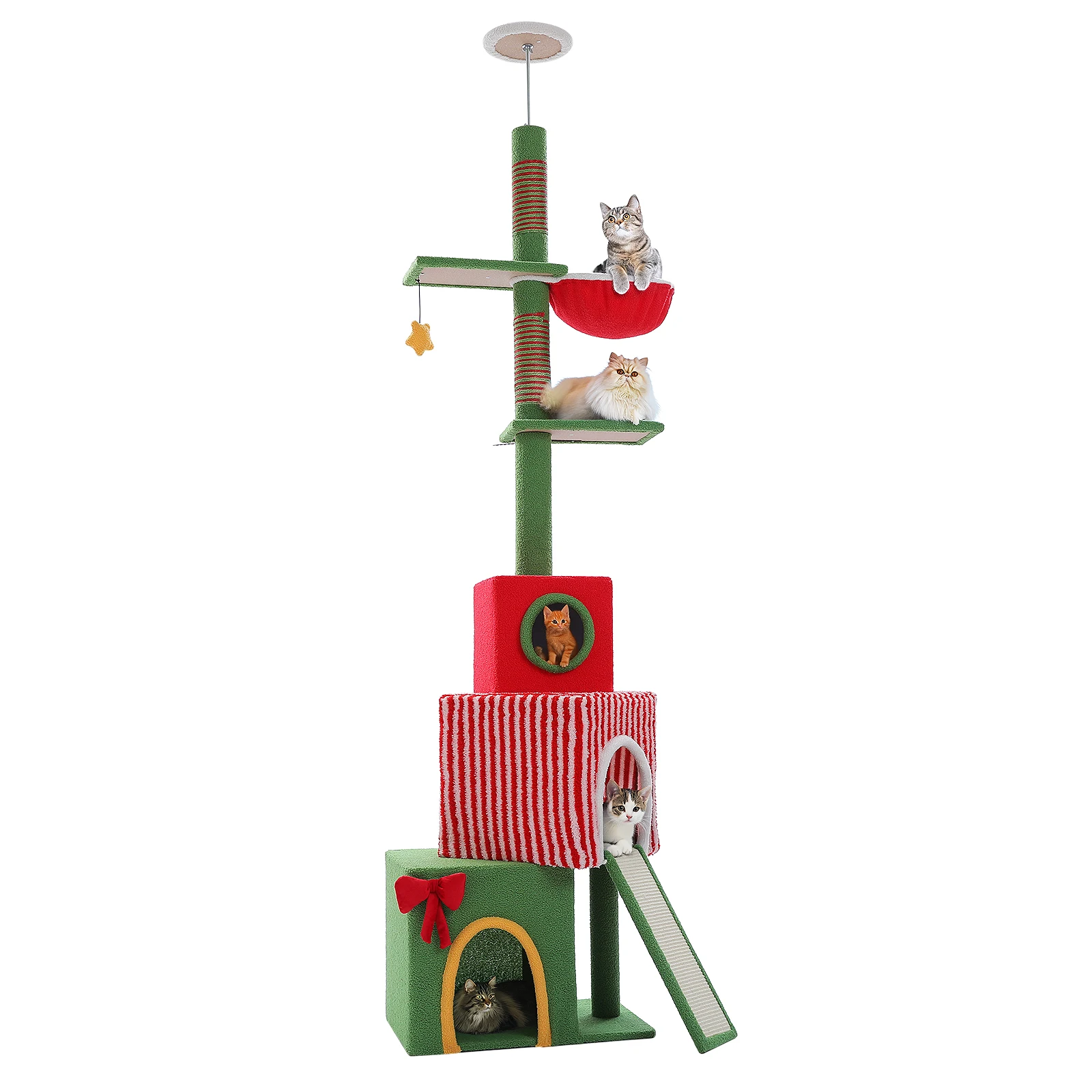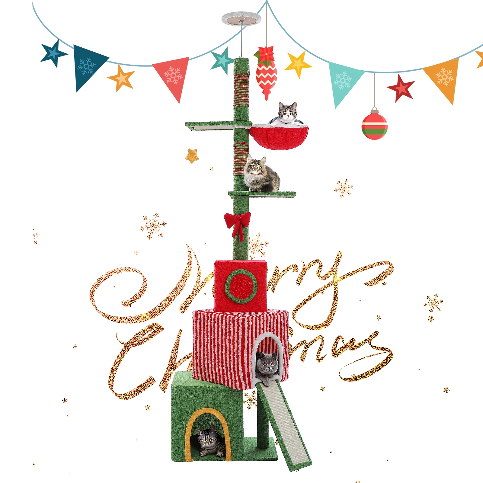 Árbol para gatos de Navidad, torre para gatos de piso a techo de 211-276 cm con condominios rojos y verdes, bolas colgantes en forma de estrella para gatos grandes, juguetes para gatos