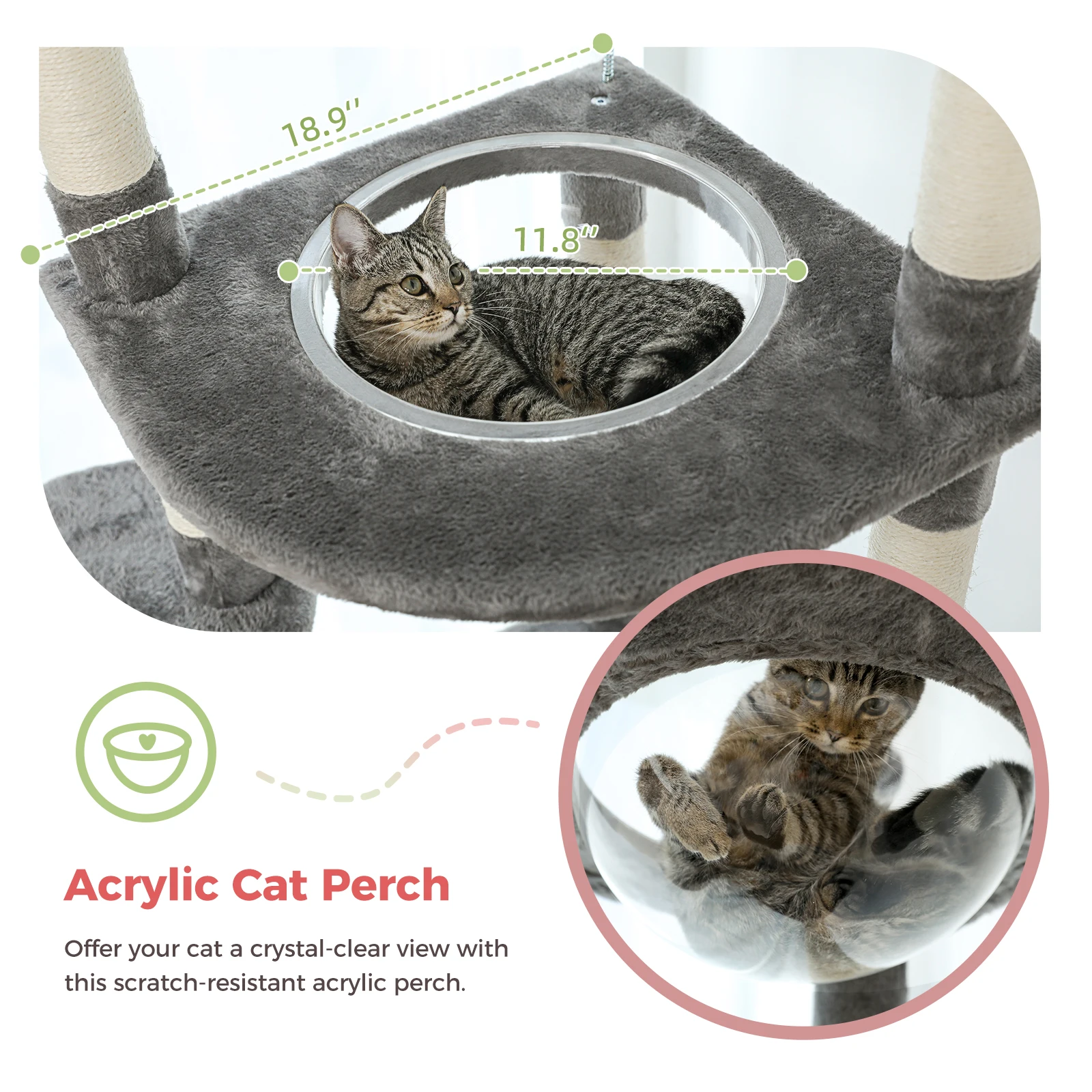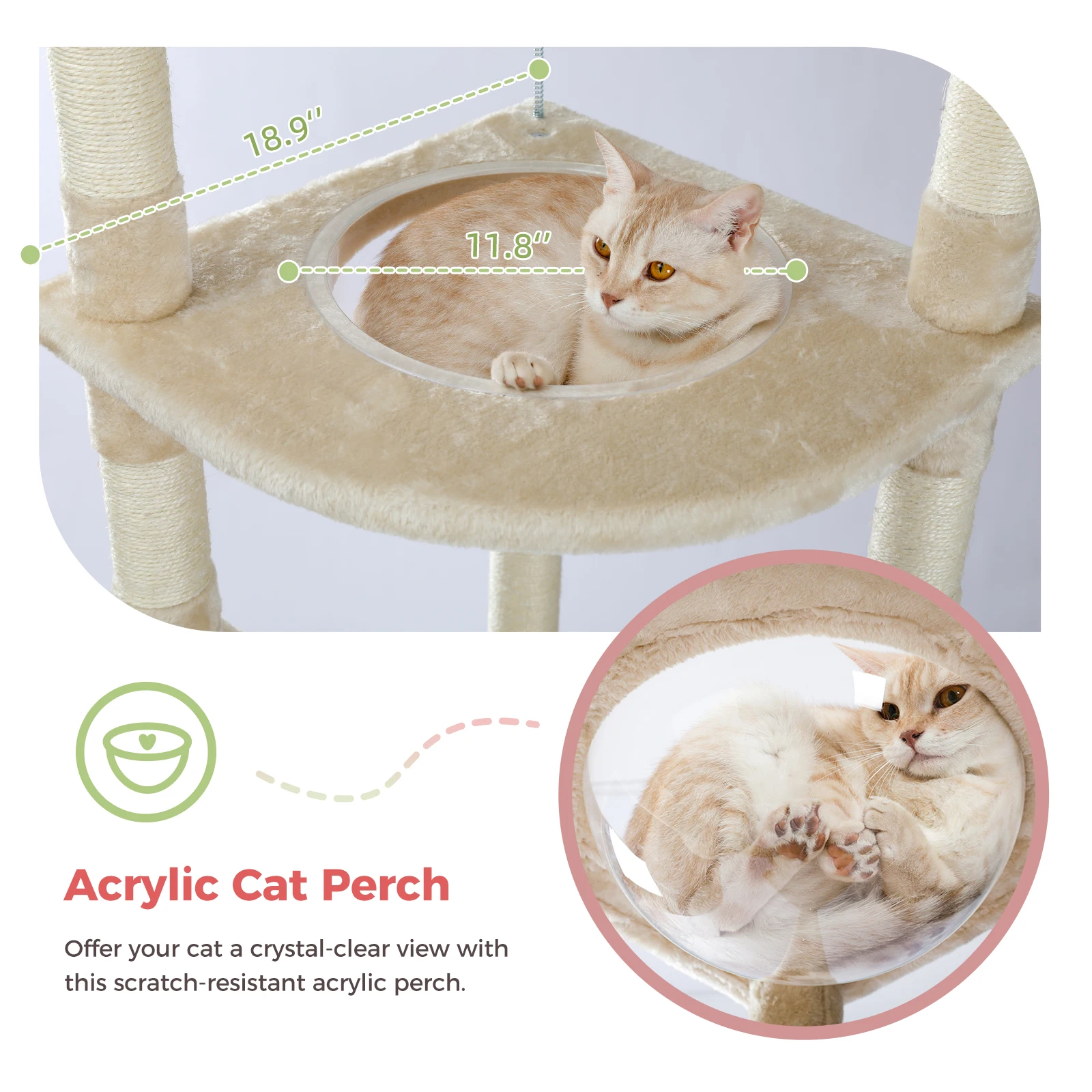 ÁREA DE REPOSIOS IDEAL:No importa si sus gatos necesitan descansar en la cuna, tomar una siesta privada en el acogedor condominio, abrazarse en la lujosa hamaca o simplemente tomar un descanso en las perchas, podrían encontrar su zona exclusiva en poco tiempo.El nido de acrílico elevado no solo es una cama moderna para tus amigos peludos, sino también una plataforma de observación para disfrutar de la magnífica vista desde la ventana.