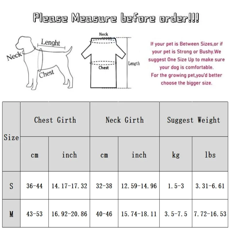 S: Pecho 36-44cm/14,17-17,32''; Cuello 32-38cm/12,59-14,96''; Peso sugerido 1,5-3 kg/3,31-6,61 lbs.