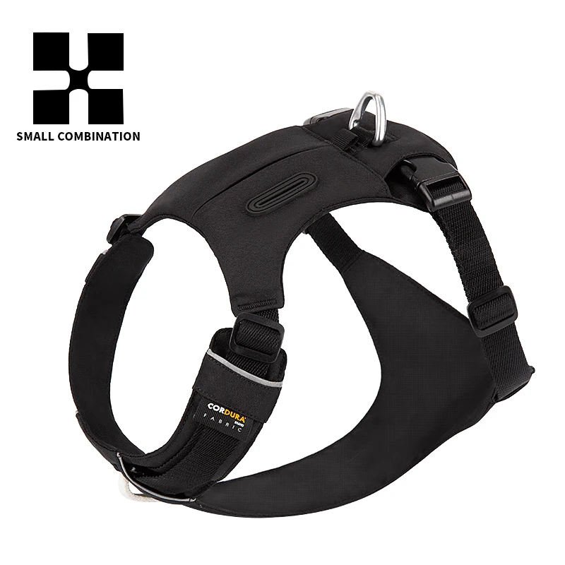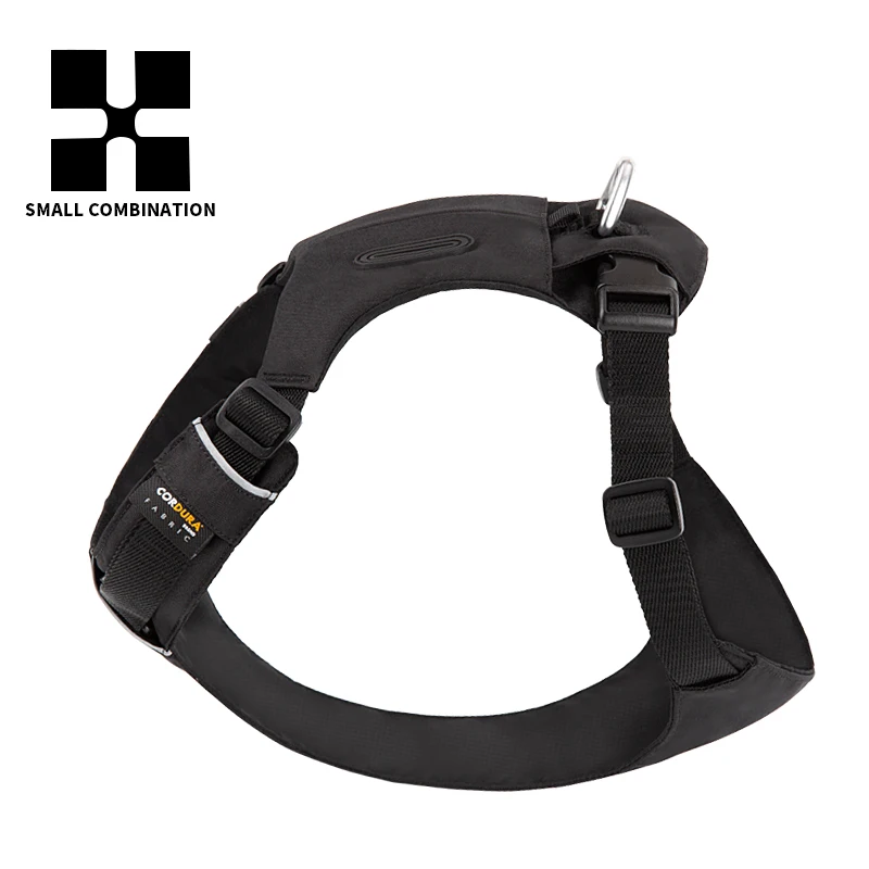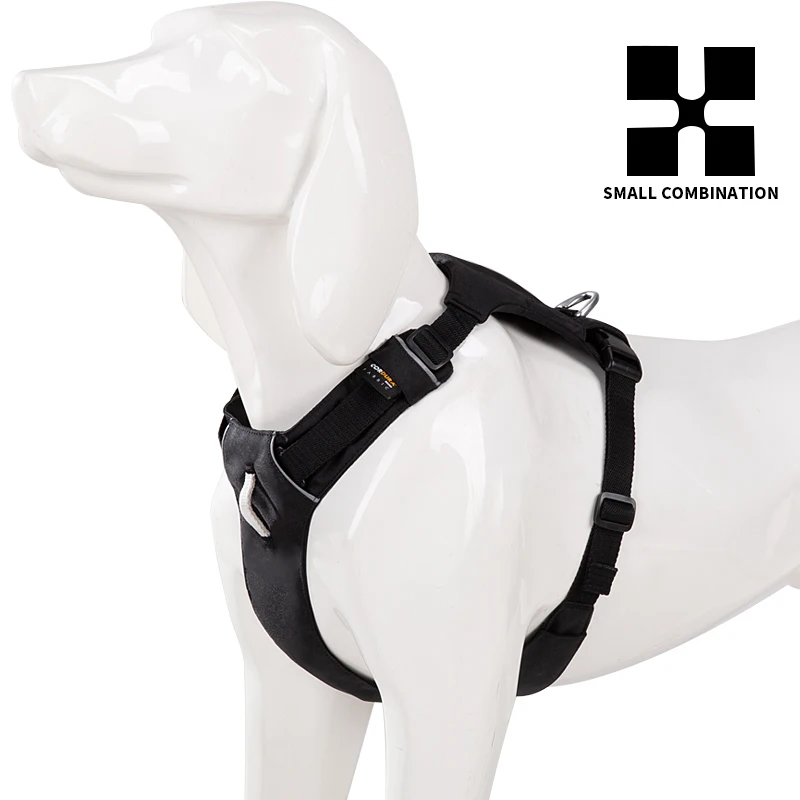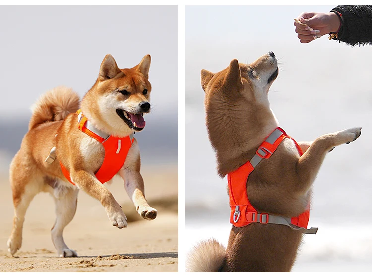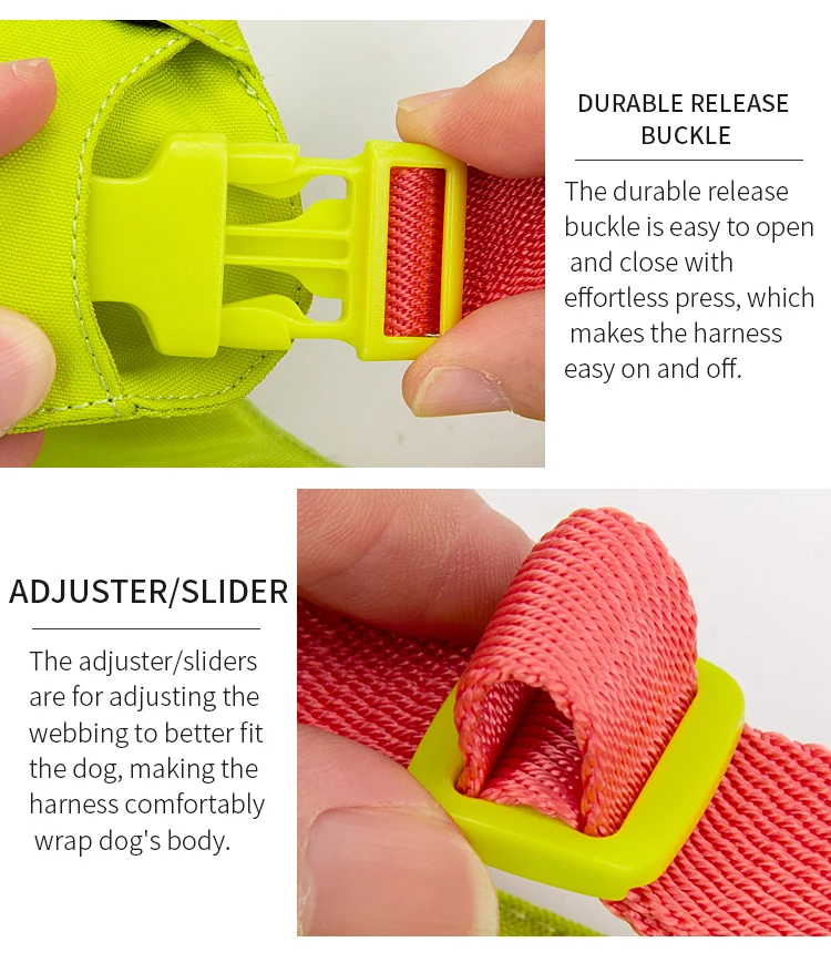 1. Los accesorios ligeros de aluminio de aviación en la correa del cuello hacen que el arnés del perro sea más fácil de poner y quitar. No es necesario pasar por la cabeza del perro ni hacer ningún ajuste al ponerlo o quitarlo.