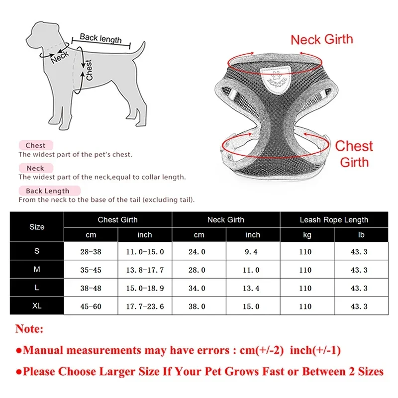 XL: Pecho: 45-60 cm, 17,7-23,6 pulgadas; Cuello: 38 cm, 15,0 pulgadas; Longitud de la cuerda de la correa: 110 cm, 43 pulgadas.