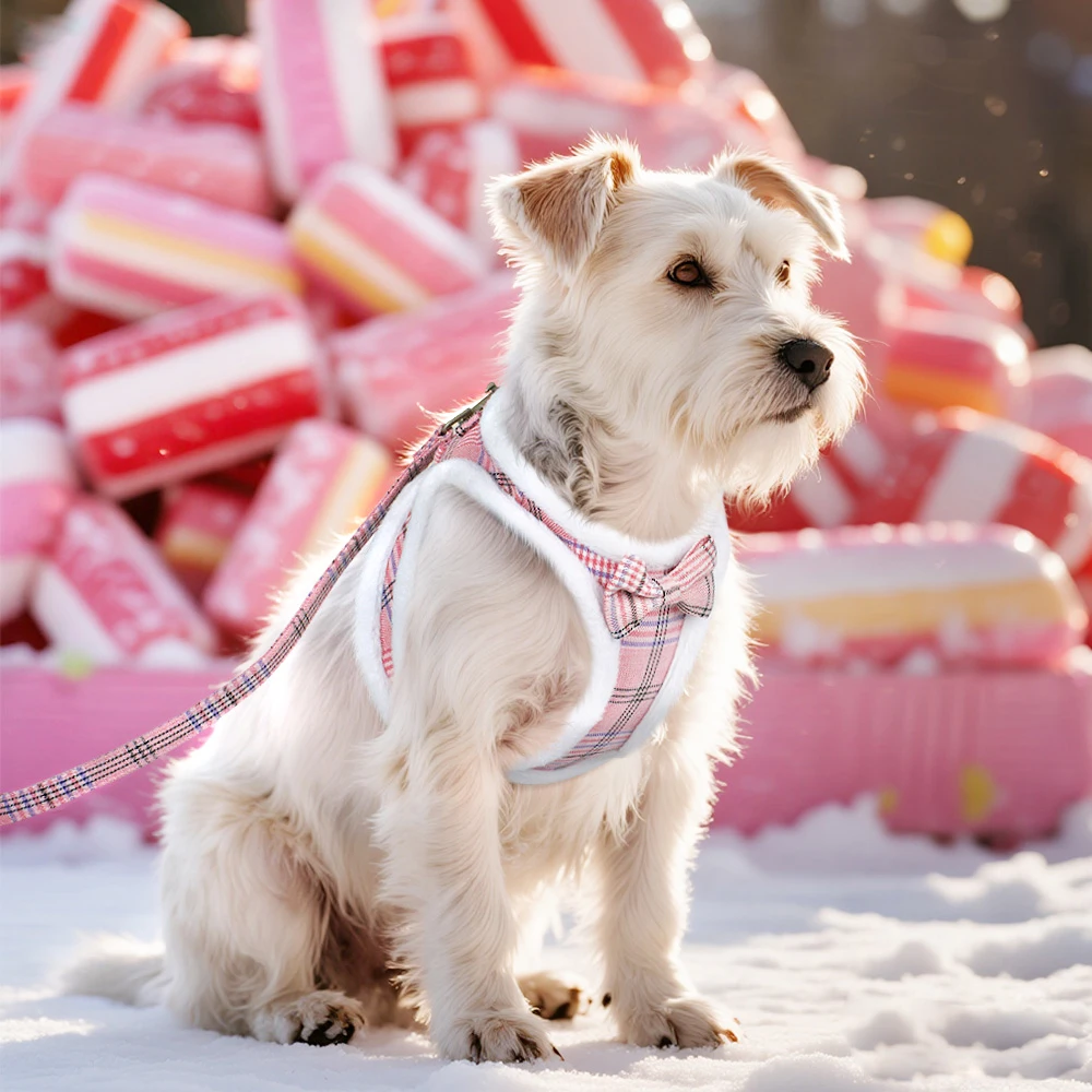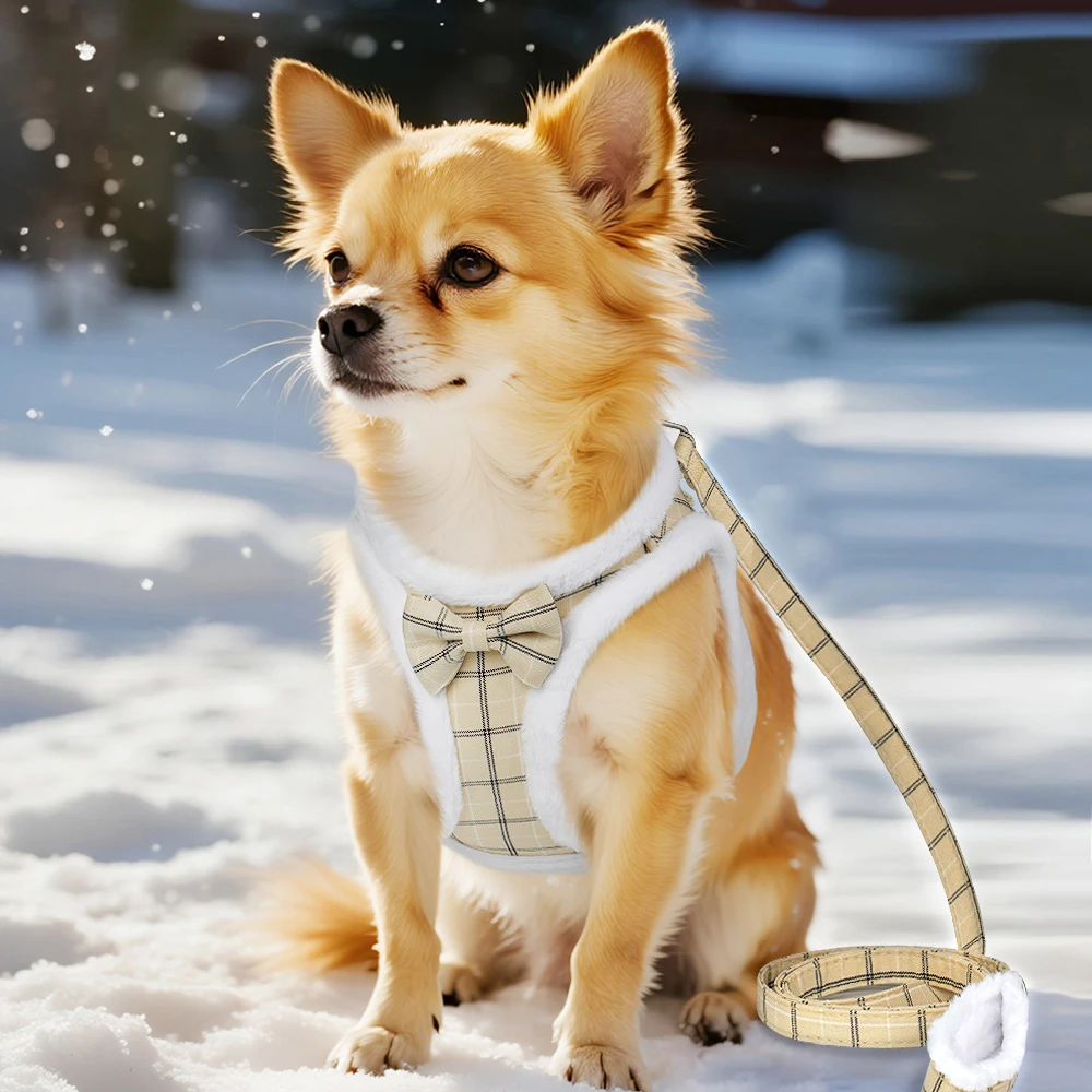 Arnés cálido de invierno para perros, conjunto de correa, arnés acolchado de piel suave para perros, chaleco sin tirones, arnés ajustable para mascotas con correa de plomo, lindo lazo