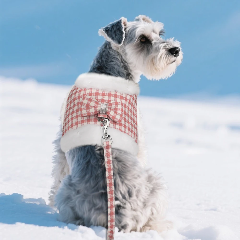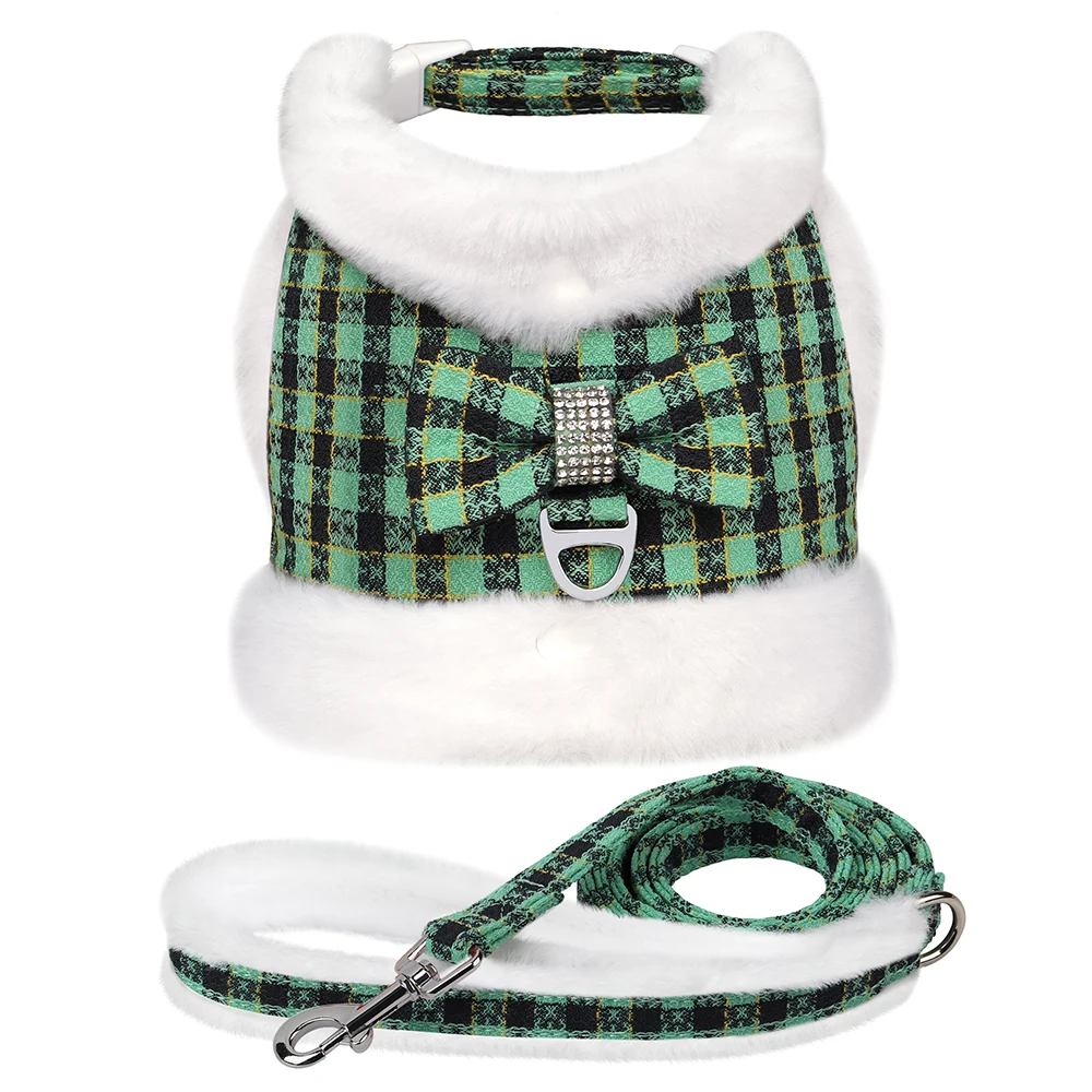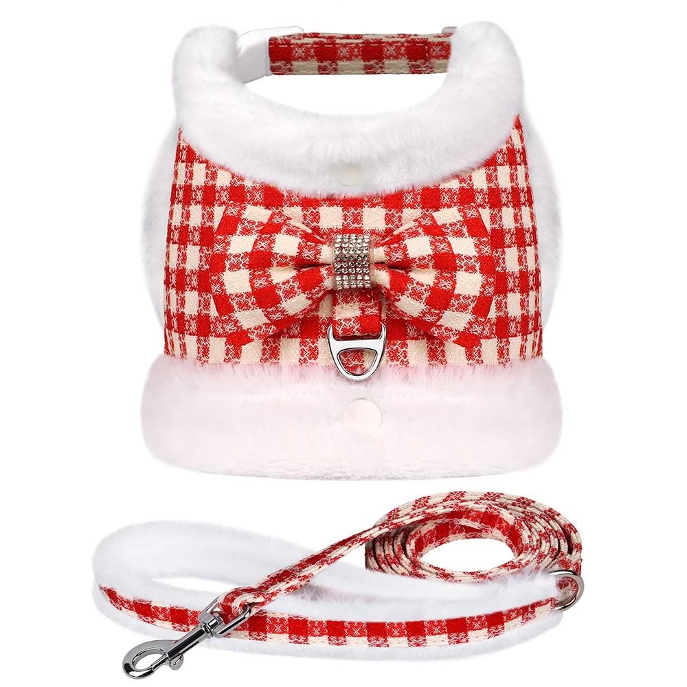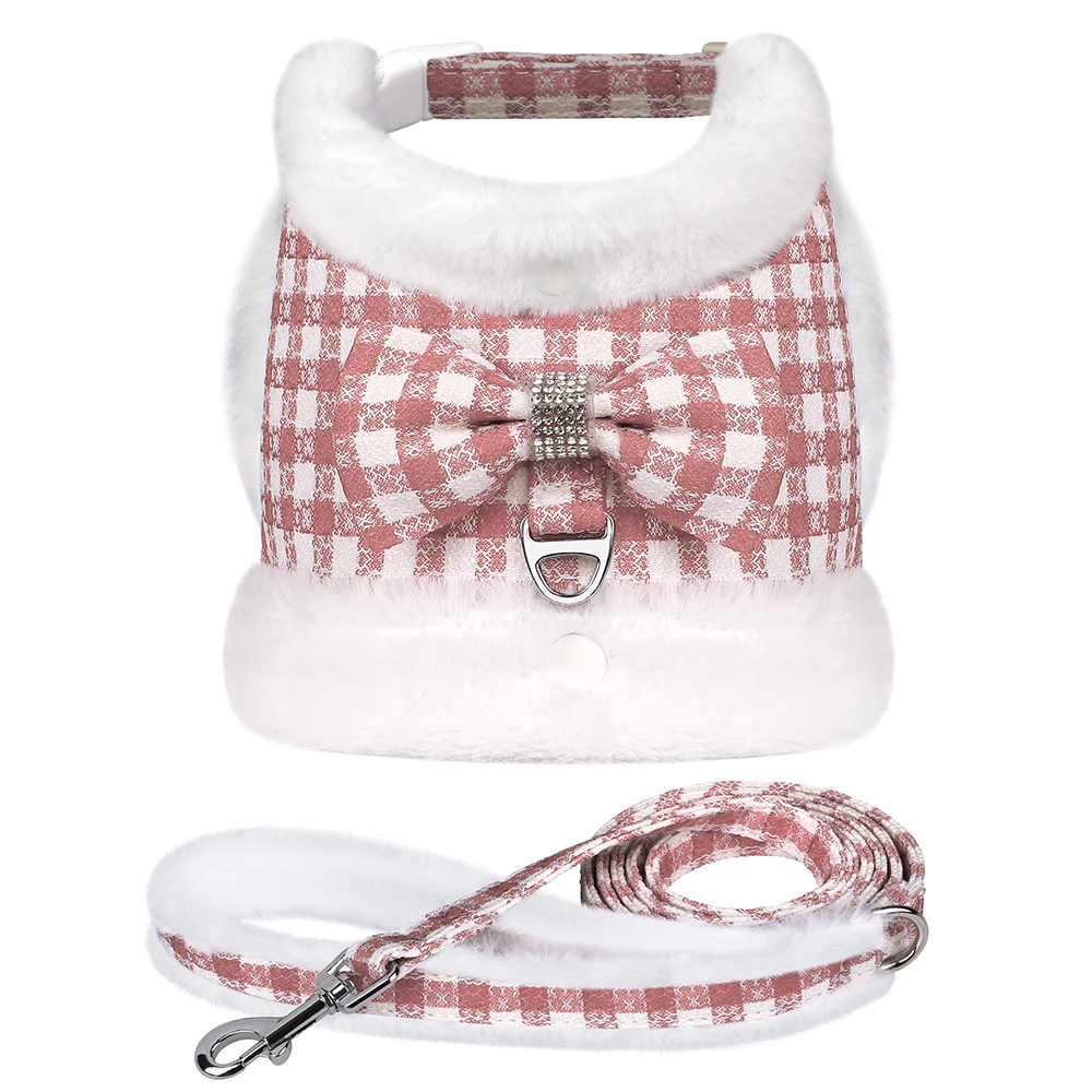 Conjunto de correa y arnés para perros suave y cálido, Arneses para perros a cuadros con Collar de piel extraíble, chaleco bonito con lazo para mascotas, plomo duradero para perros de inviernoColores:Rosa, azul, verde, rojo, negro