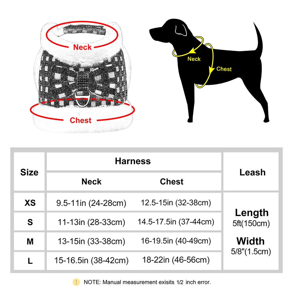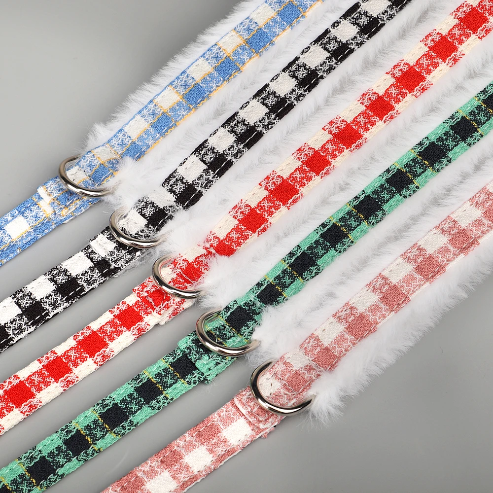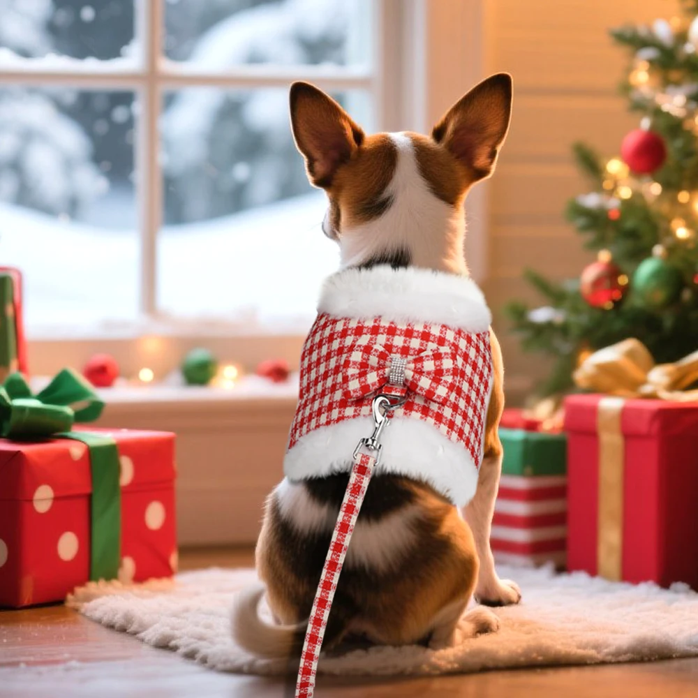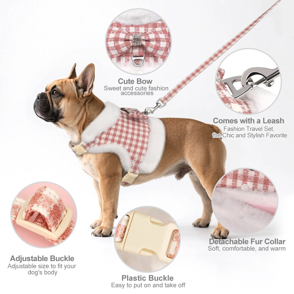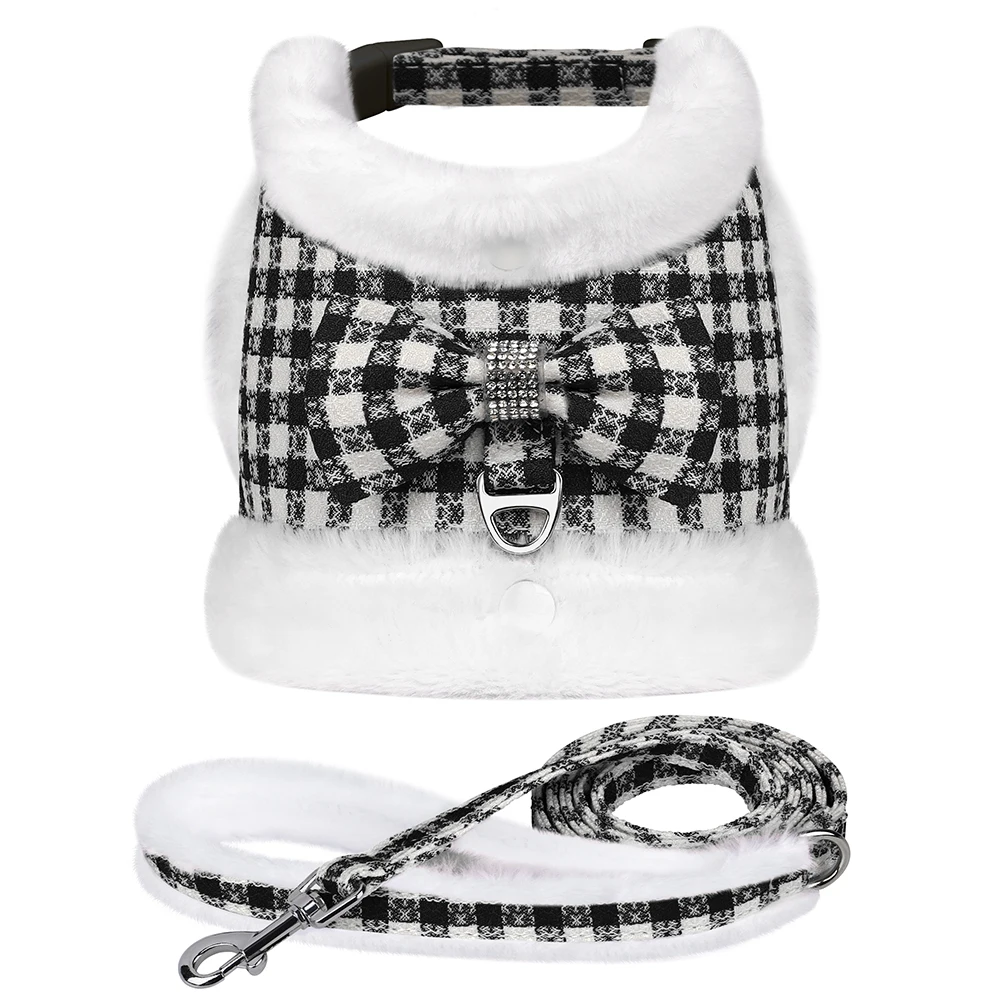 Conjunto de correa y arnés para perros suave y cálido, Arneses para perros a cuadros con Collar de piel extraíble, chaleco bonito con lazo para mascotas, plomo duradero para perros de inviernoColores:Rosa, azul, verde, rojo, negro