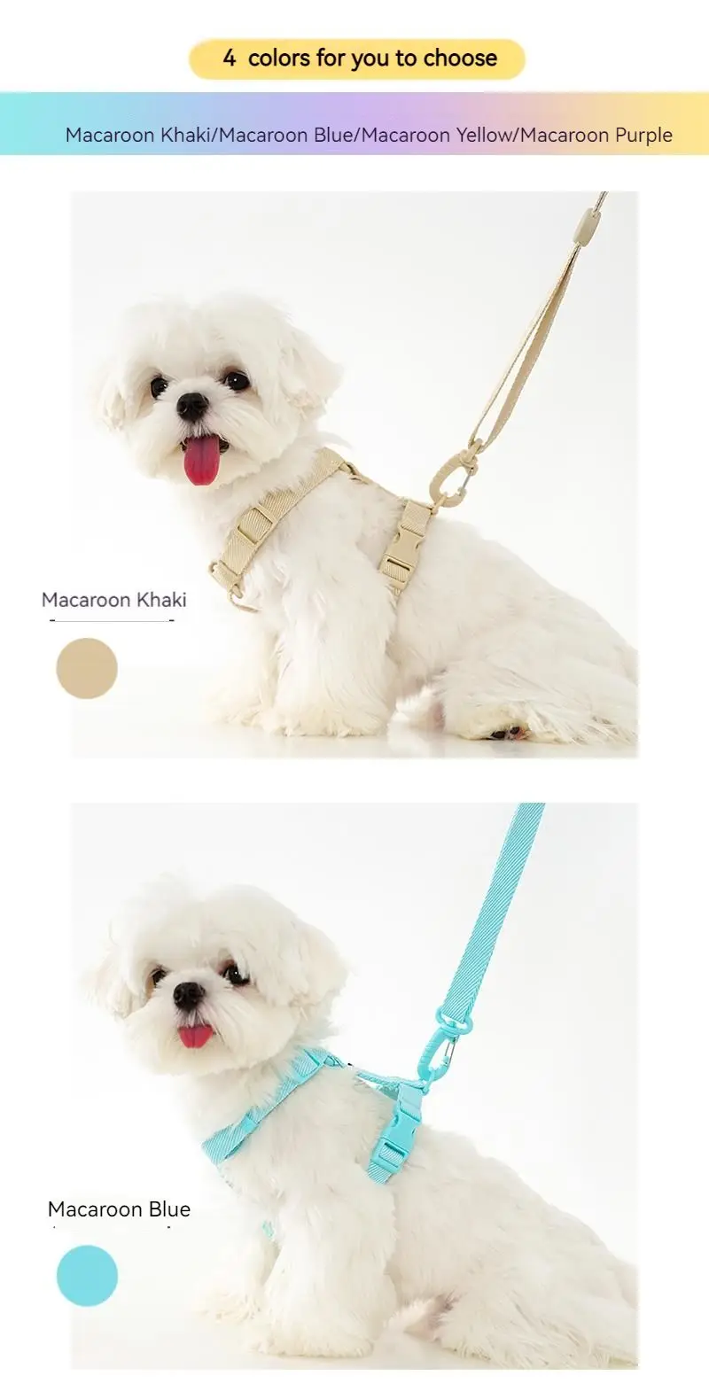 El arnés es bueno, pero más pequeño de lo que esperaba. El ancho de la correa es de menos de 2 cm. El material es agradable y el color es hermoso. Lo compré para un Cavalier King Charles Spaniel, talla M.
