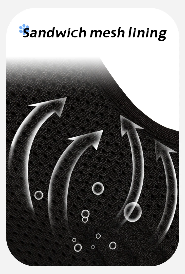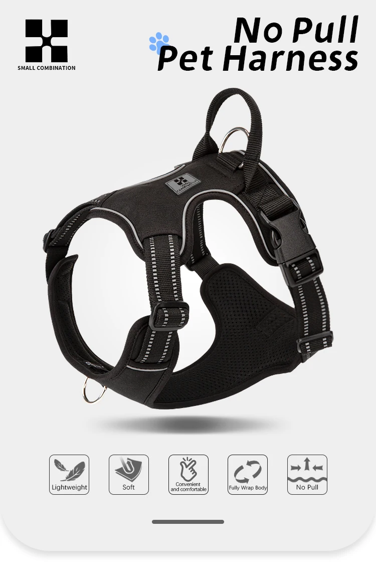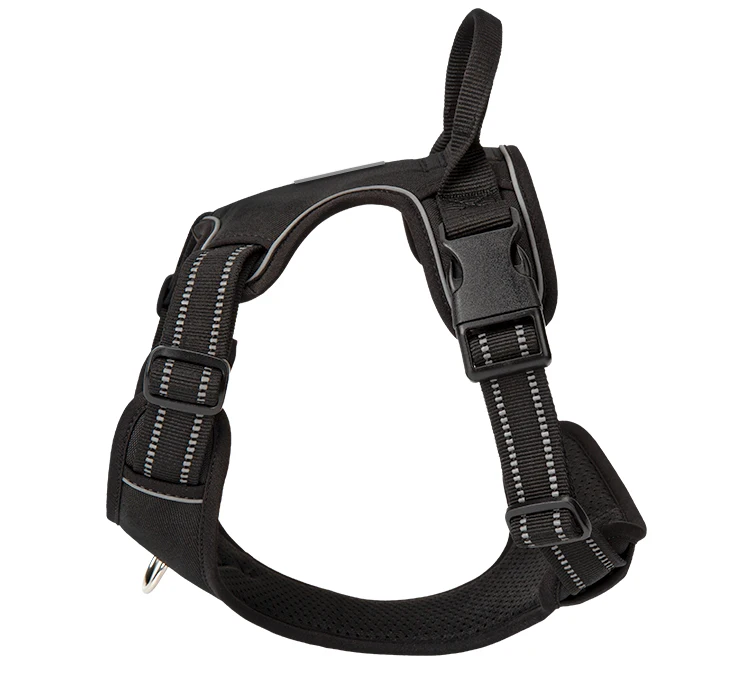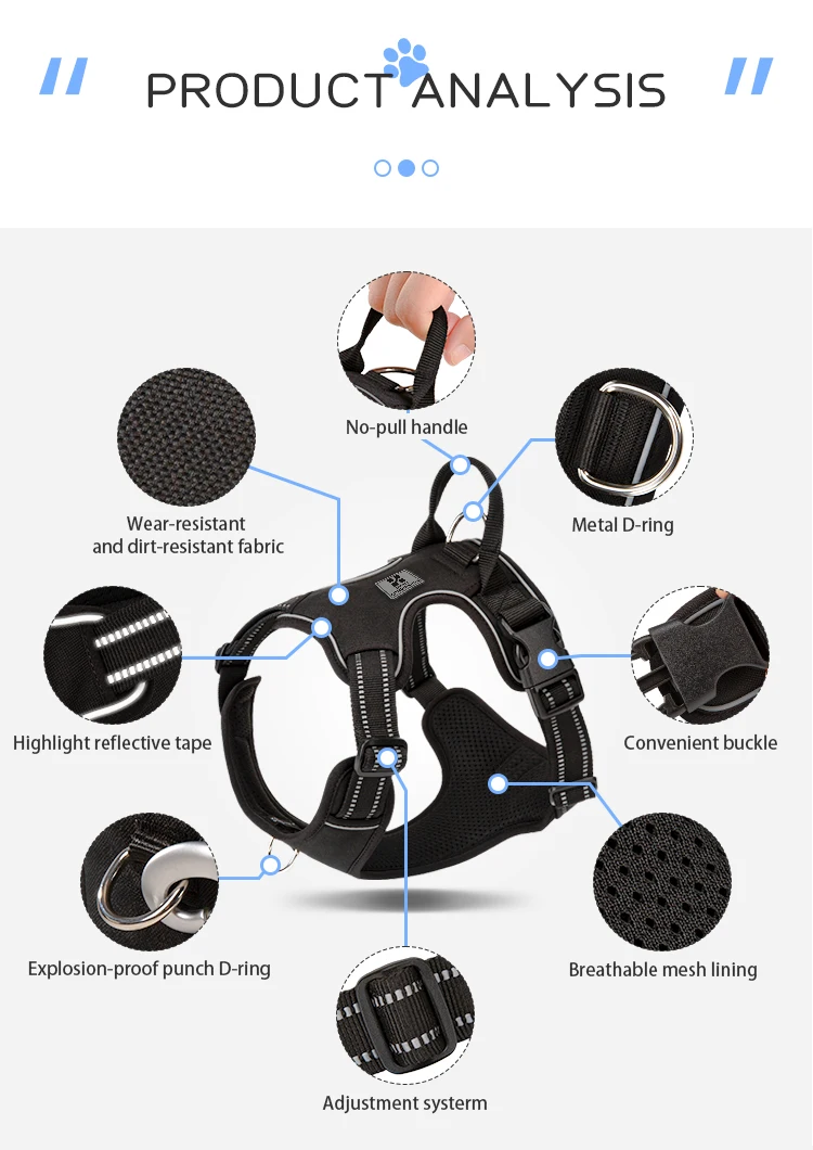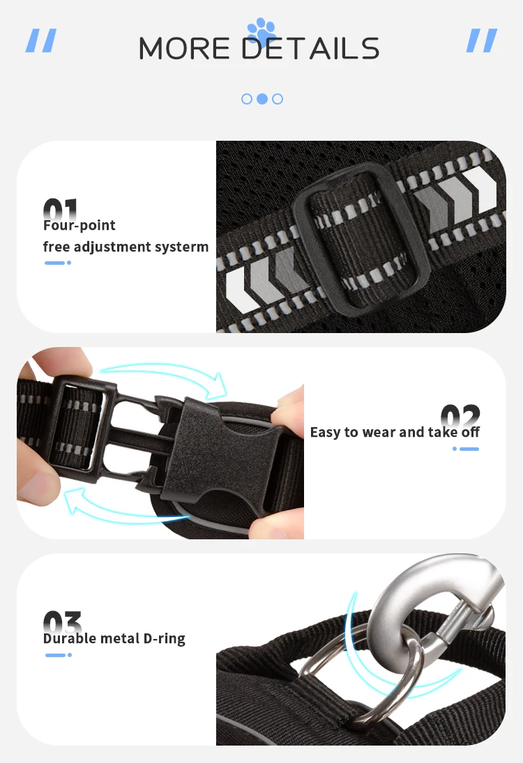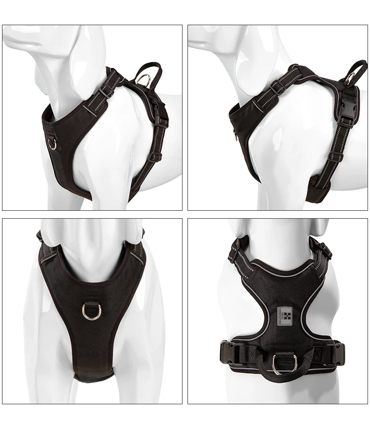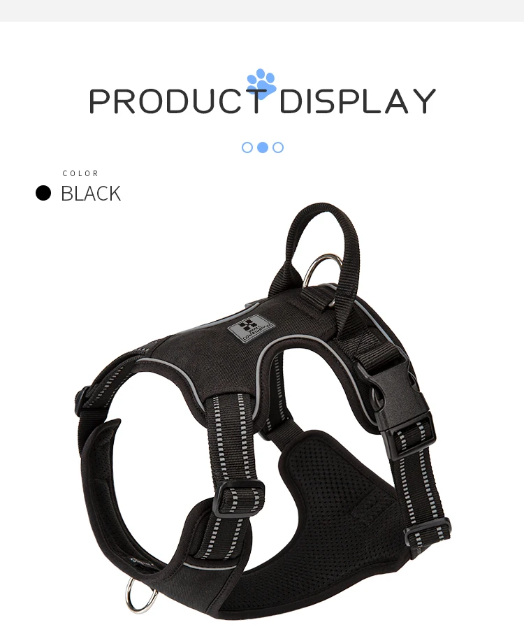 2 resistentes puntos de fijación de correa de metal con correas reforzadas, clip frontal para extraer tirones y espalda para paseos relajados.Diseño ergonómico, la presión de tracción se distribuye uniformemente al cuerpo para evitar asfixia.