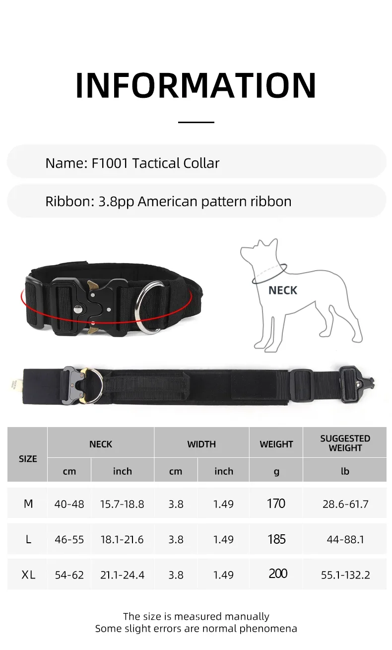 El collar esta muy bien hecho y el cierre es comodo y seguro. Ante la duda de talla, es mejor pedir una talla mas grande pues esto no afecta al rendimiento. Yo pedi XL para un boxer y le queda perfecto. Muy recomendable este vendedor.