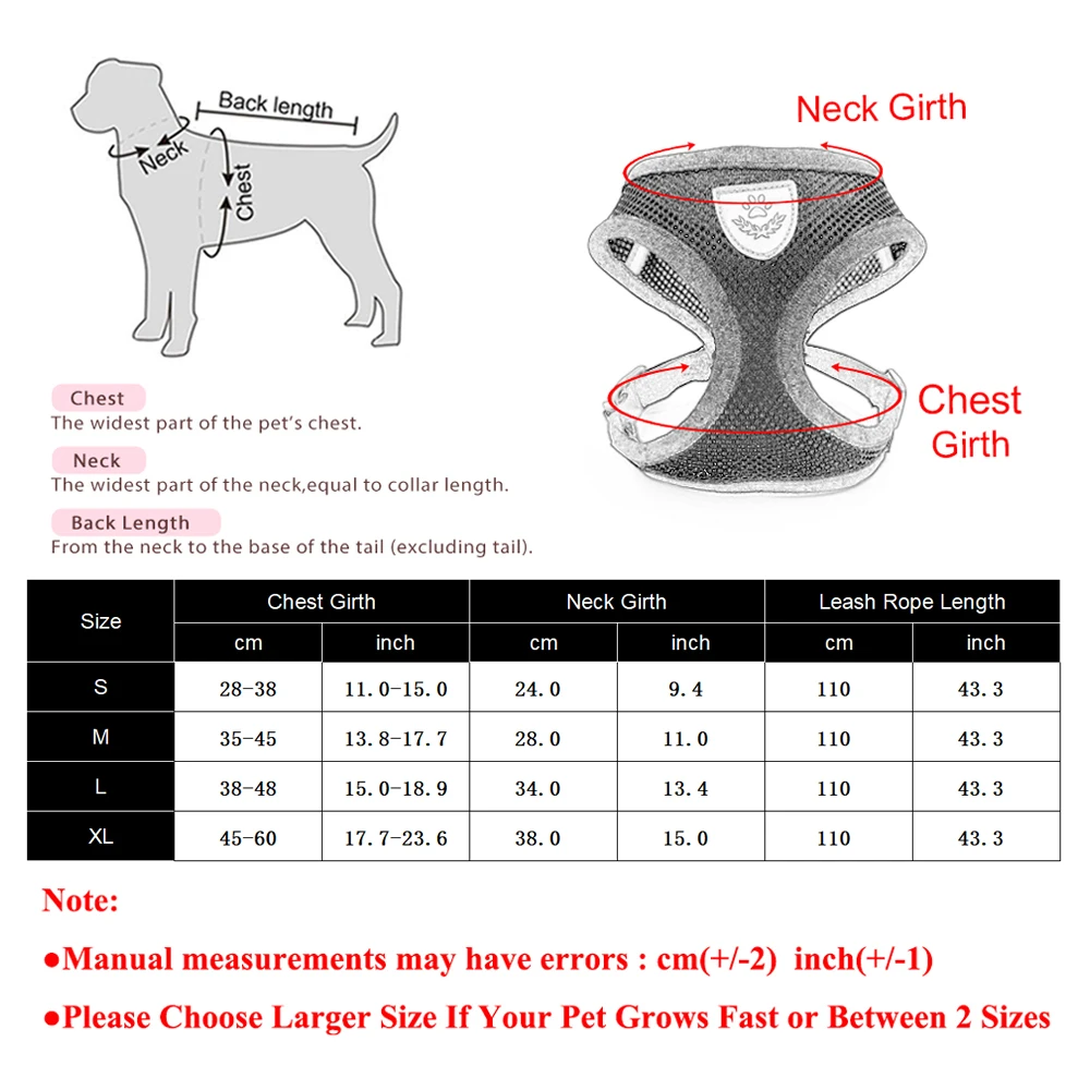 L: Pecho: 38-48 cm, 15,0-18,9 pulgadas; Cuello: 34 cm, 13,4 pulgadas; Longitud de la cuerda de la correa: 110 cm, 43 pulgadas;