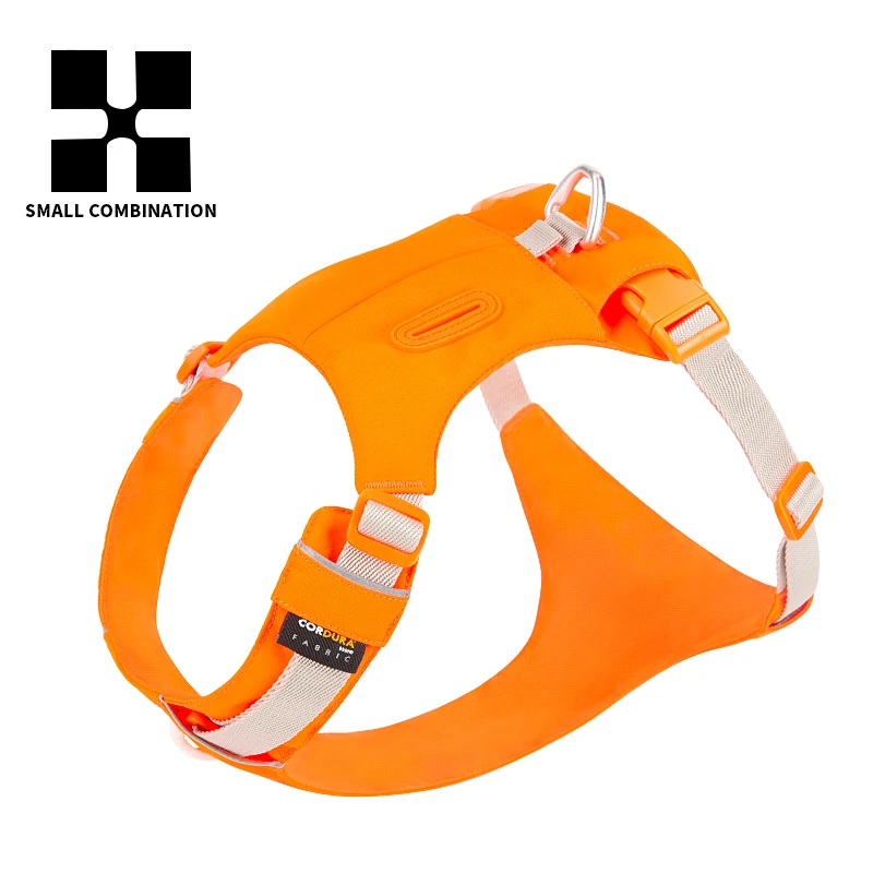 1. Los accesorios ligeros de aluminio de aviación en la correa del cuello hacen que el arnés del perro sea más fácil de poner y quitar. No es necesario pasar por la cabeza del perro ni hacer ningún ajuste al ponerlo o quitarlo.