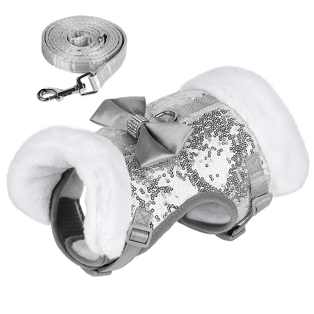 Arnés de perro suave y cálido, conjunto de correa, lindo lazo, arnés para cachorros y gatos, chaleco, arnés de lentejuelas ostentosas, plomo de 5 pies para perros pequeños y medianos y gatos