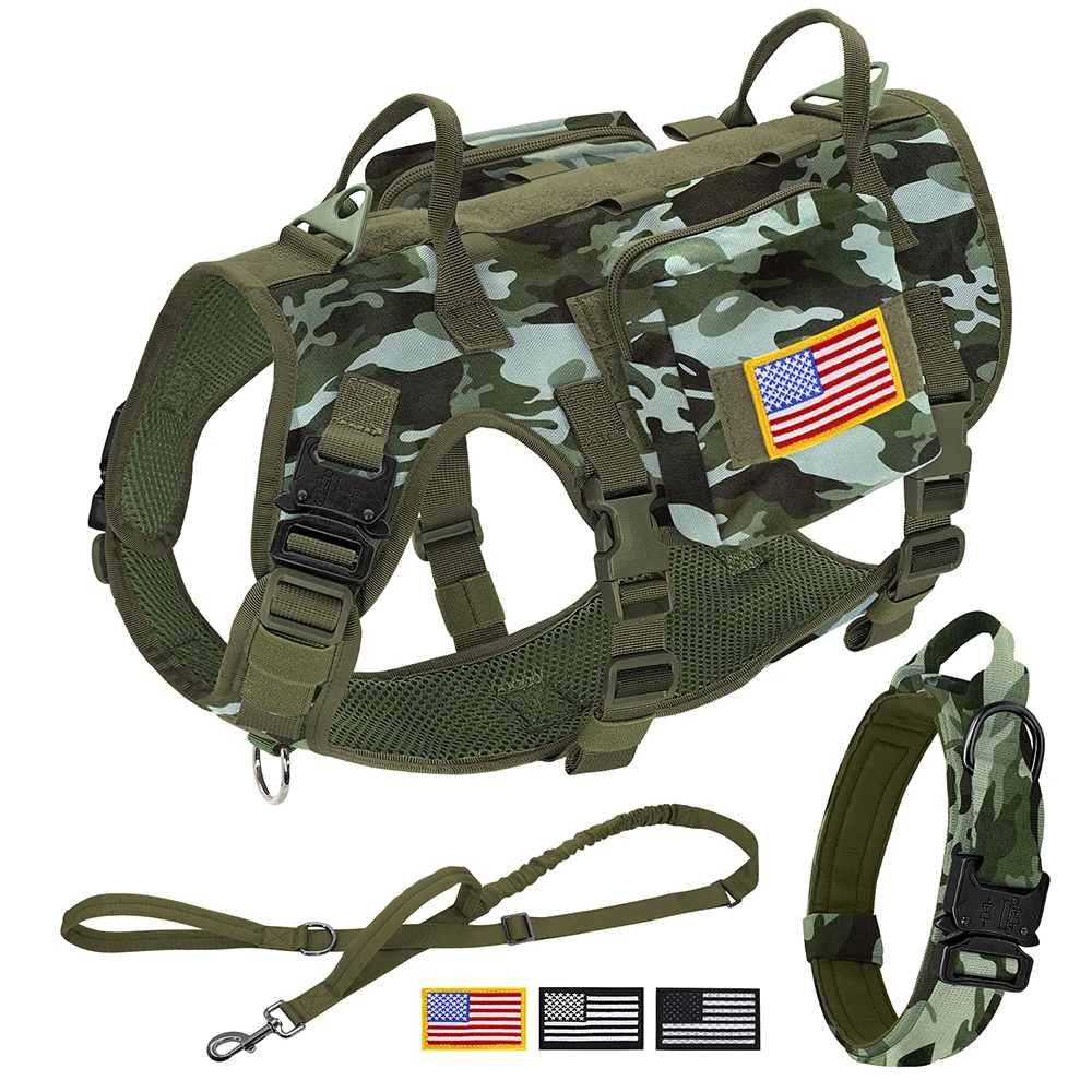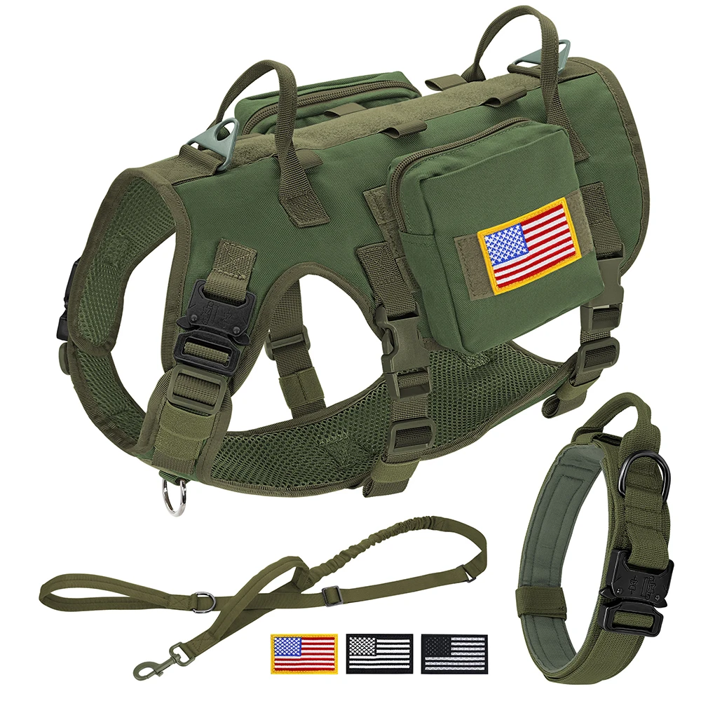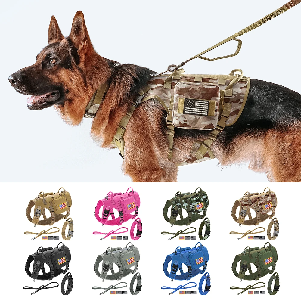Conjunto de correa y arnés táctico para perros, chaleco para mascotas de entrenamiento militar con bolsas, banderas, collares duraderos para perros grandes, pastor alemán
