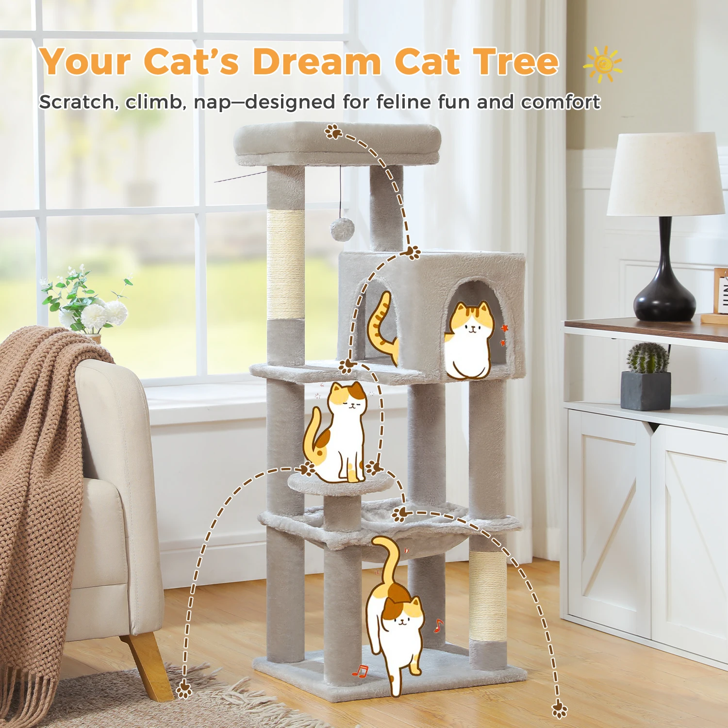Solución duradera para rascar: Equipado con postes rascadores de sisal natural, ideales para que los gatos afilen sus garras, protegiendo sus muebles mientras mantienen sus patas sanas y activas.La textura rugosa del sisal imita la sensación de la corteza del árbol, a los gatos de la superficie les encanta rascarse naturalmente y la construcción robusta garantiza que los postes puedan soportar el uso regular sin deshilacharse fácilmente.
