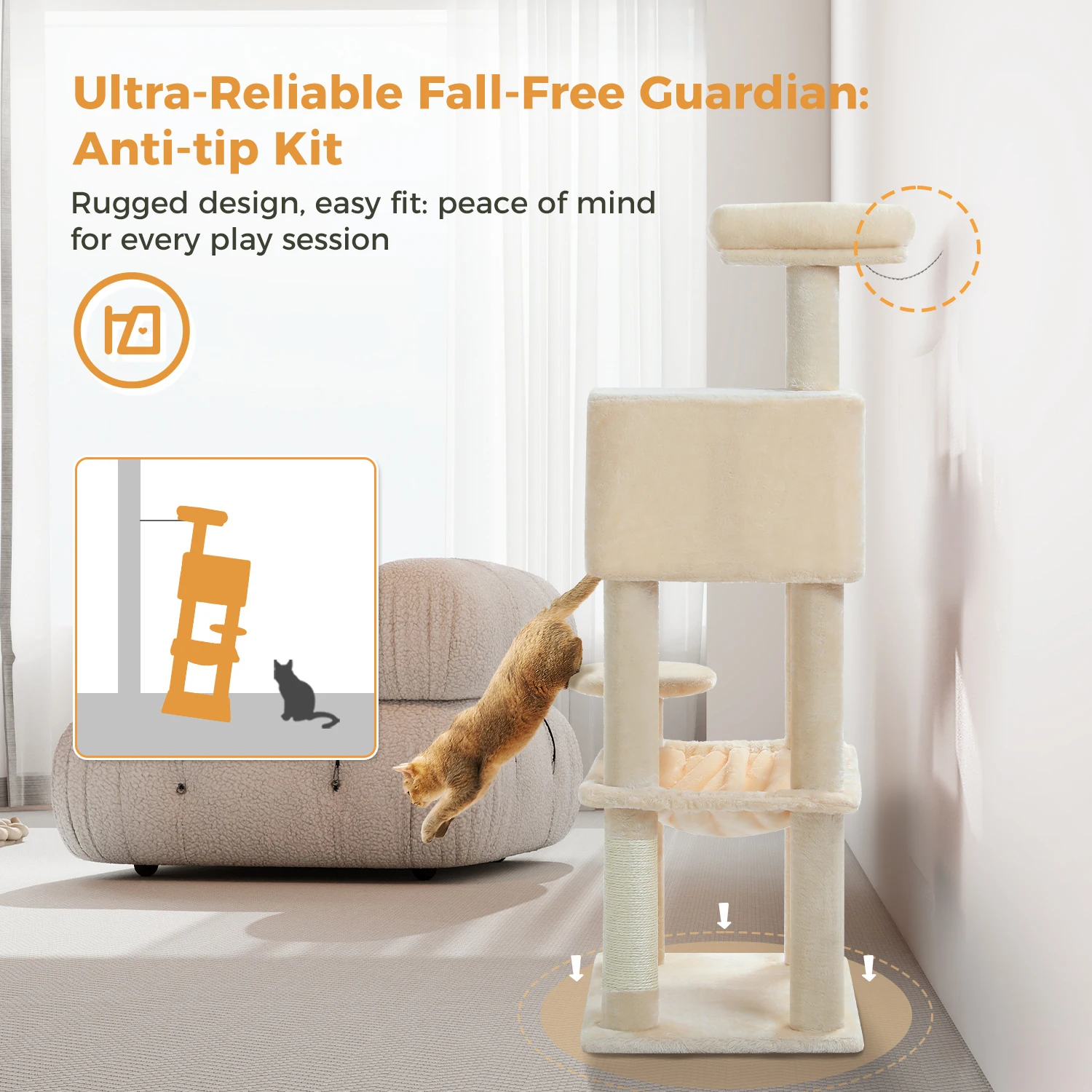 Espacio de exploración de varios niveles: El diseño de 5 niveles (113 cm de alto) ofrece un amplio espacio vertical para que los gatos trepen, salten y percan, satisfaciendo su instinto natural para explorar y investigar su entorno desde puntos de alta venta como la percha superior.Esta estructura en capas fomenta la actividad física, ayudando a los gatos de interior a mantenerse activos y a mantener un peso saludable mientras navegan entre diferentes niveles durante todo el día.Diseño seguro y estable: Viene con un kit antivuelco para garantizar que el árbol para gatos permanezca seguro en su lugar, incluso cuando los gatos enérgicos trepen o saltan, lo que lo convierte en una opción confiable para uso en interiores.El kit incluye herrajes que ancla el árbol a una pared, eliminando el riesgo de que se vuelque durante el juego vigoroso, mientras que la base estable y la estructura equilibrada añaden una capa adicional de seguridad para gatos de todos los tamaños.