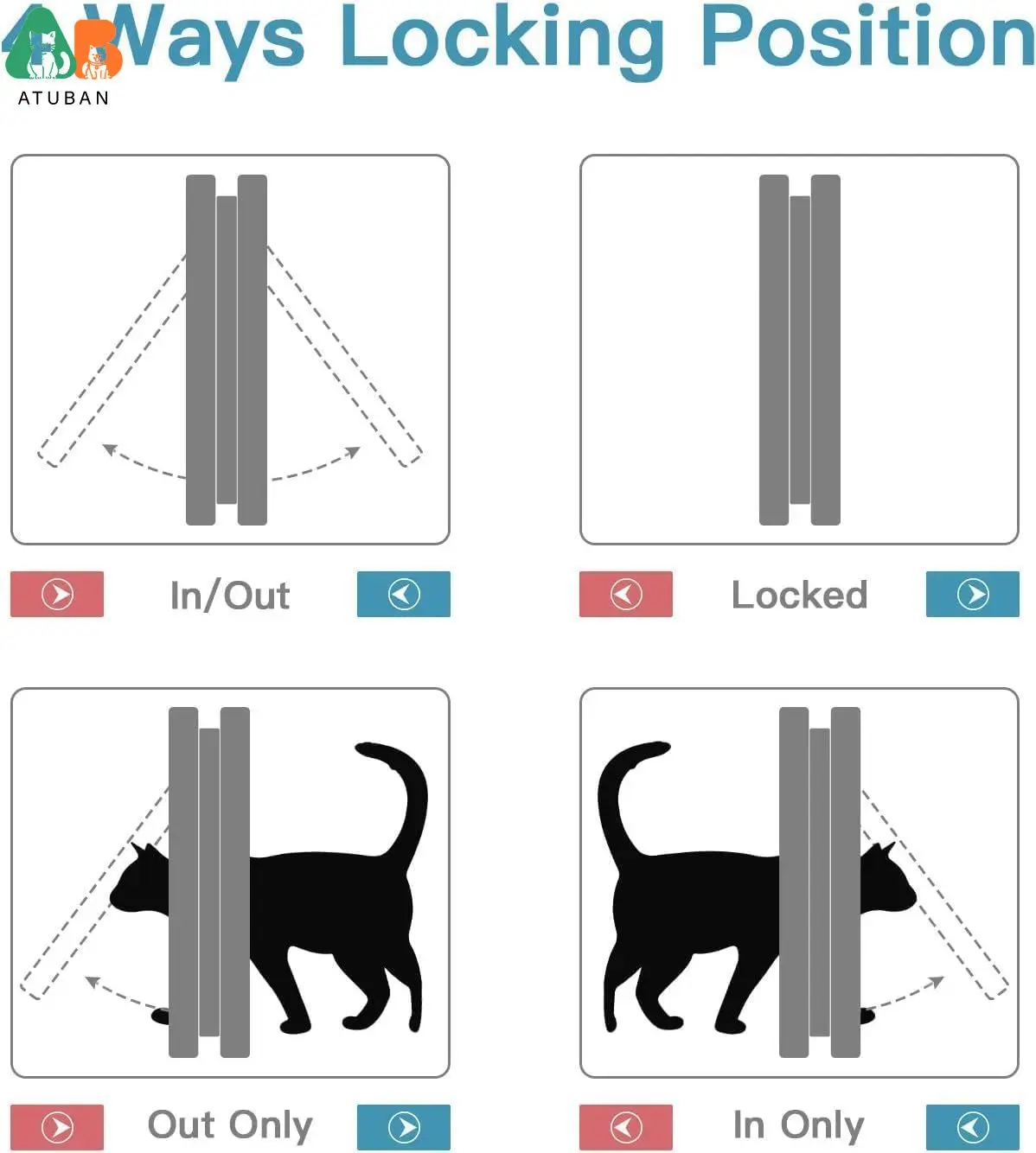 Más seguro con 4 modos de bloqueo: al deslizar los interruptores, puede ajustar el modo de acceso a entrada y salida libres, completamente bloqueado, solo salida, solo entrada, controlar el acceso de su mascota y mantener alejados a los animales callejeros.